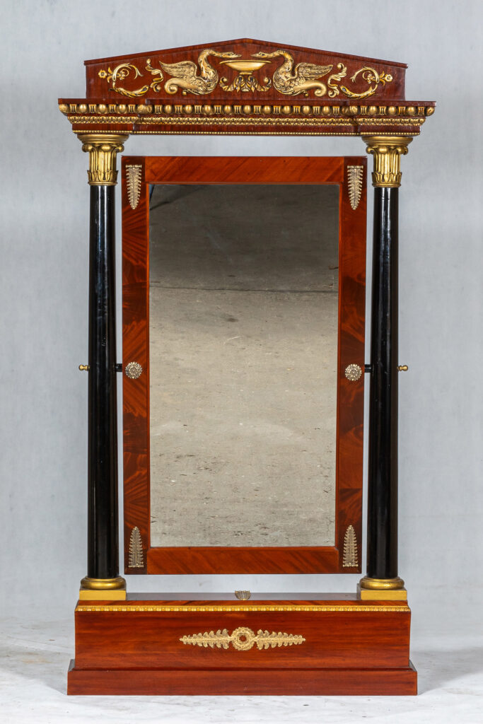 An Empire mirror is monumental in scale, severe in its geometry, and entirely uninterested in domestic warmth. The frames rely on broad flat surfaces in dark mahogany, heavy carved columns or caryatids at the sides, and ormolu mounts of deliberate symbolic content. Napoleonic eagles appear at the crest. Egyptian sphinxes, referencing the campaigns in Egypt, flank the glass. Laurel wreaths of victory, the letter N, and classical deities complete a visual program that leaves no room for ambiguity about what the mirror is meant to communicate.