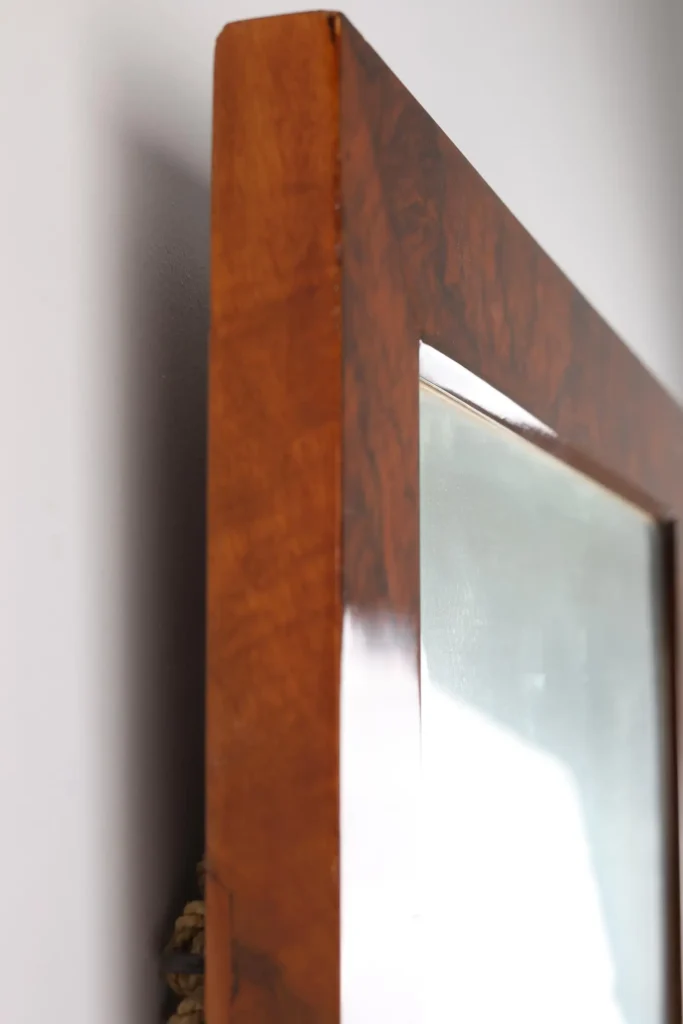 Biedermeier mirrors are built from native fruitwoods, cherry, walnut, birch, and pear, selected for the figure and warmth of their grain rather than for prestige. The book-matching technique, applied to the veneer panels of the frame, makes the wood grain itself the primary decorative element. Heavy ormolu mounts are entirely absent. Where contrast is needed, ebonized wooden columns or thin black inlay lines provide a geometric counterpoint to the pale veneer without any applied metal.