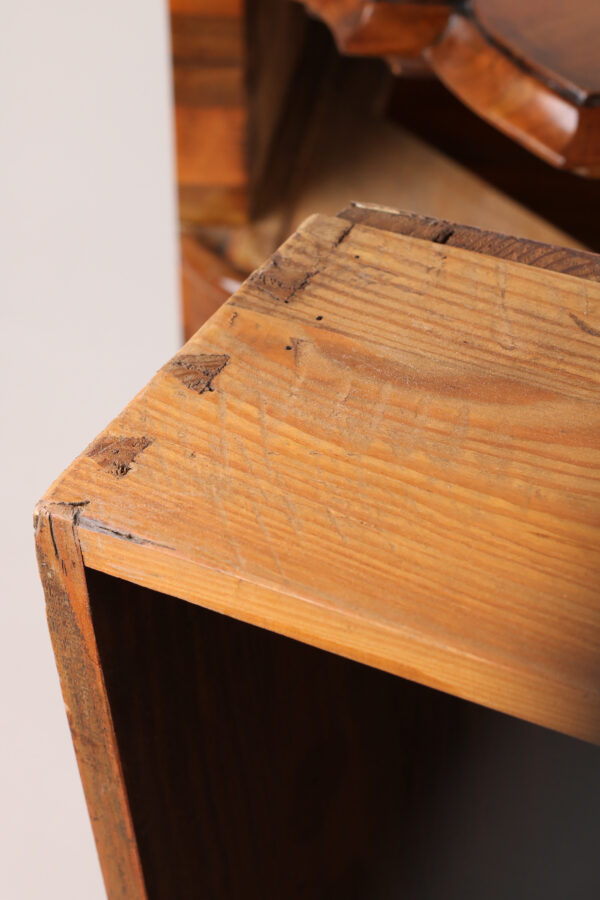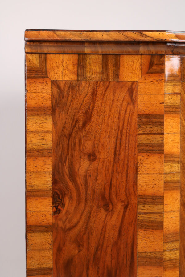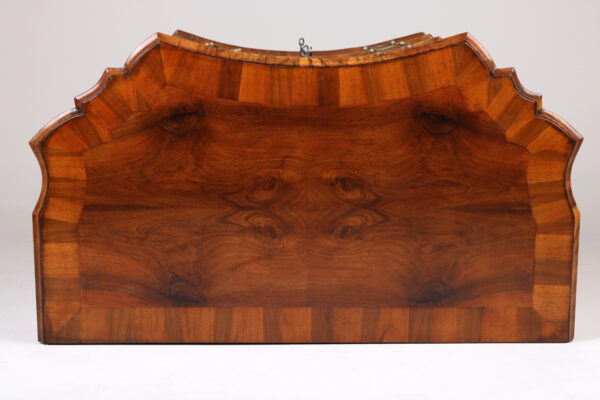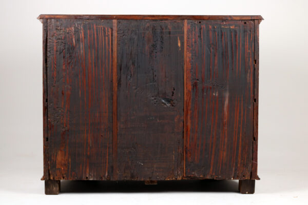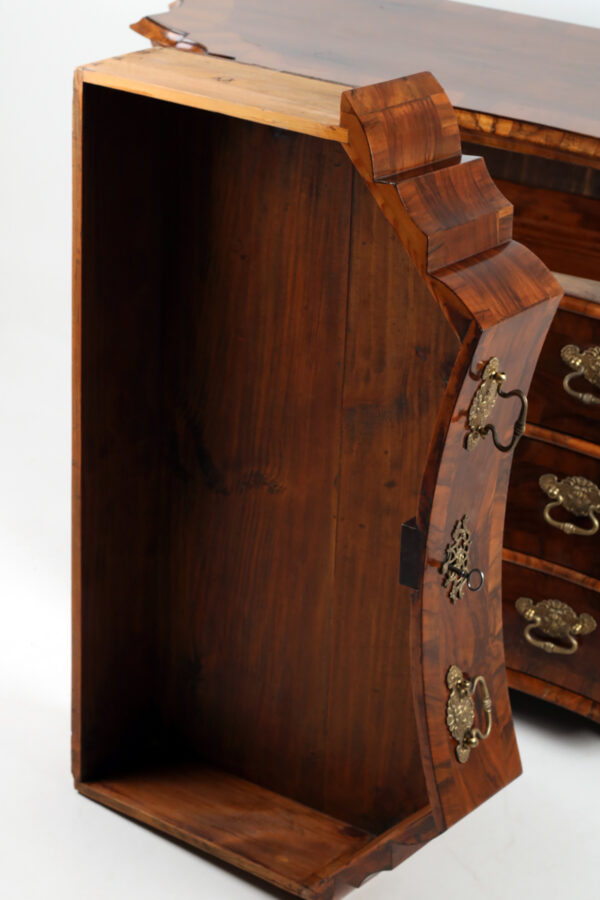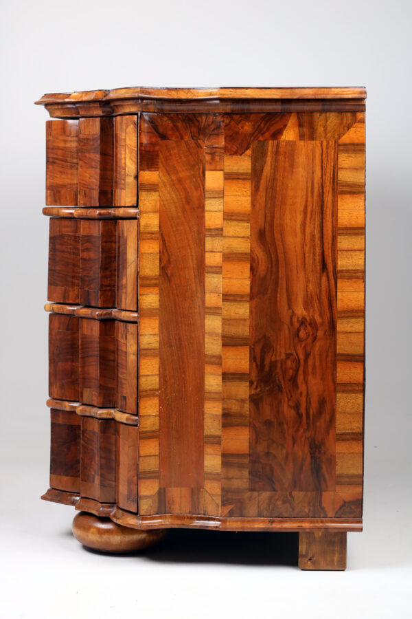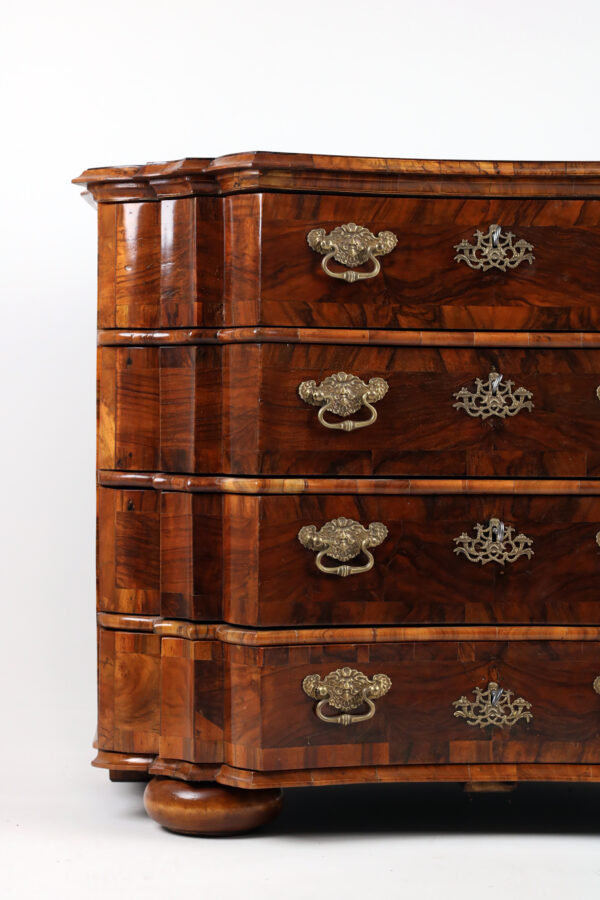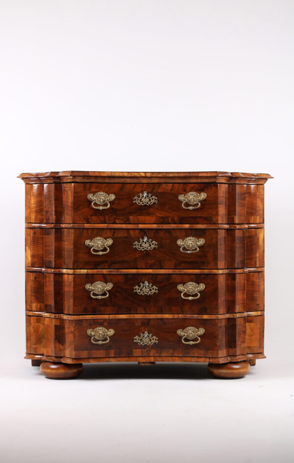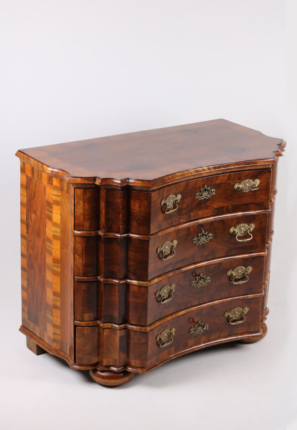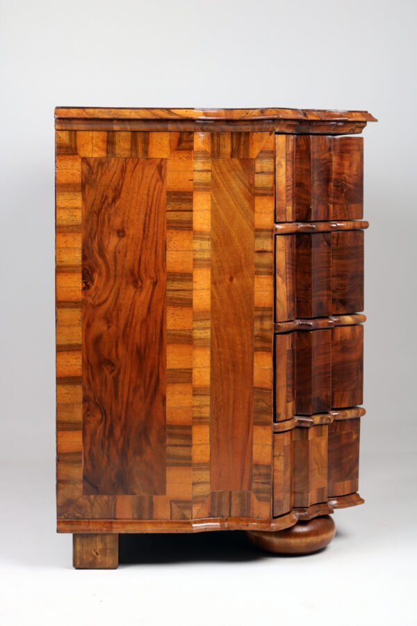 Rare original chest of drawers from the 2nd half of the 18th century, strongly curved top plate, with cross joint, double curved drawers, with original fittings, box locks, 4 keys, strongly wavy side walls, we see a very special shape here, origin probably Rhineland, carefully restored and hand-polished with shellac. Body rests on crushed ball feet.