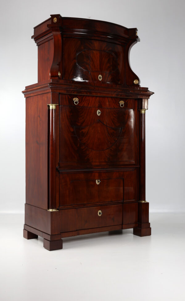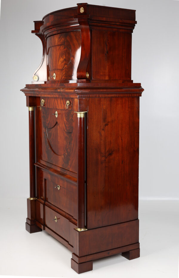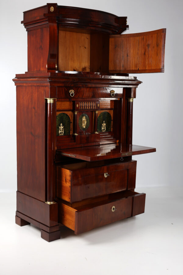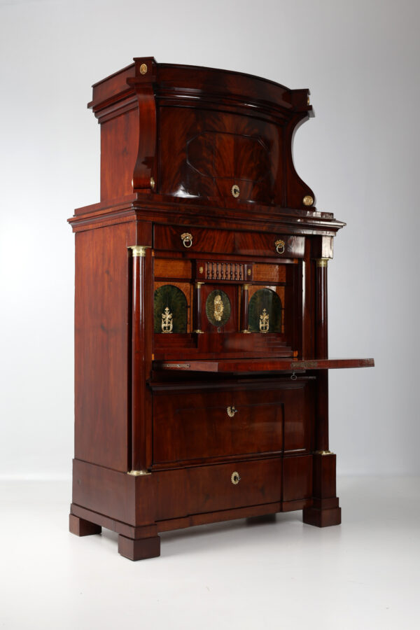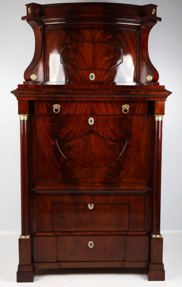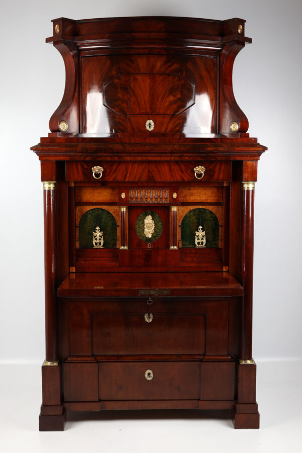 Biedermeier secretary made of mahogany around 1815. A unique piece of furniture with antique charm. The secretary has a width of 111 cm, a depth of 60 cm and a height of 199 cm. The material is high quality mahogany and the color is reddish brown. Perfect for collectors and antique lovers. A beautiful piece of furniture for living rooms, libraries or offices. Single-door attachment, cornice strip with gable, door with panel, lockable, flanked by volutes, decorated with brass rosettes, following wide profile strip, flush with the attachment, underneath drawer with division and lion’s head handle, cover can be folded down to Writing, following the cabinet, above a wider drawer inlaid with a small gallery inserted, underneath a door with fittings, can be moved diagonally backwards and reveals the interior, further small columns with bases and capitals in brass, 2 more on the right and left Panels with fittings move to the back and reveal 2 hidden drawers each, lower row of stepped drawers on the right and left, another drawer in the middle. Impressive cabinet with very beautiful details. Perfect architectural structure, screaming flap with coat of arms filling, 2 more large drawers with locks, a total of 4 keys included, is crowned by the full columns in the front with bases and capitals in brass.