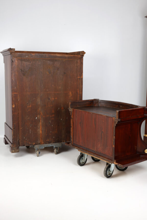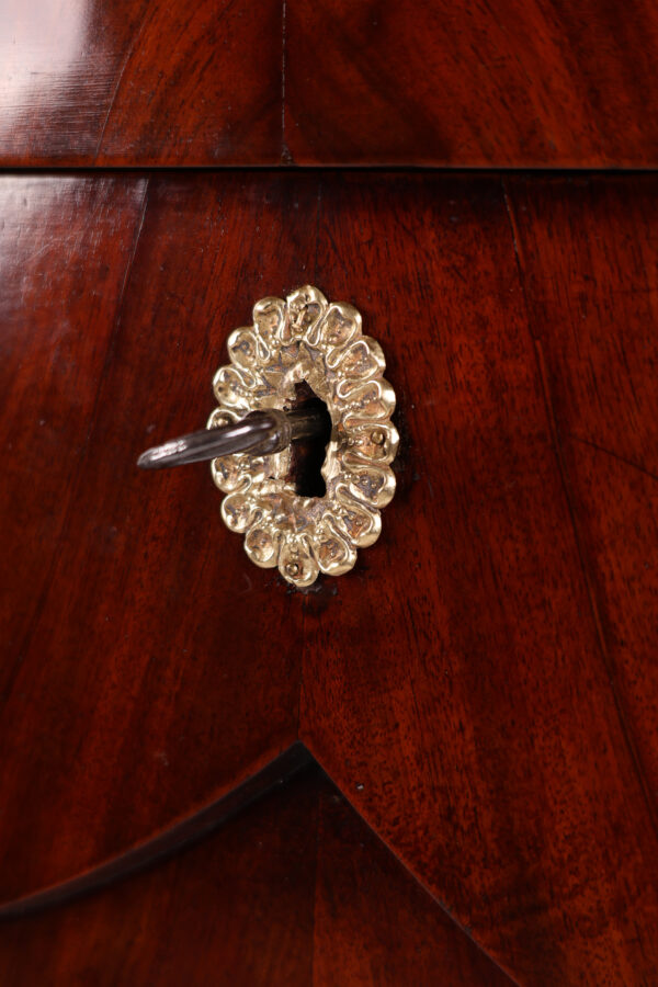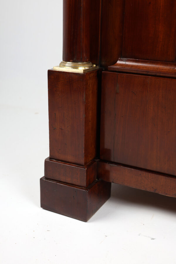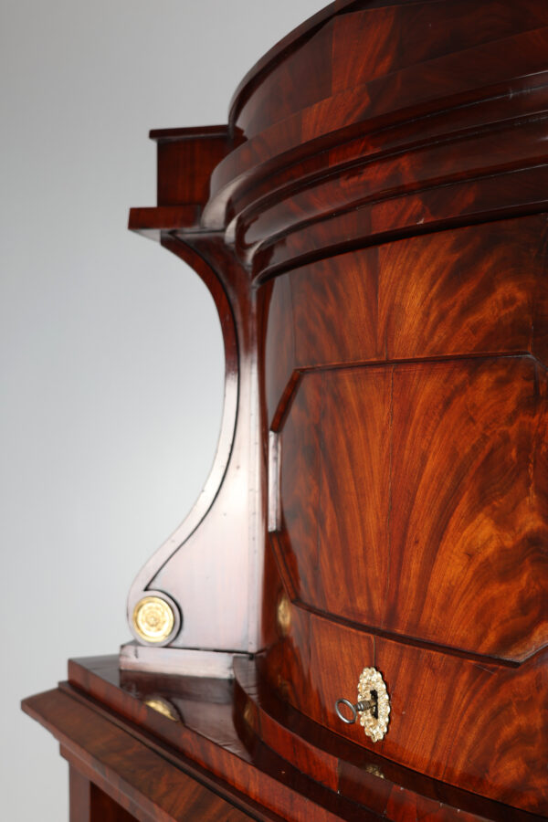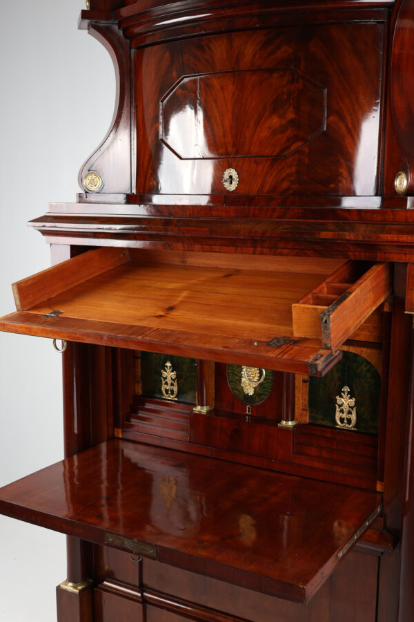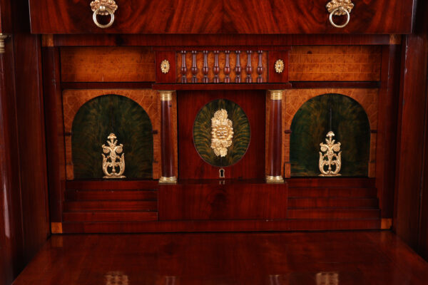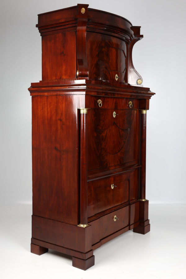 Biedermeier secretary made of mahogany around 1815. A unique piece of furniture with antique charm. The secretary has a width of 111 cm, a depth of 60 cm and a height of 199 cm. The material is high quality mahogany and the color is reddish brown. Perfect for collectors and antique lovers. A beautiful piece of furniture for living rooms, libraries or offices. Single-door attachment, cornice strip with gable, door with panel, lockable, flanked by volutes, decorated with brass rosettes, following wide profile strip, flush with the attachment, underneath drawer with division and lion’s head handle, cover can be folded down to Writing, following the cabinet, above a wider drawer inlaid with a small gallery inserted, underneath a door with fittings, can be moved diagonally backwards and reveals the interior, further small columns with bases and capitals in brass, 2 more on the right and left Panels with fittings move to the back and reveal 2 hidden drawers each, lower row of stepped drawers on the right and left, another drawer in the middle. Impressive cabinet with very beautiful details. Perfect architectural structure, screaming flap with coat of arms filling, 2 more large drawers with locks, a total of 4 keys included, is crowned by the full columns in the front with bases and capitals in brass.