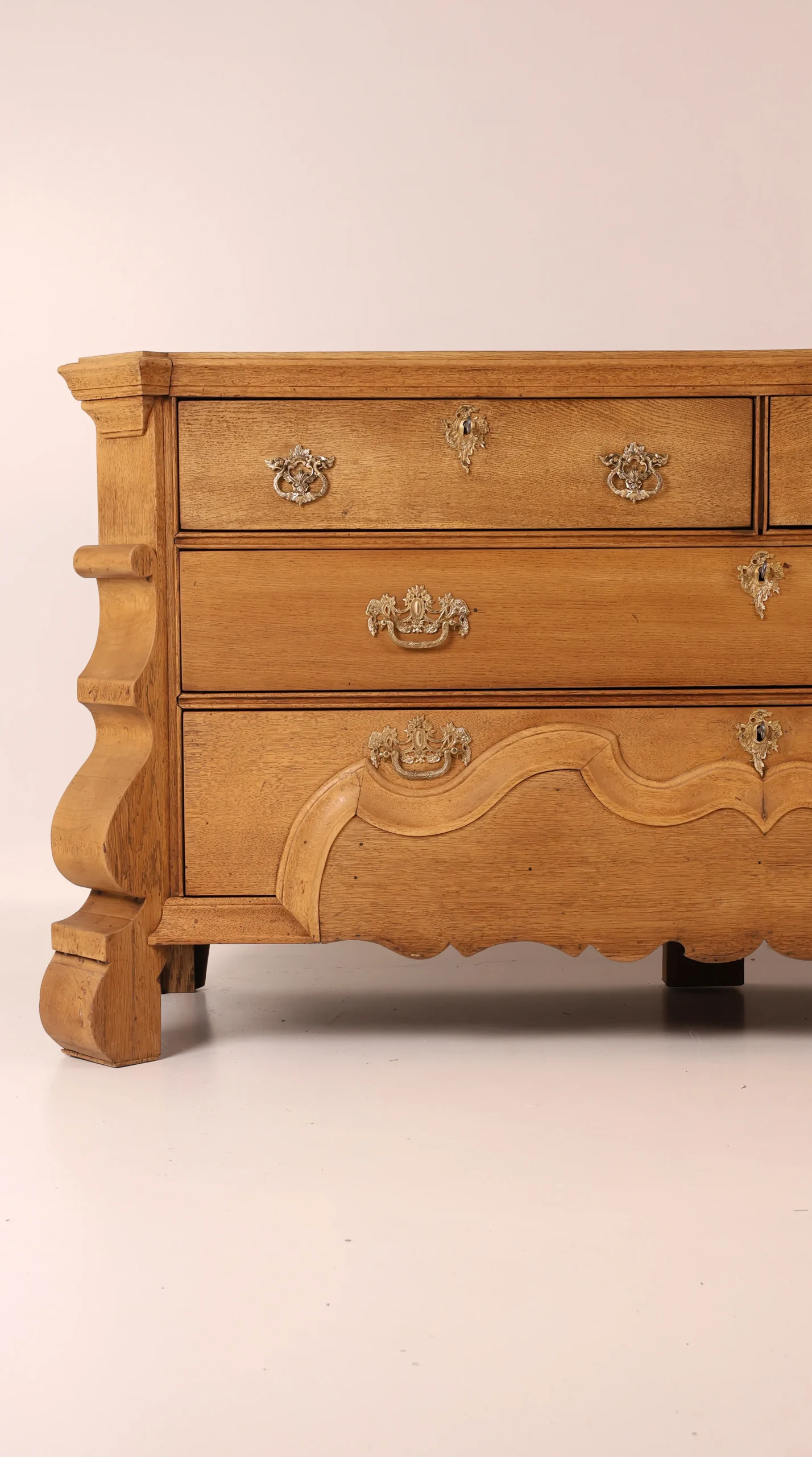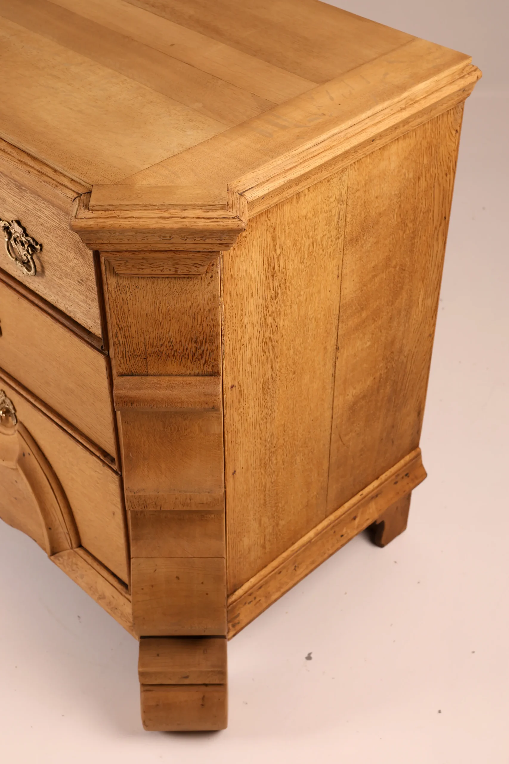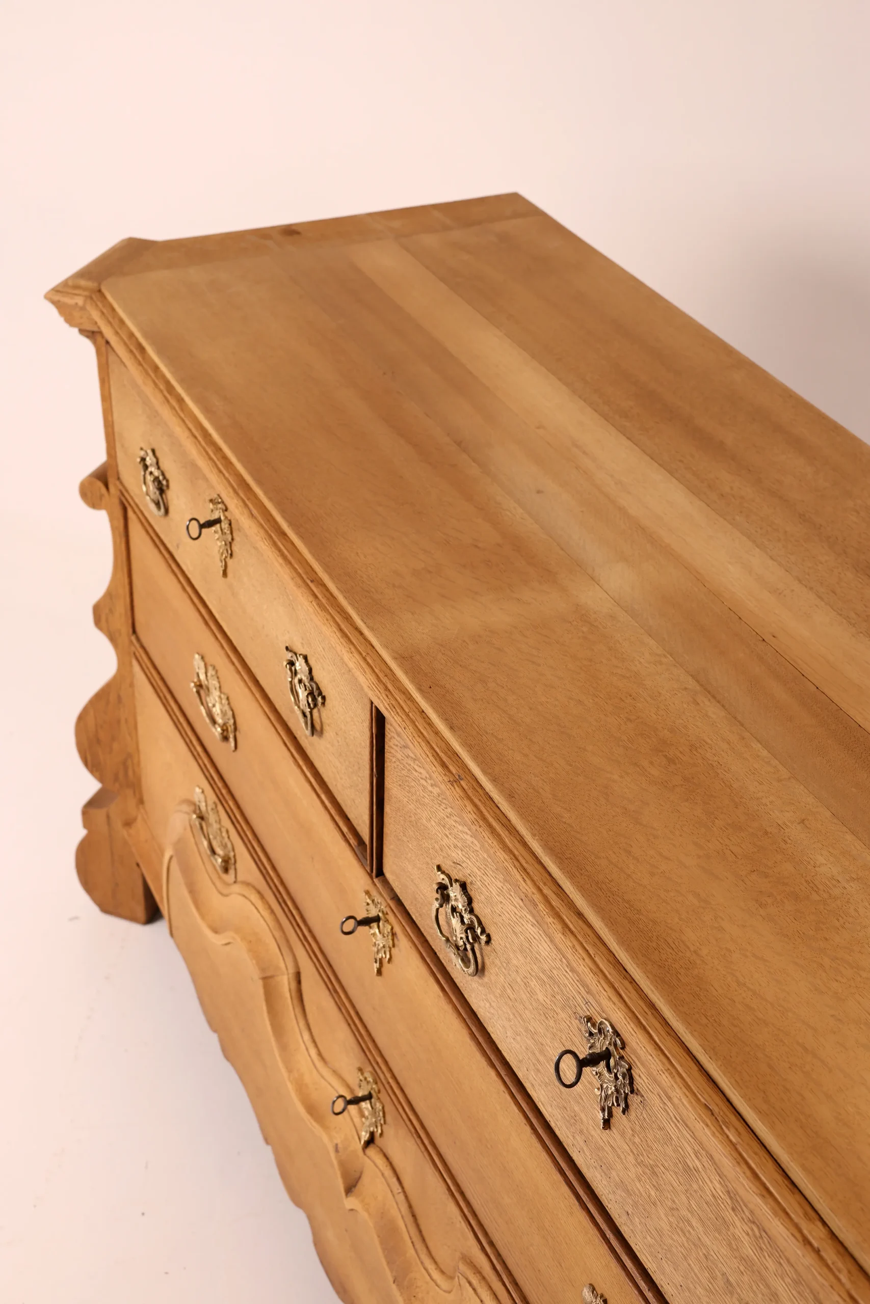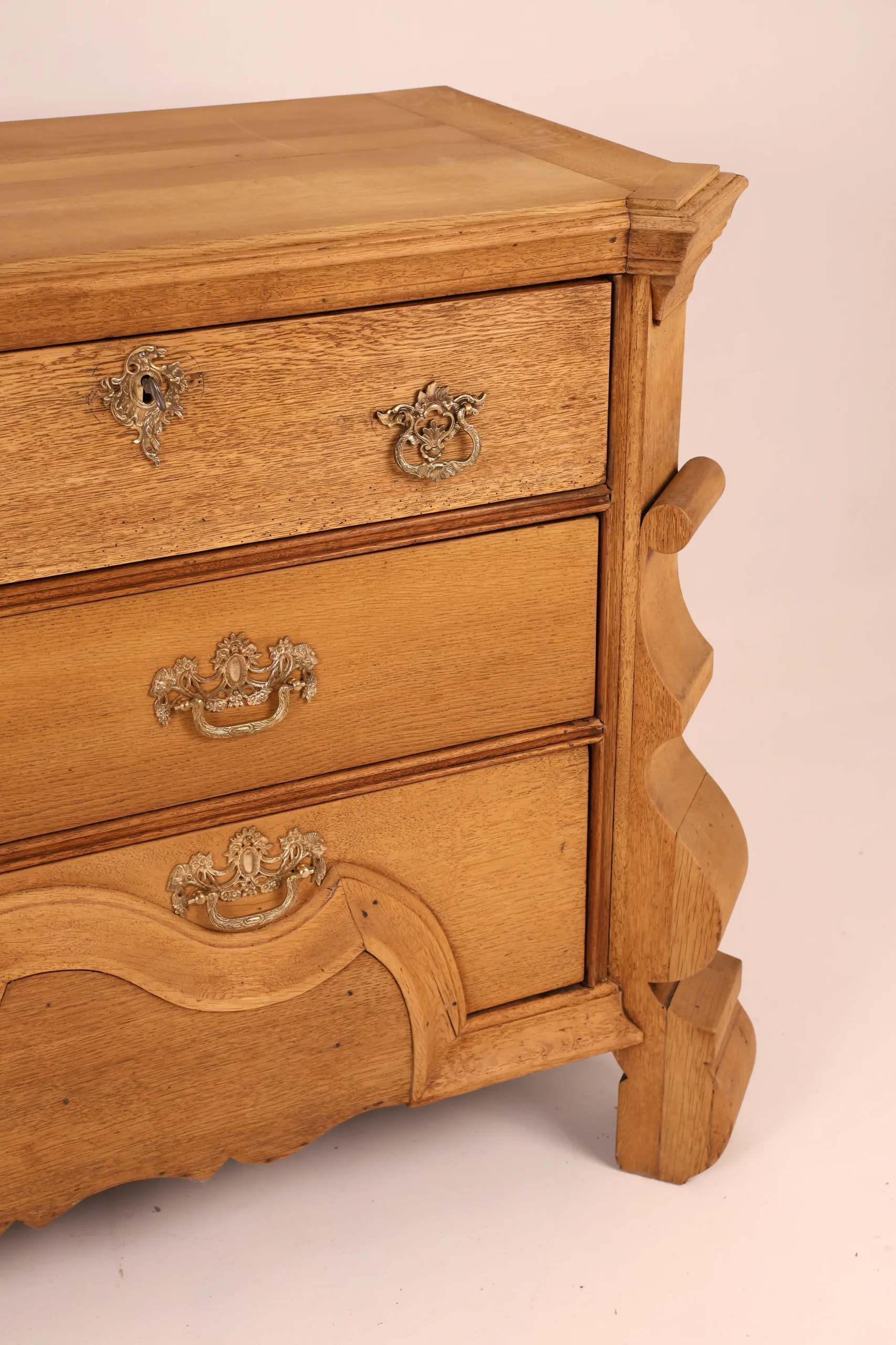 18th-century Dutch Baroque commode from the Netherlands, crafted from solid light oak with a bleached finish. The piece features a serpentine front and well-balanced proportions typical of Dutch Baroque furniture of the period.