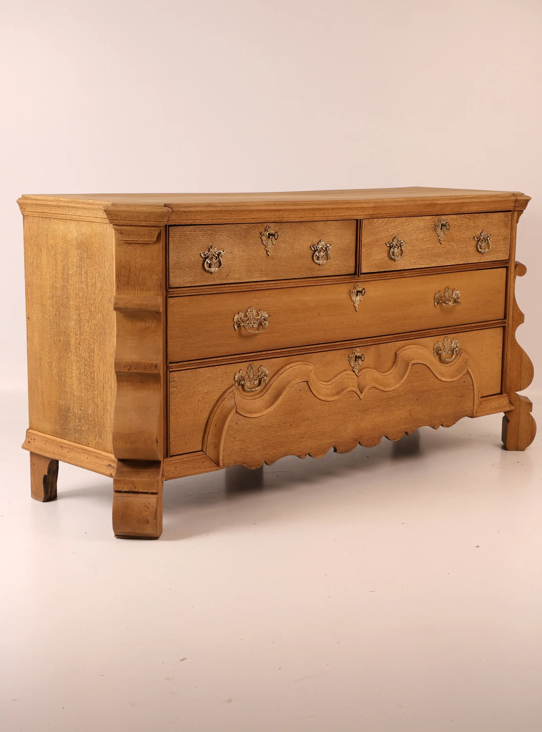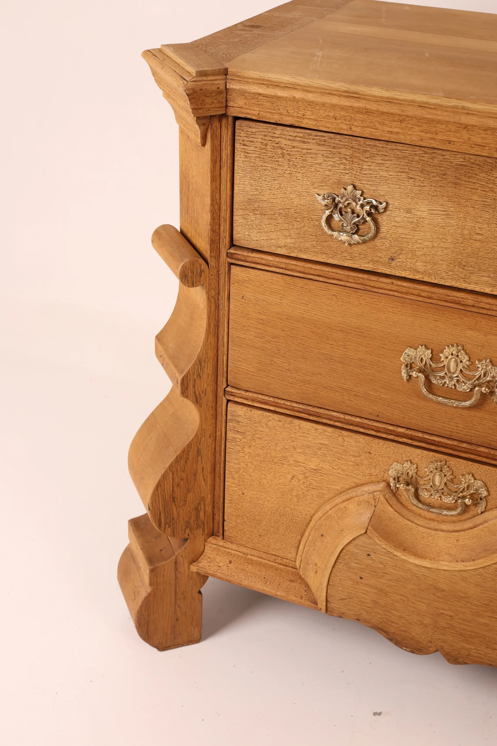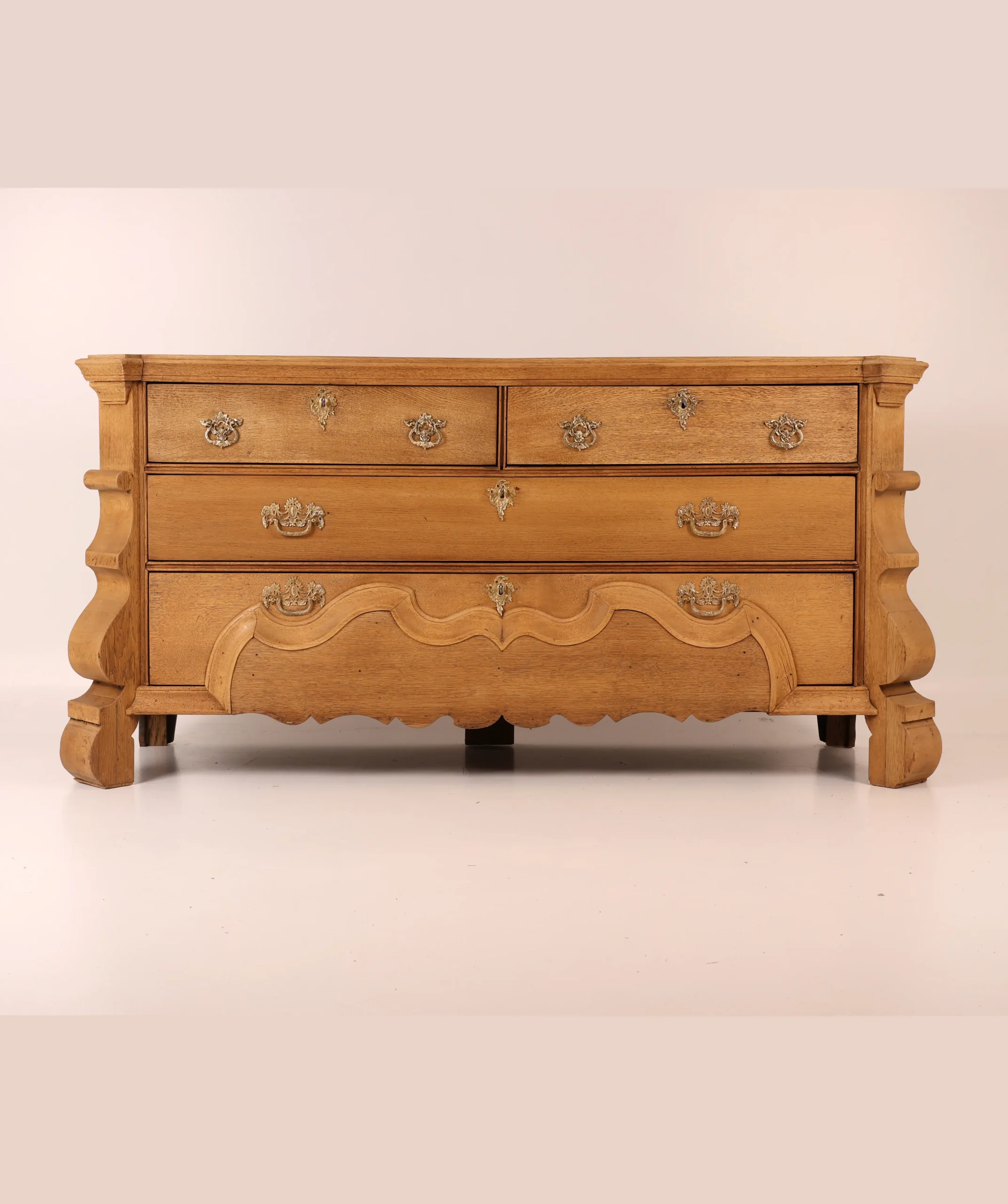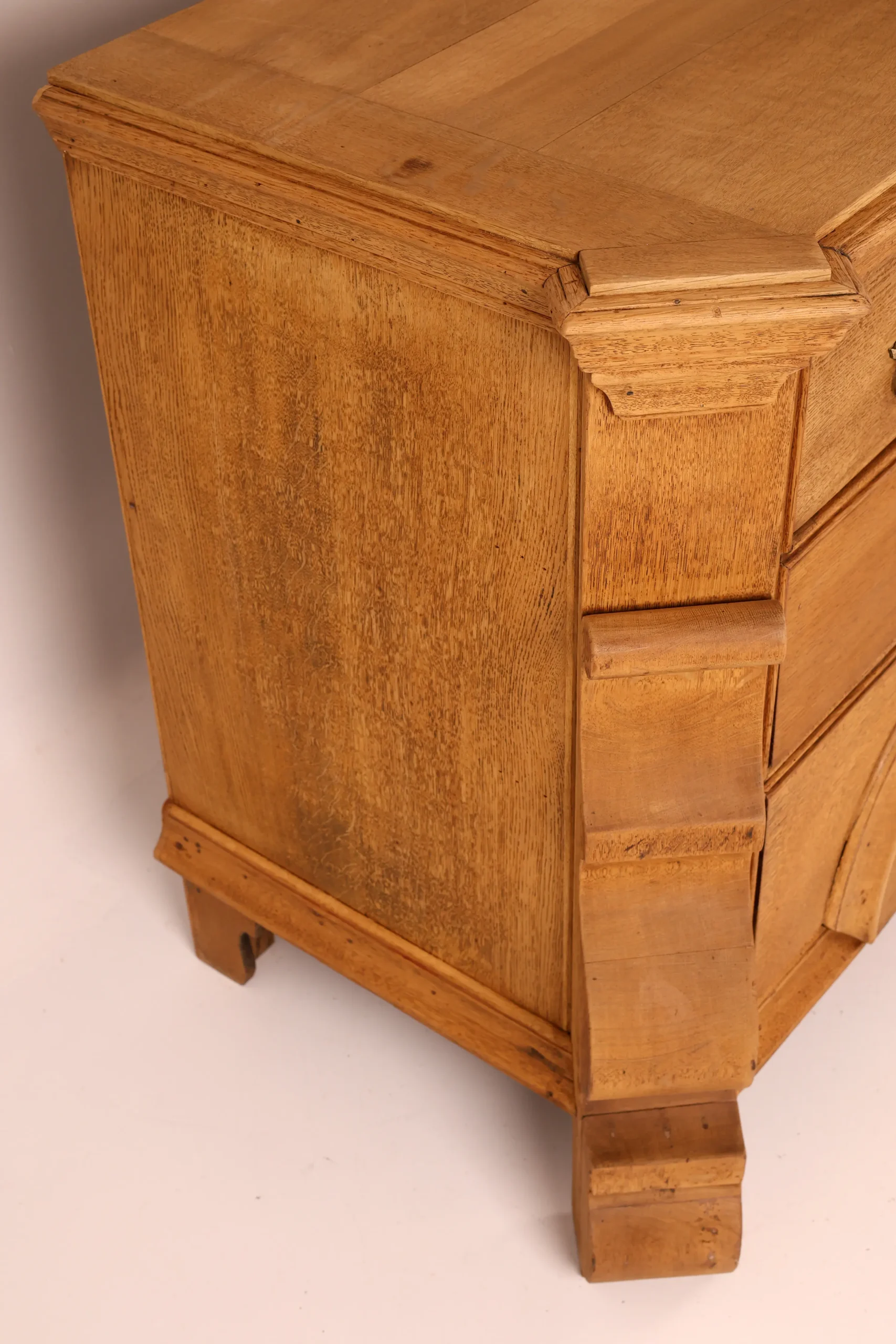 18th-century Dutch Baroque commode from the Netherlands, crafted from solid light oak with a bleached finish. The piece features a serpentine front and well-balanced proportions typical of Dutch Baroque furniture of the period.
