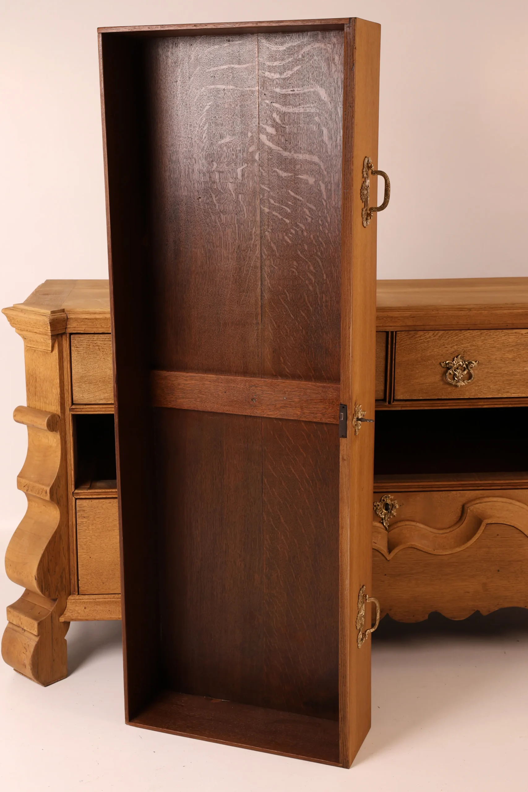 The surface is finished with a clear, colourless wax, enhancing the natural grain of the oak while providing a soft, matte sheen. Professionally restored and in very good condition, with a beautiful natural patina. Structurally sound and ready for use.