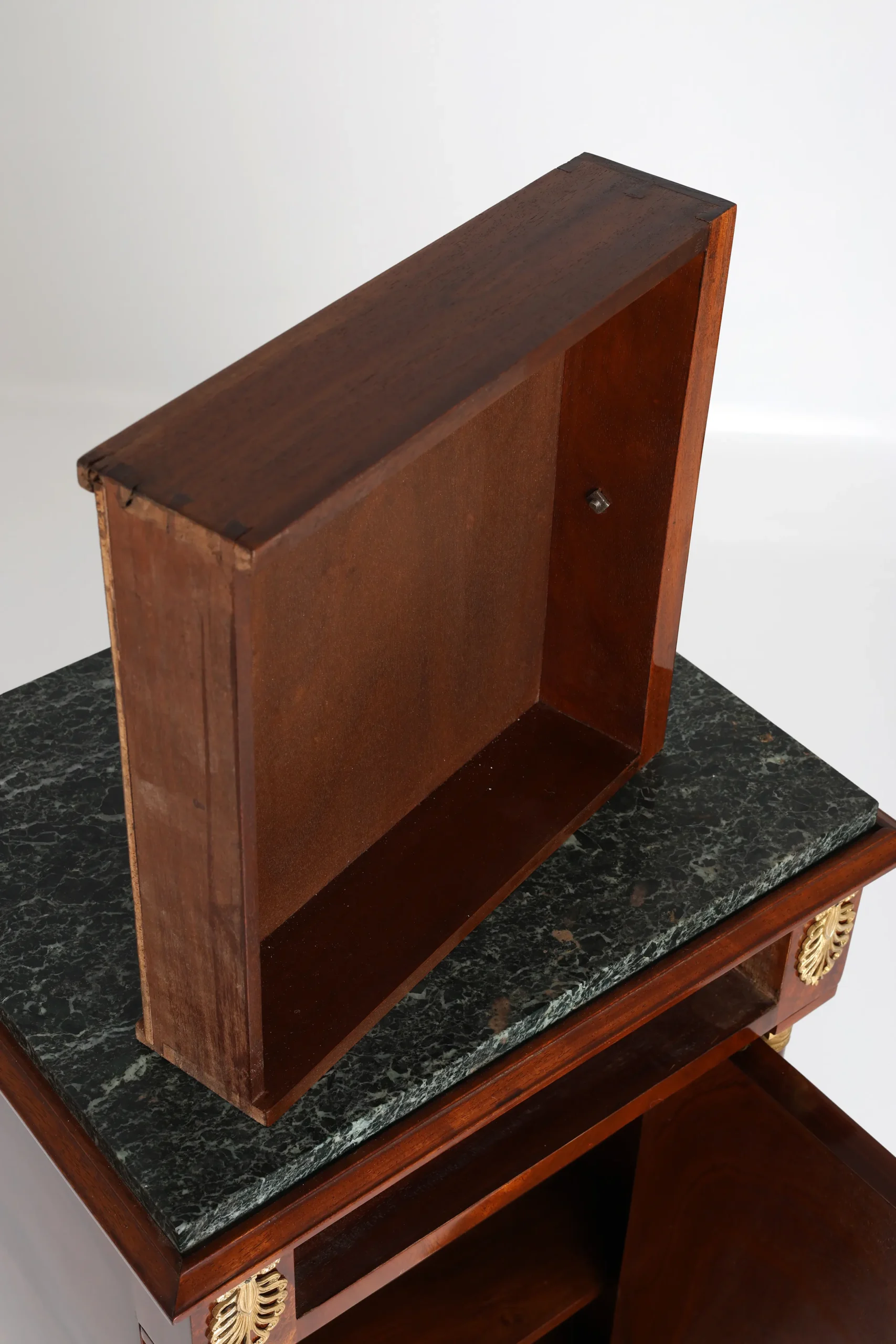 This elegant pair of French bedside cabinets reflects the enduring influence of the Empire style, reinterpreted at the end of the 19th century with exceptional craftsmanship and decorative richness.
