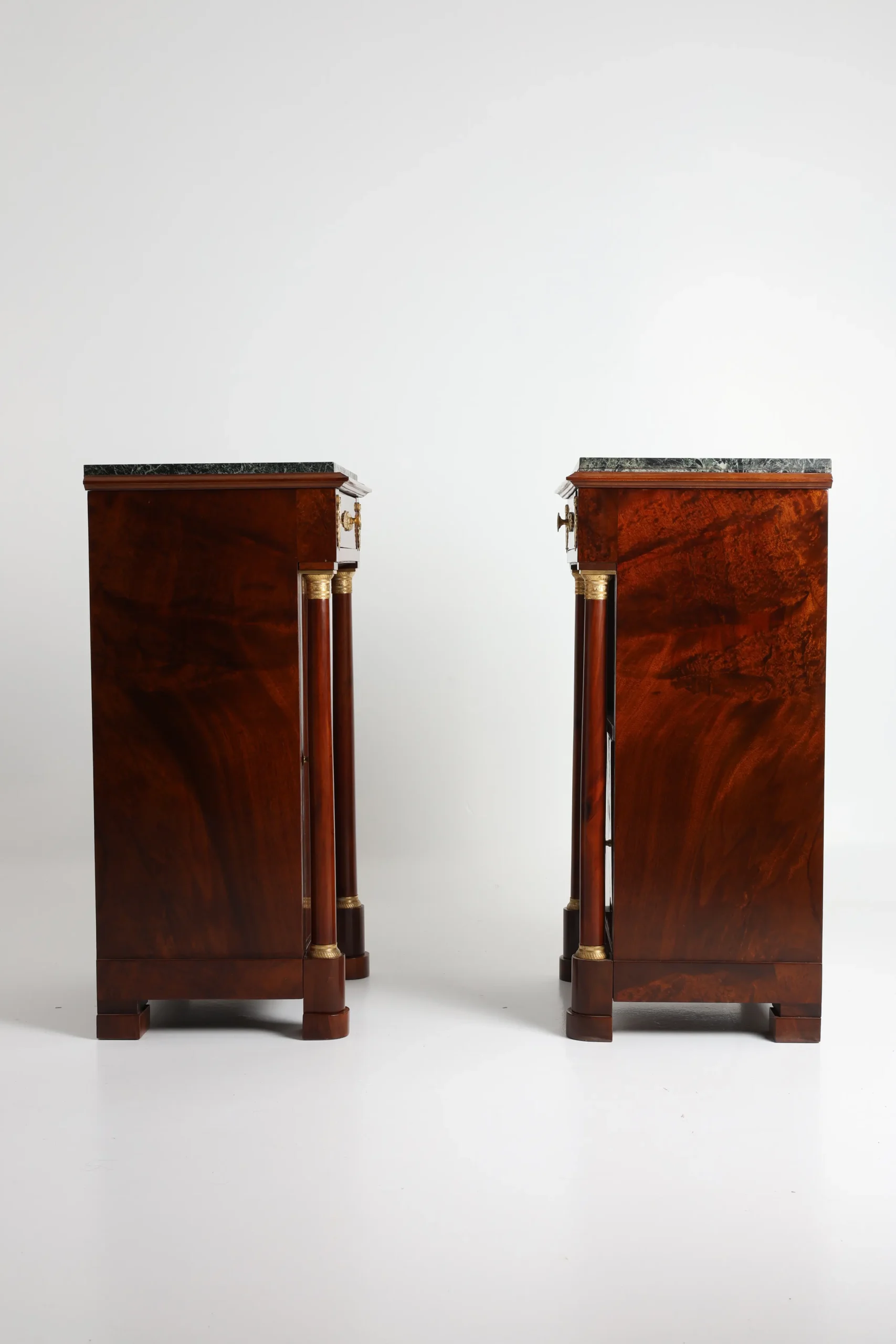 Constructed and veneered in finely figured mahogany, the cabinets present a deep, warm tone with a beautifully revived surface. Their architectural form is defined by flanking columns with gilt capitals and bases, lending a strong neoclassical presence.