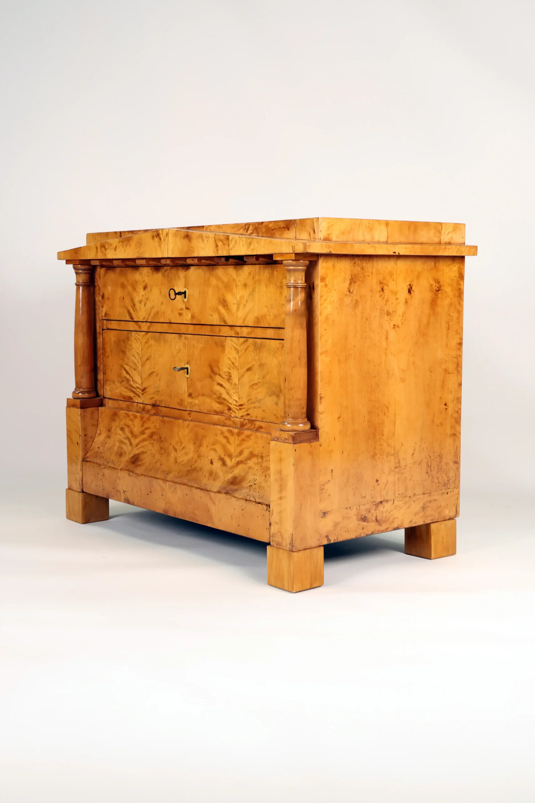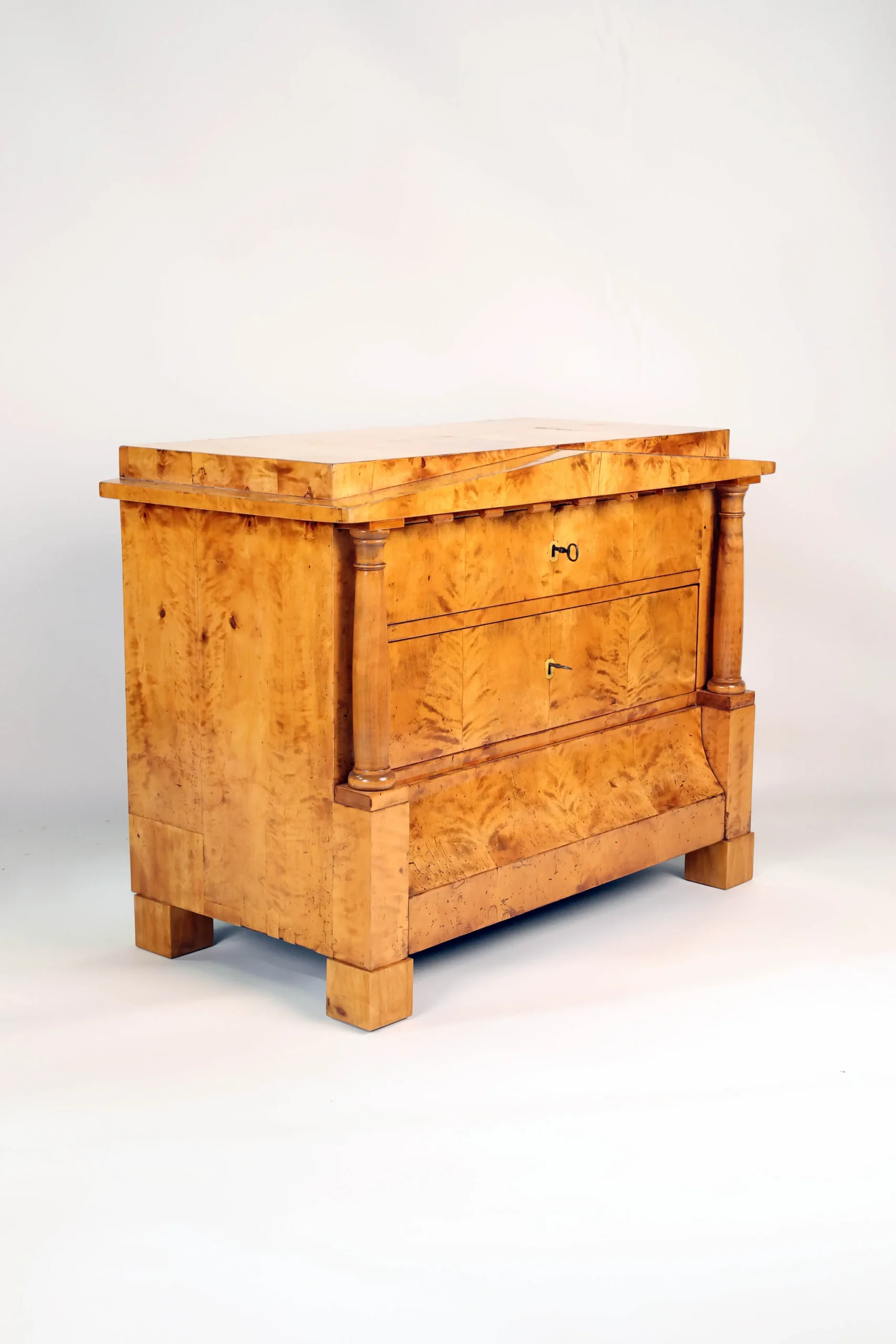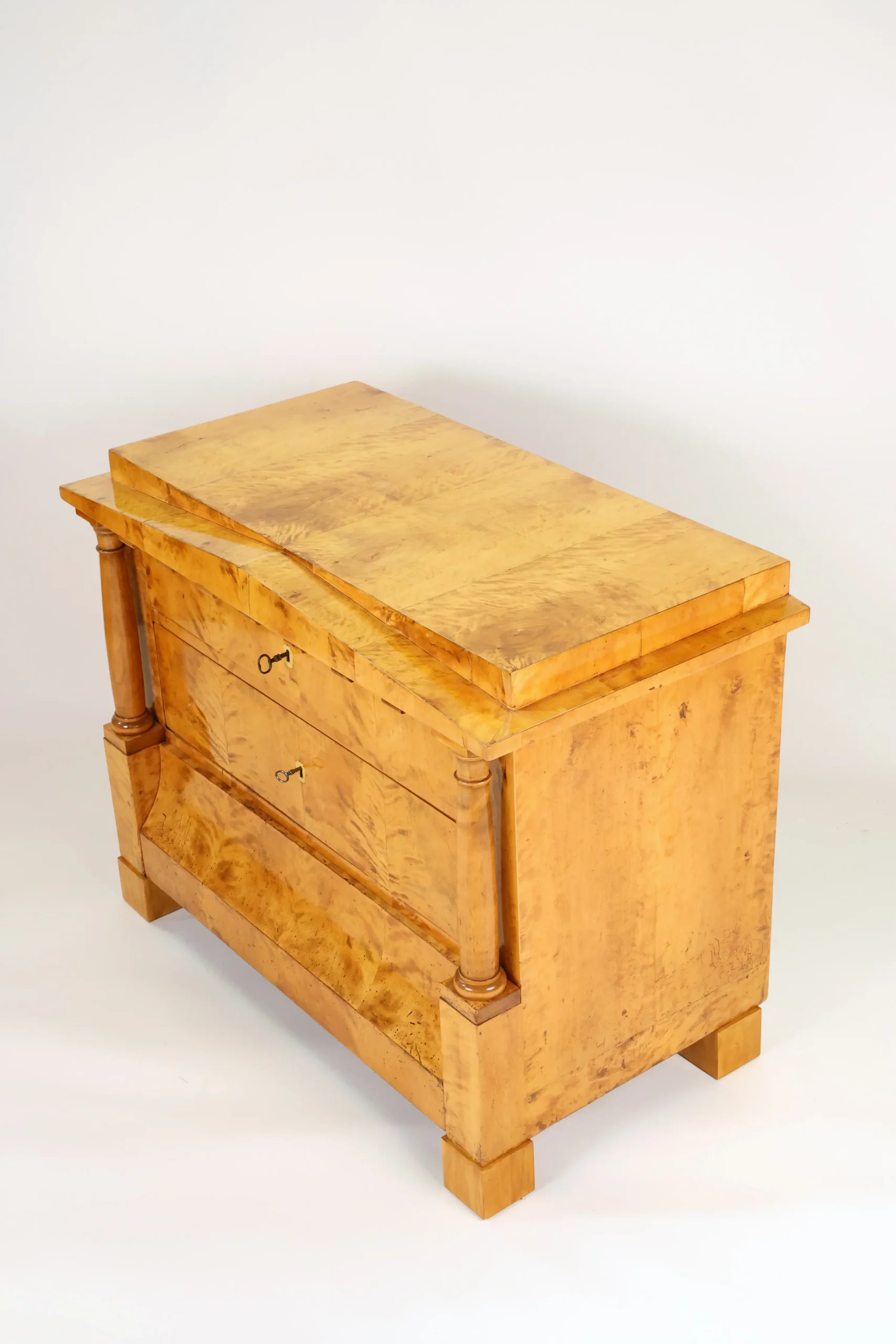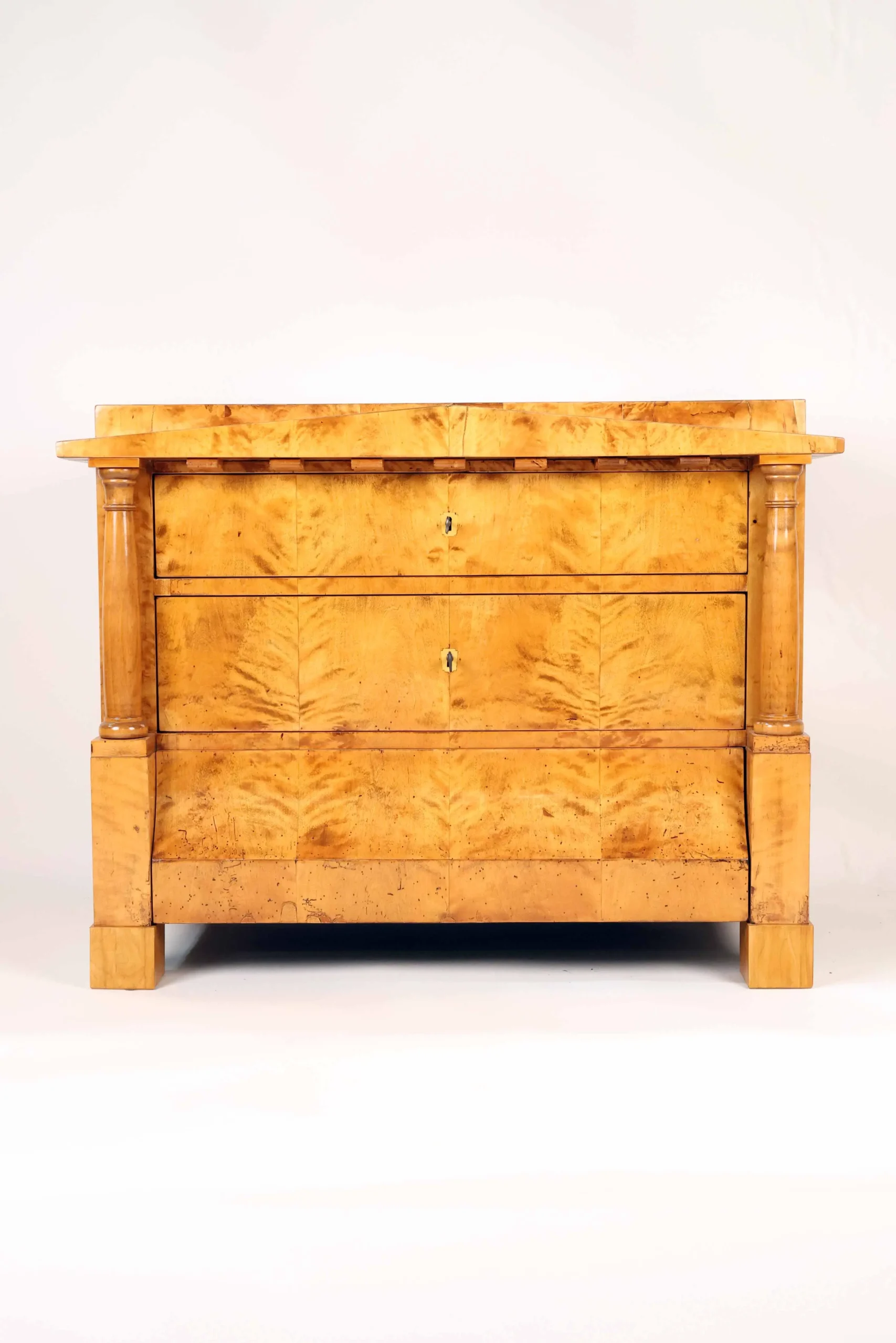 A refined Biedermeier chest of drawers crafted in beautifully figured birch, dating to around 1820 and made in Germany. The piece exemplifies the restrained elegance and architectural clarity characteristic of the Biedermeier period.