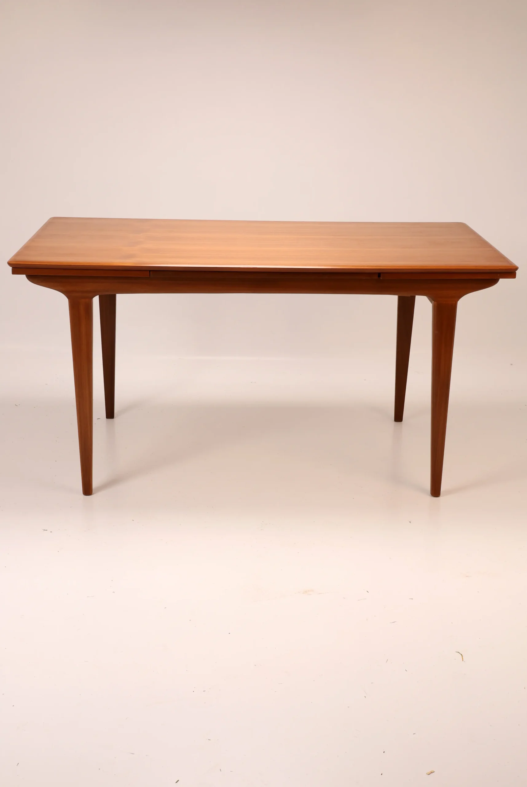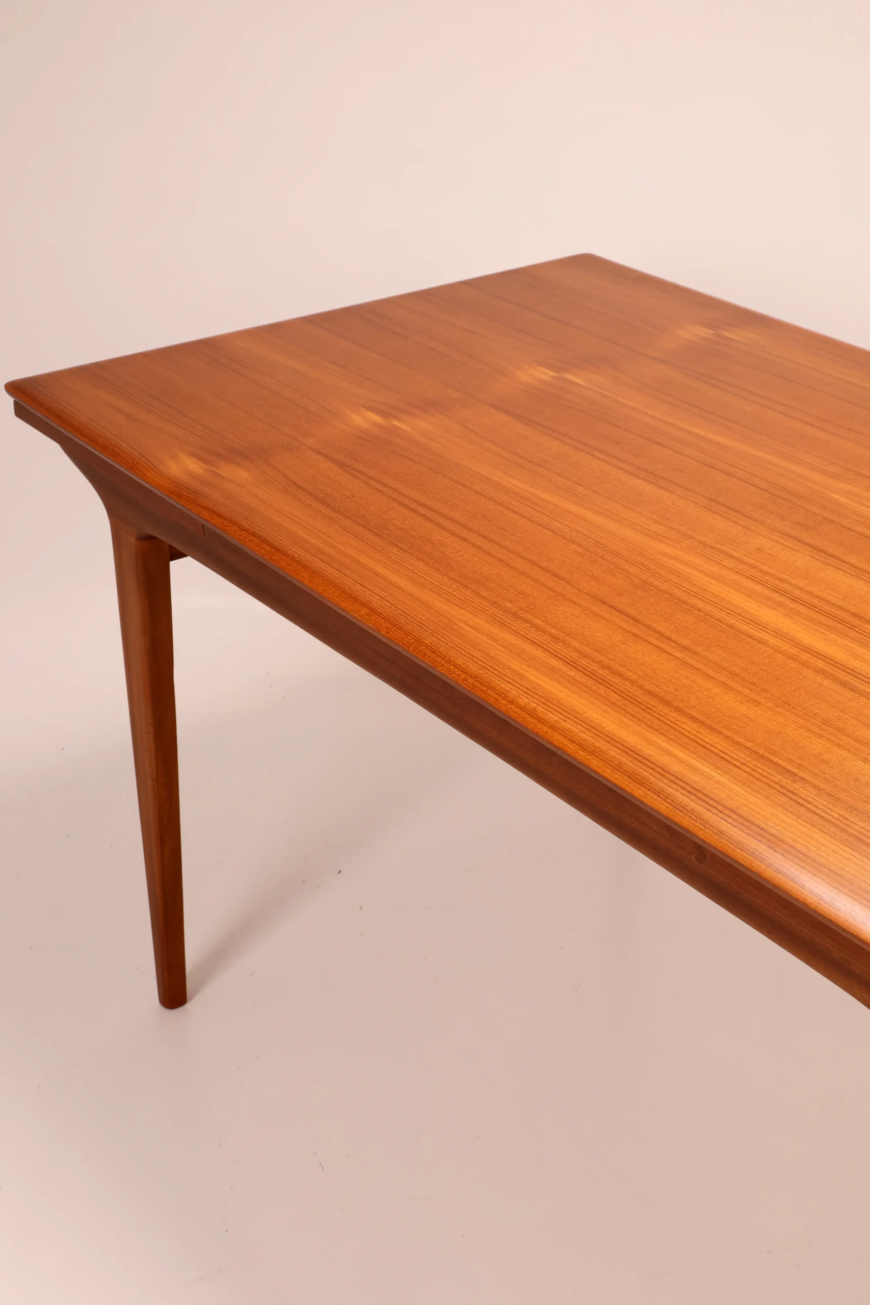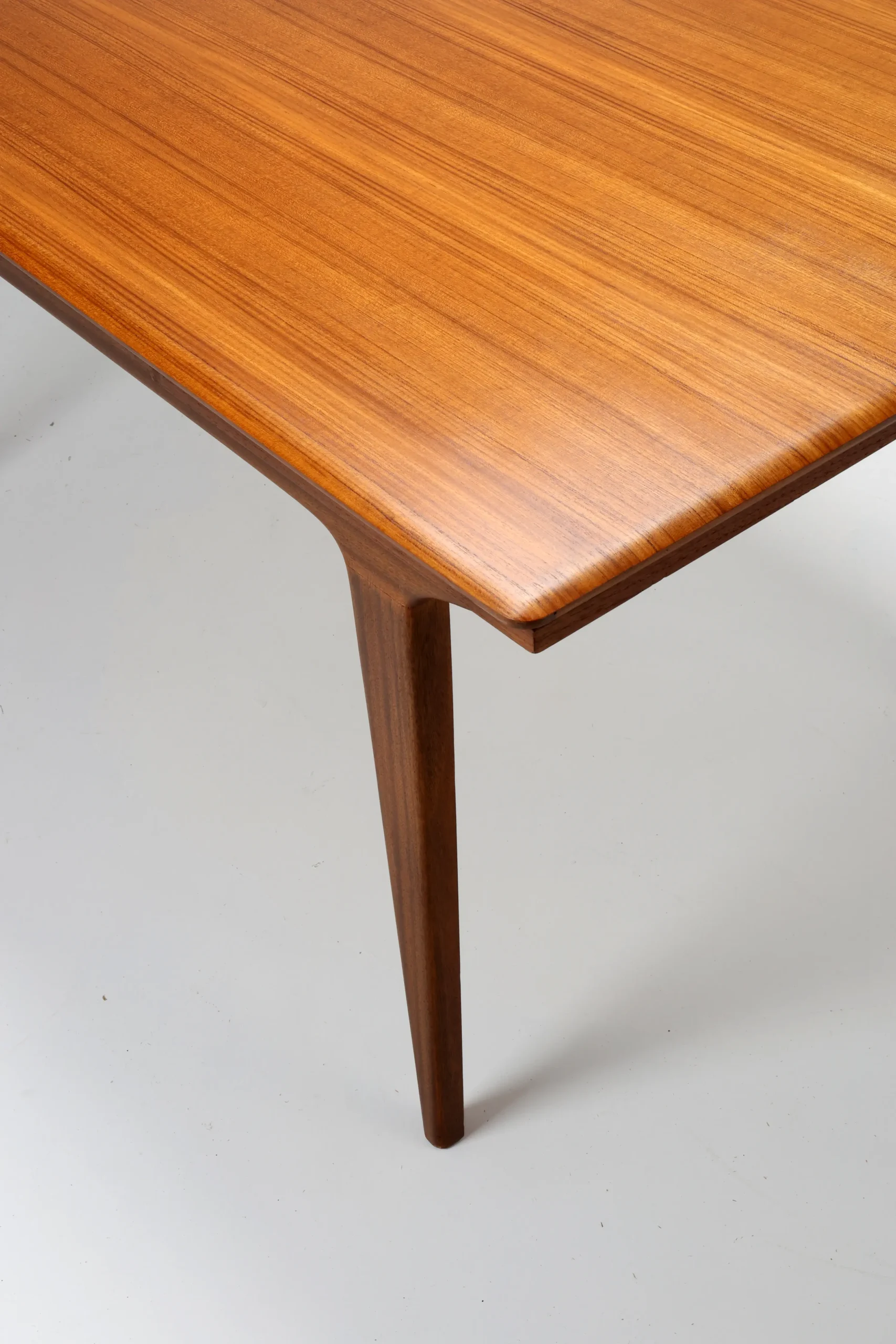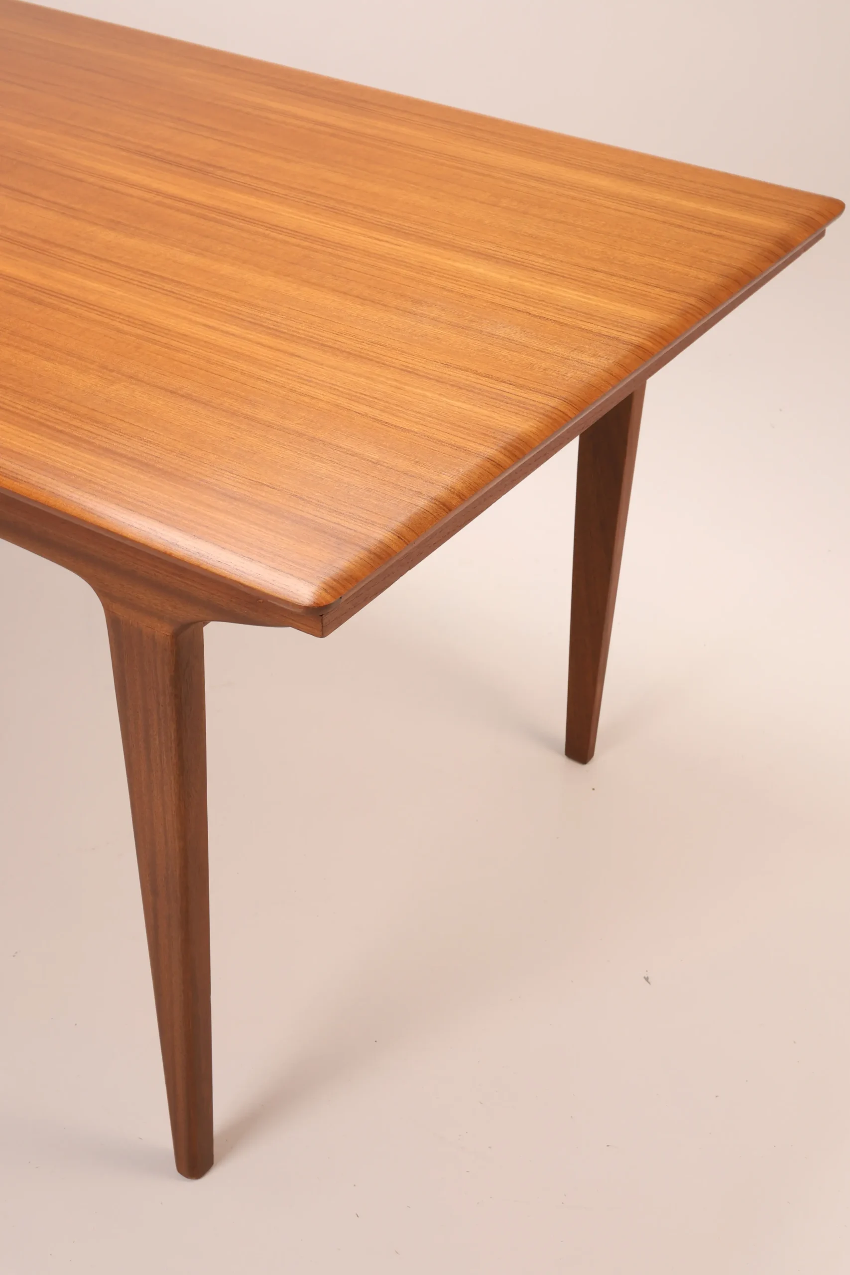 The structure is supported by slender, tapered legs, giving the table a light and elegant presence. The teak displays a warm tone and attractive natural grain, typical of high-quality Danish production of the period.