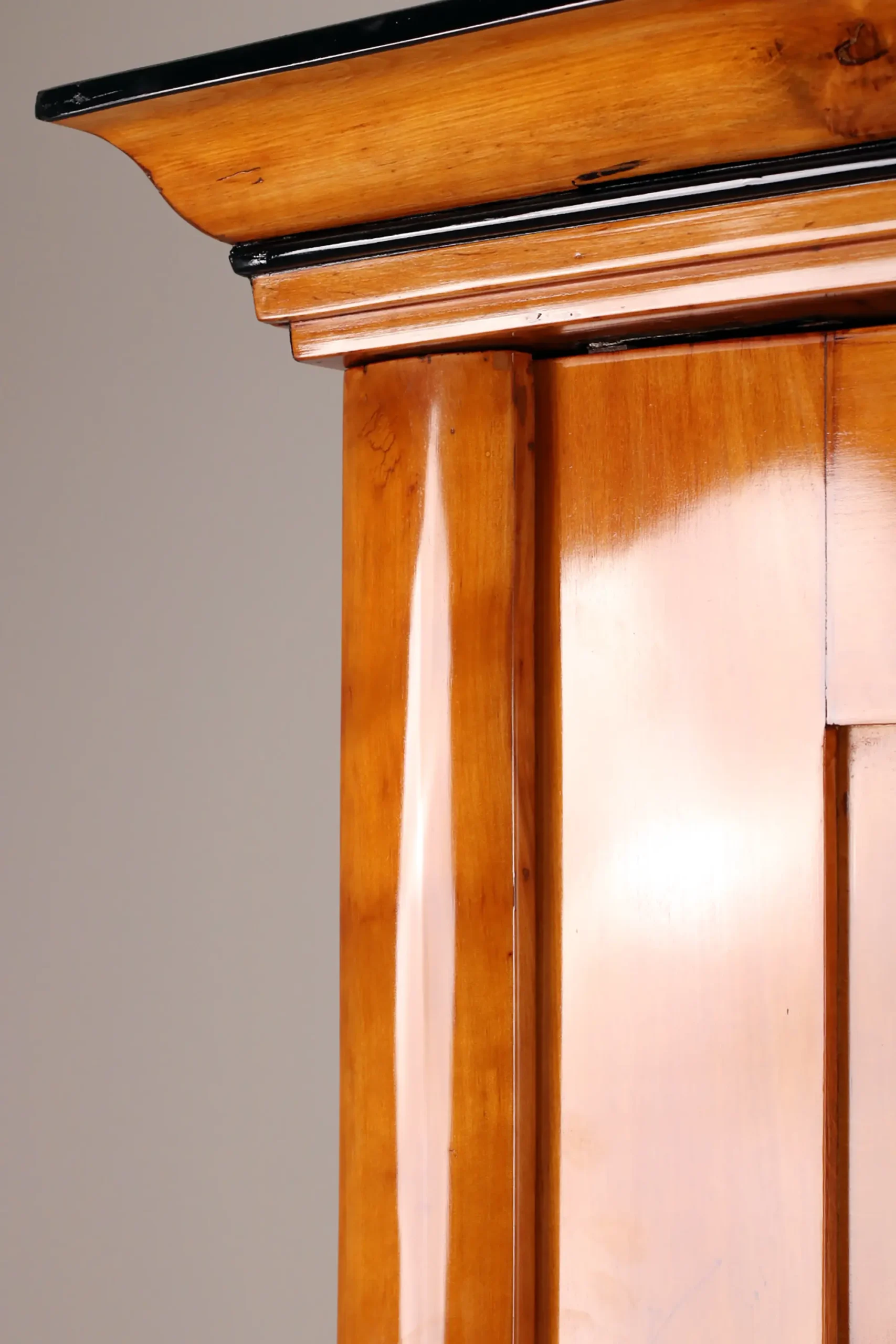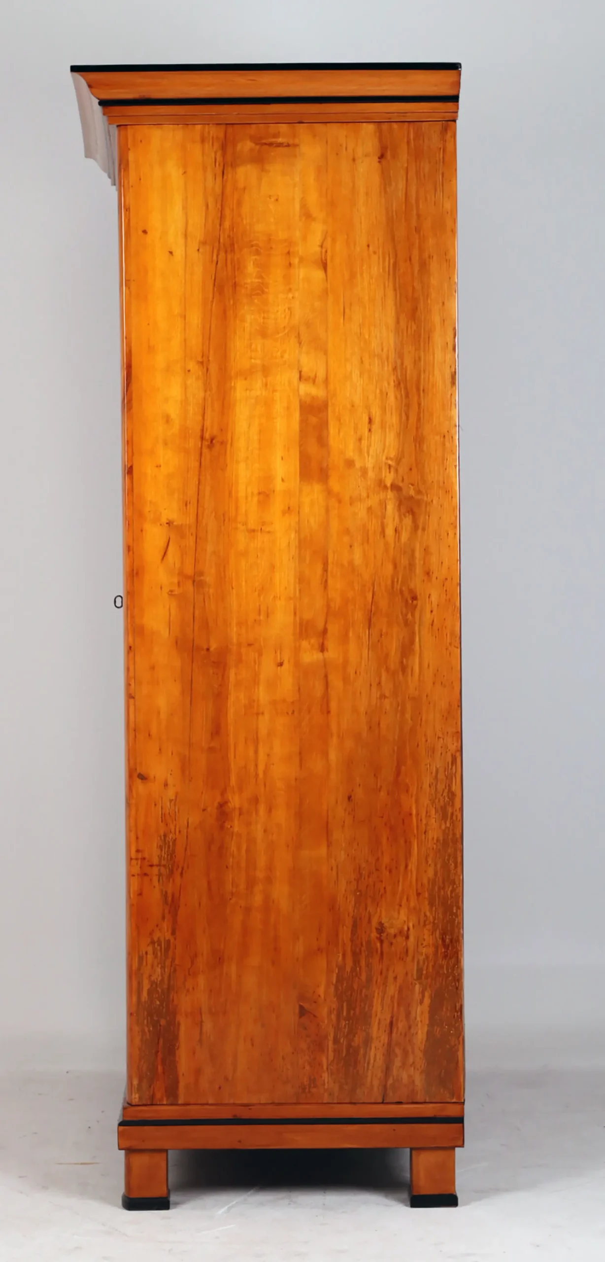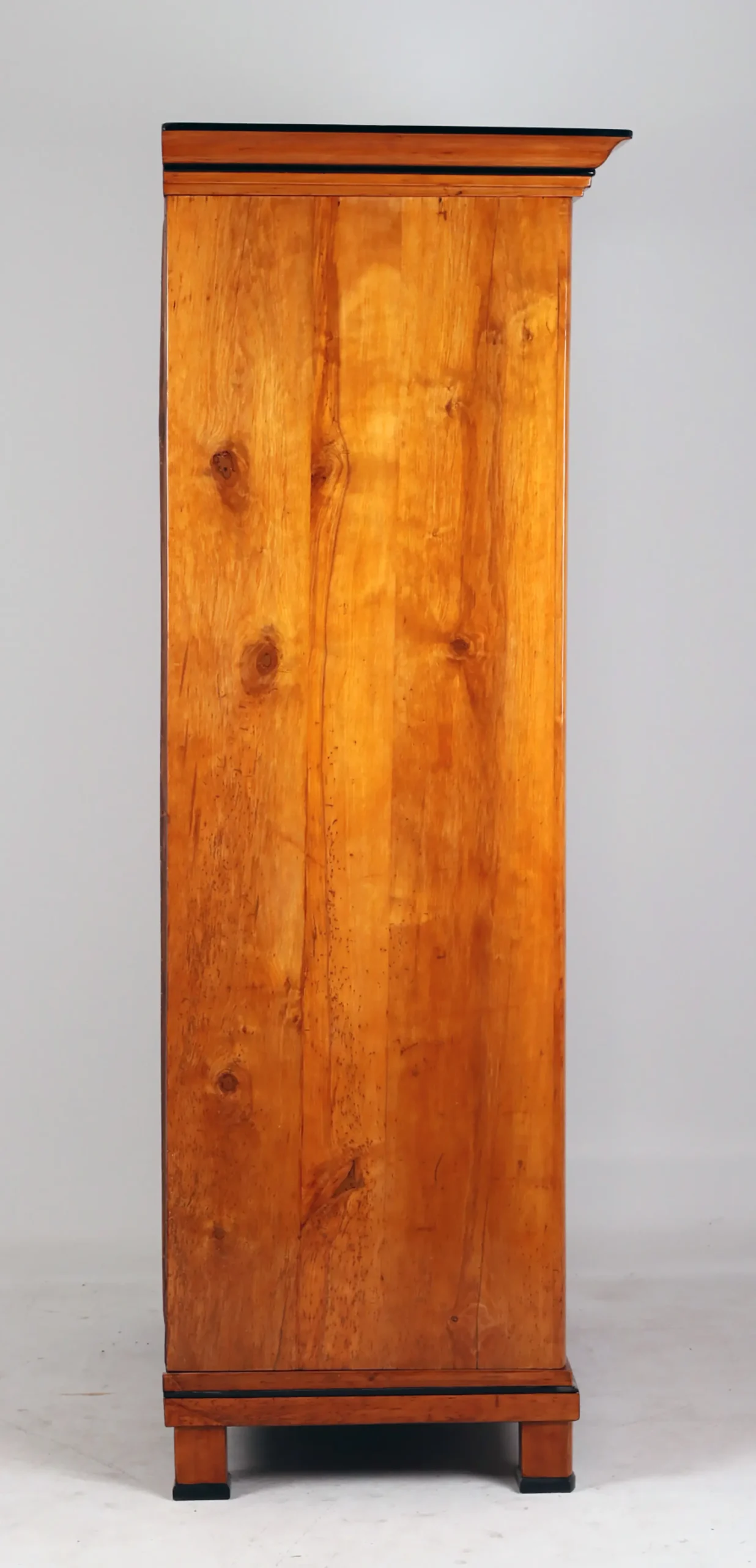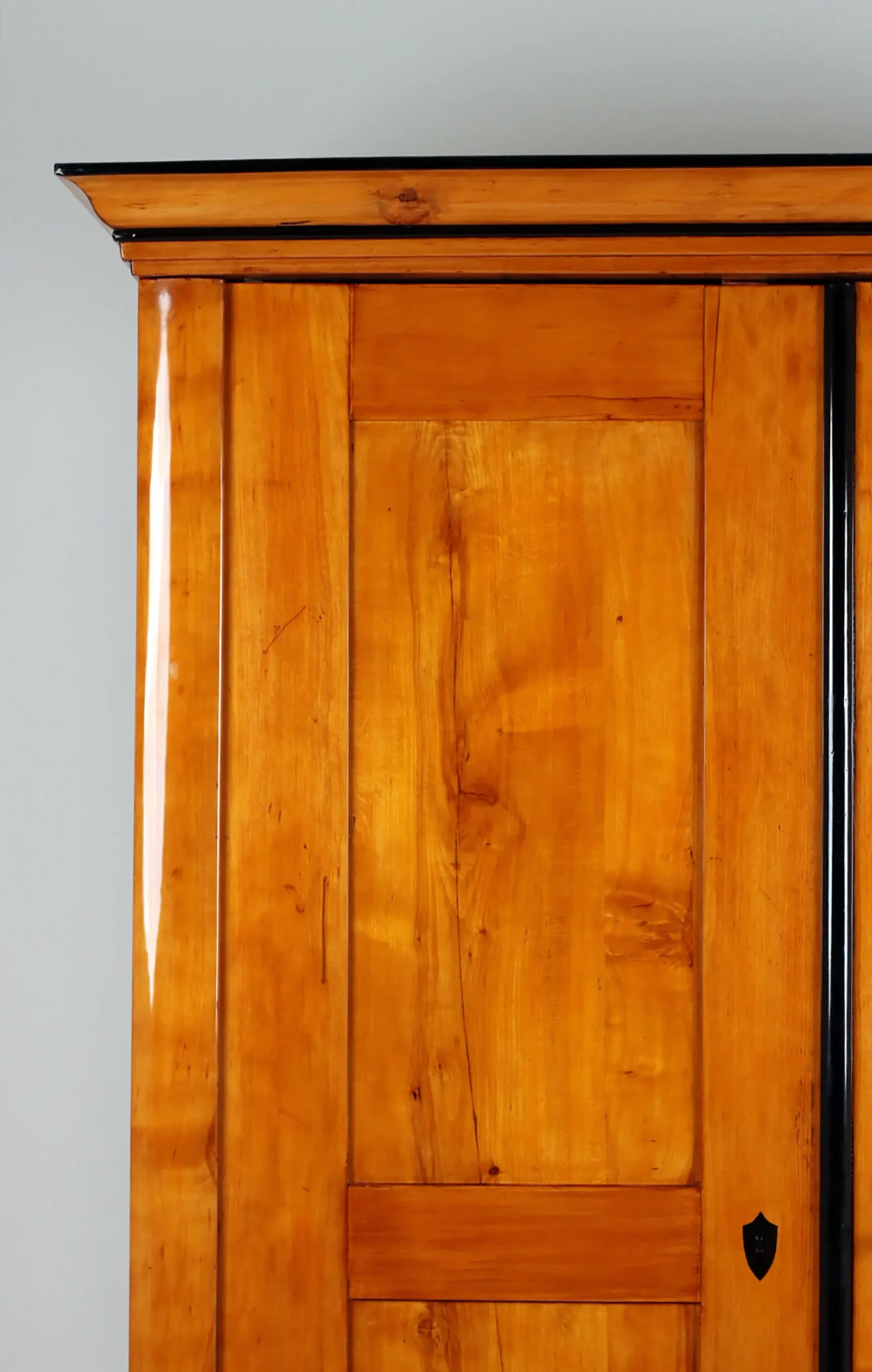 This piece embodies the refined restraint and harmonious proportions characteristic of the Biedermeier period. The façade features two tall, panelled doors framed by clean architectural lines and crowned with a subtly projecting cornice, creating a balanced and timeless silhouette.
