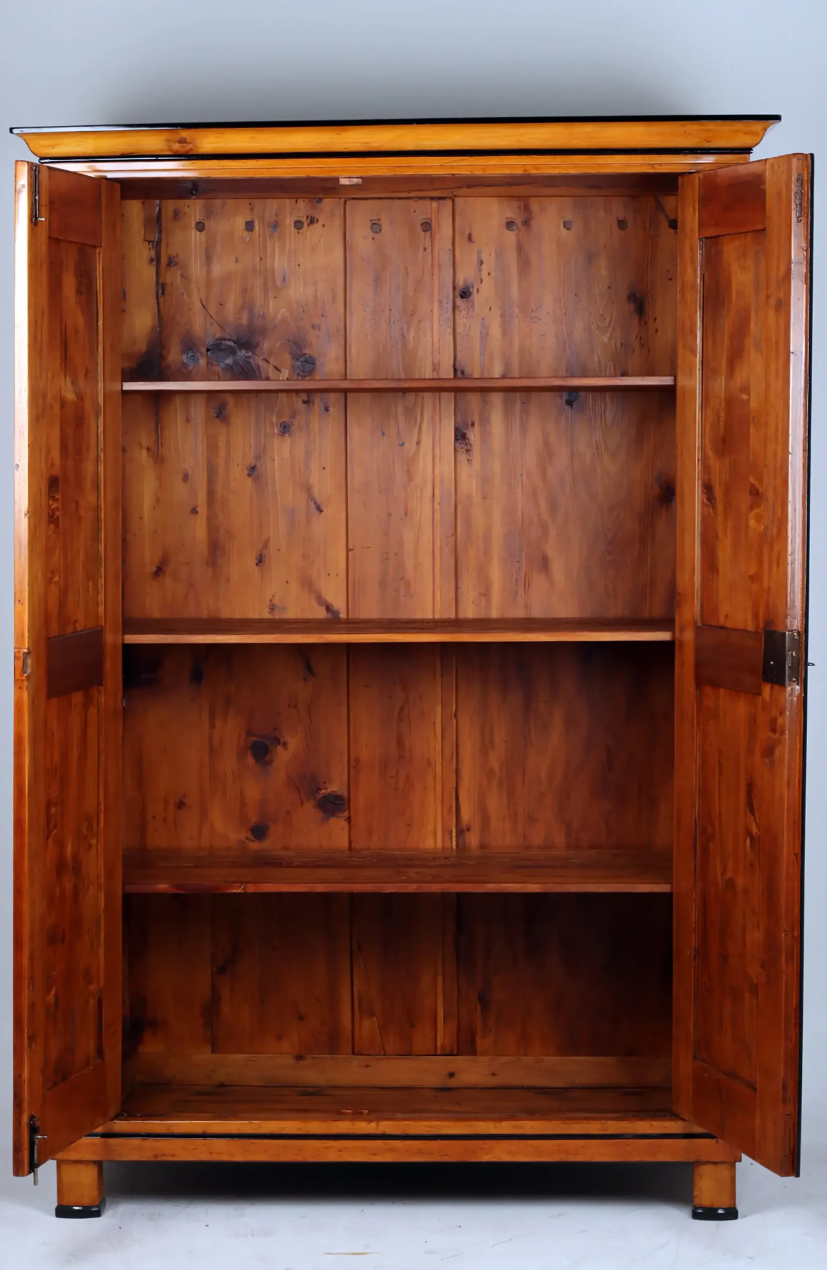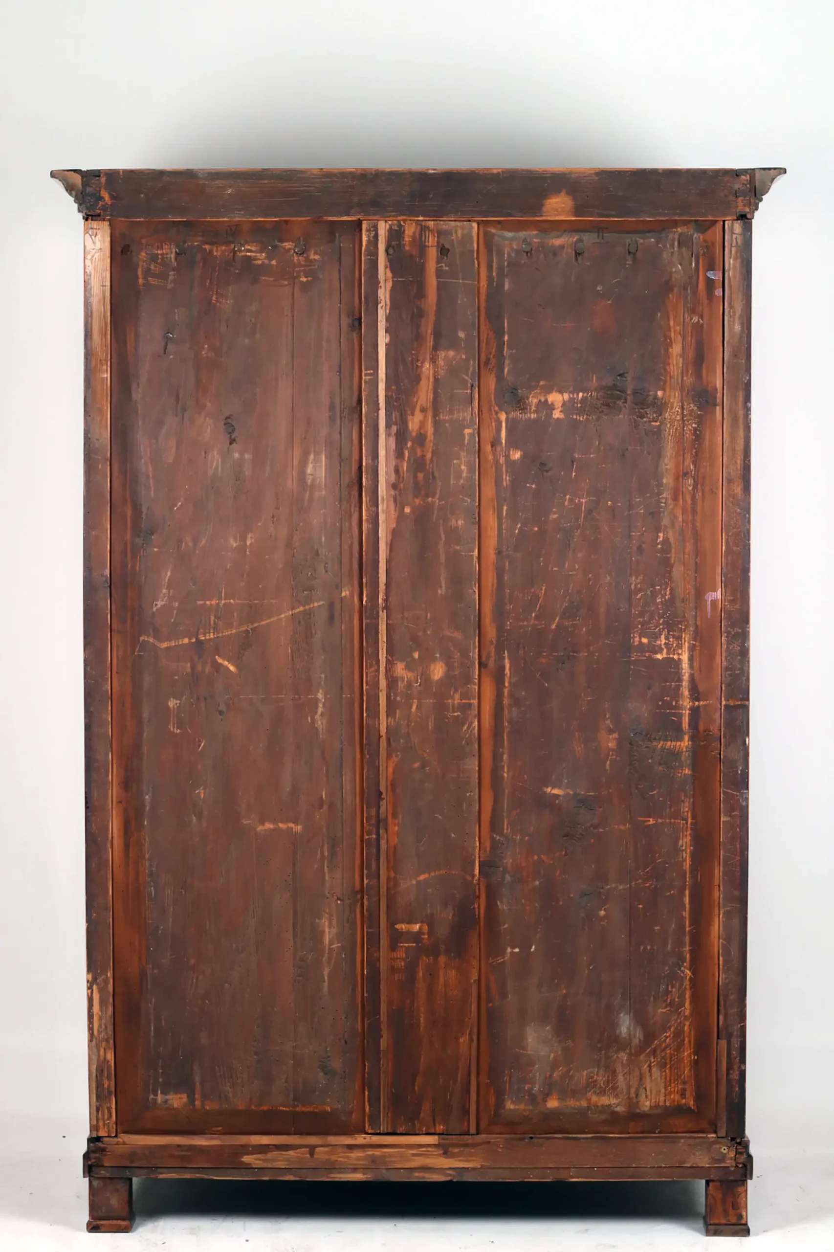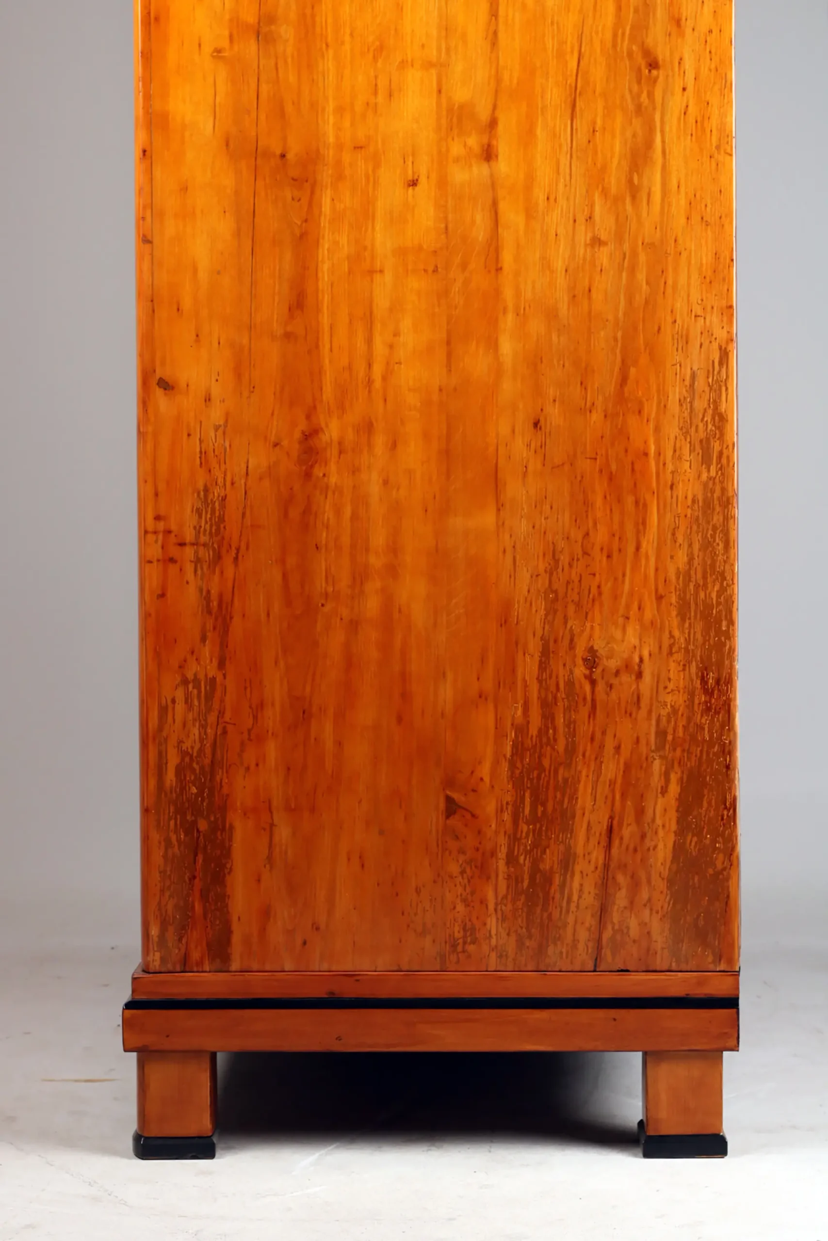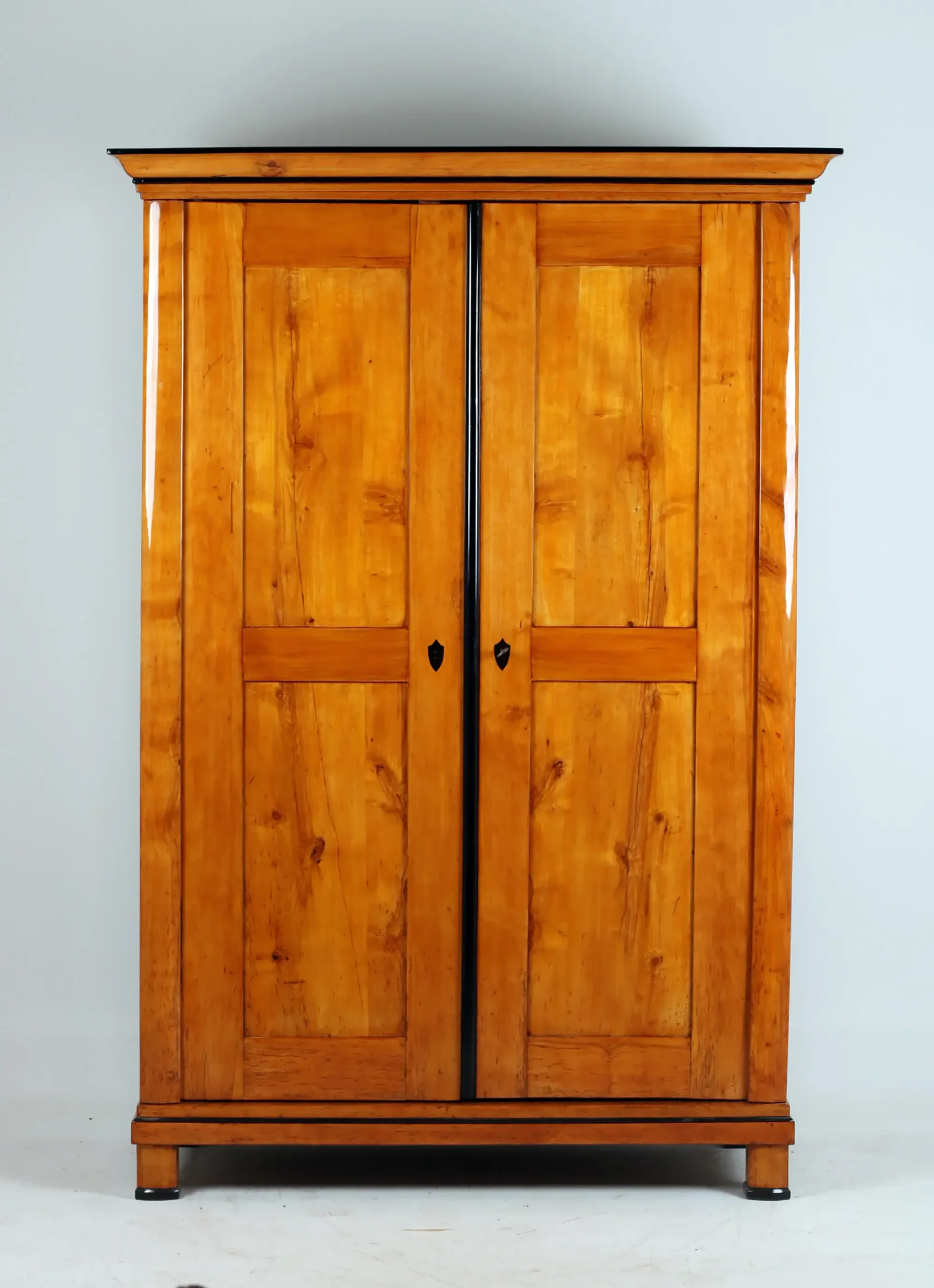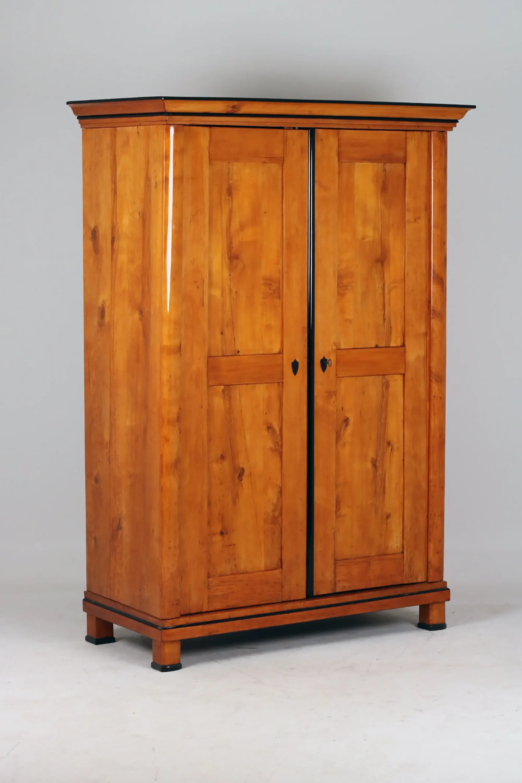 This piece embodies the refined restraint and harmonious proportions characteristic of the Biedermeier period. The façade features two tall, panelled doors framed by clean architectural lines and crowned with a subtly projecting cornice, creating a balanced and timeless silhouette.