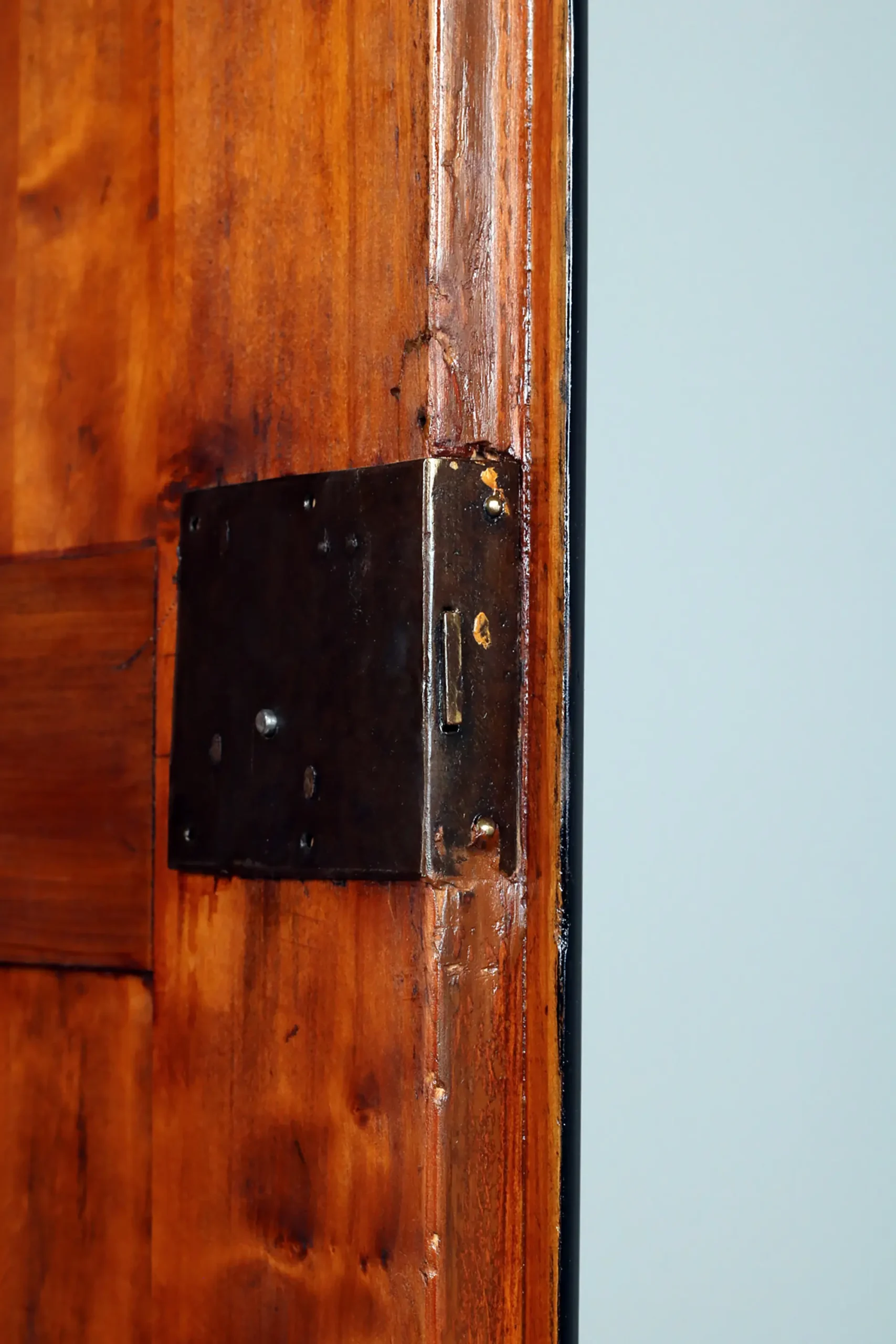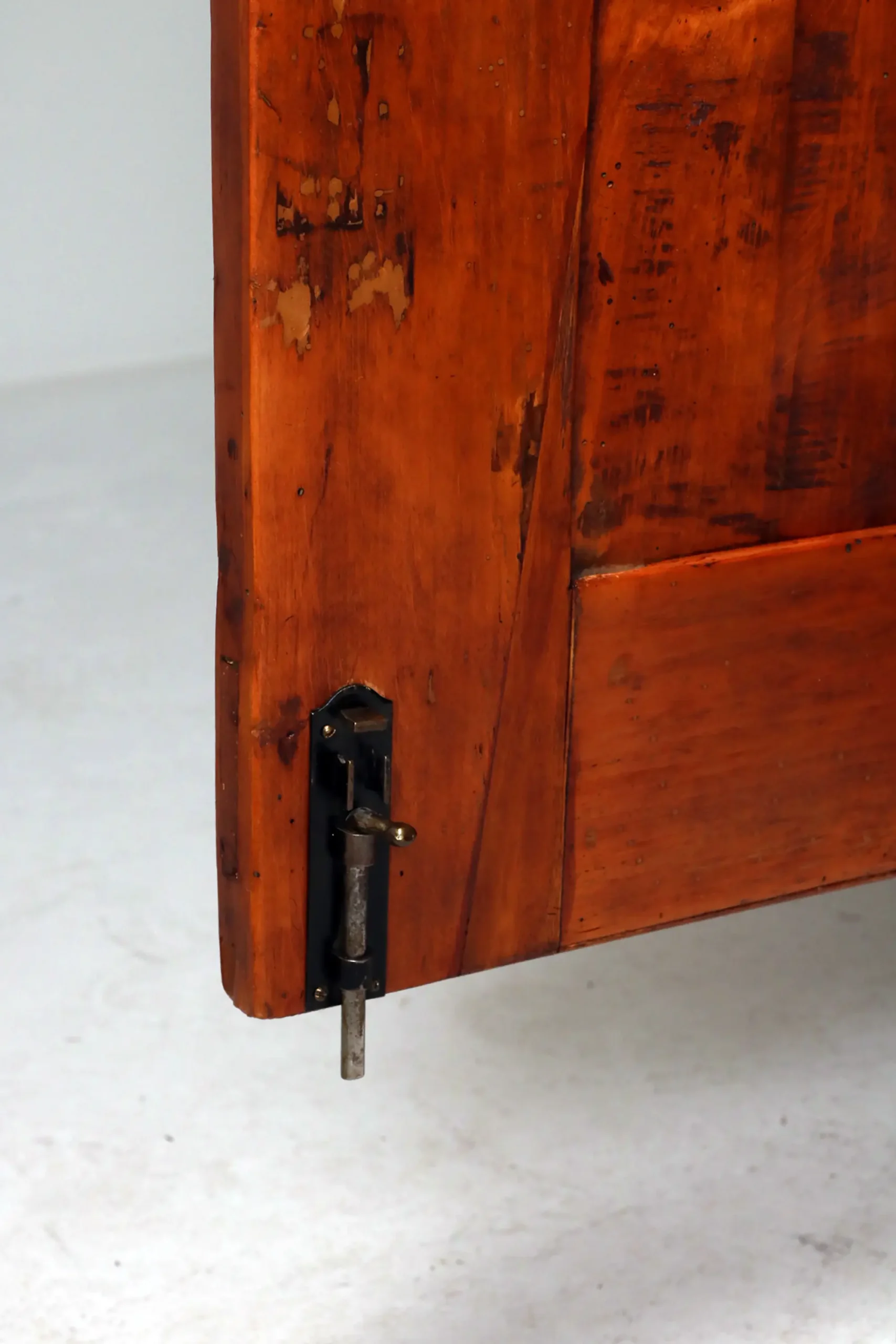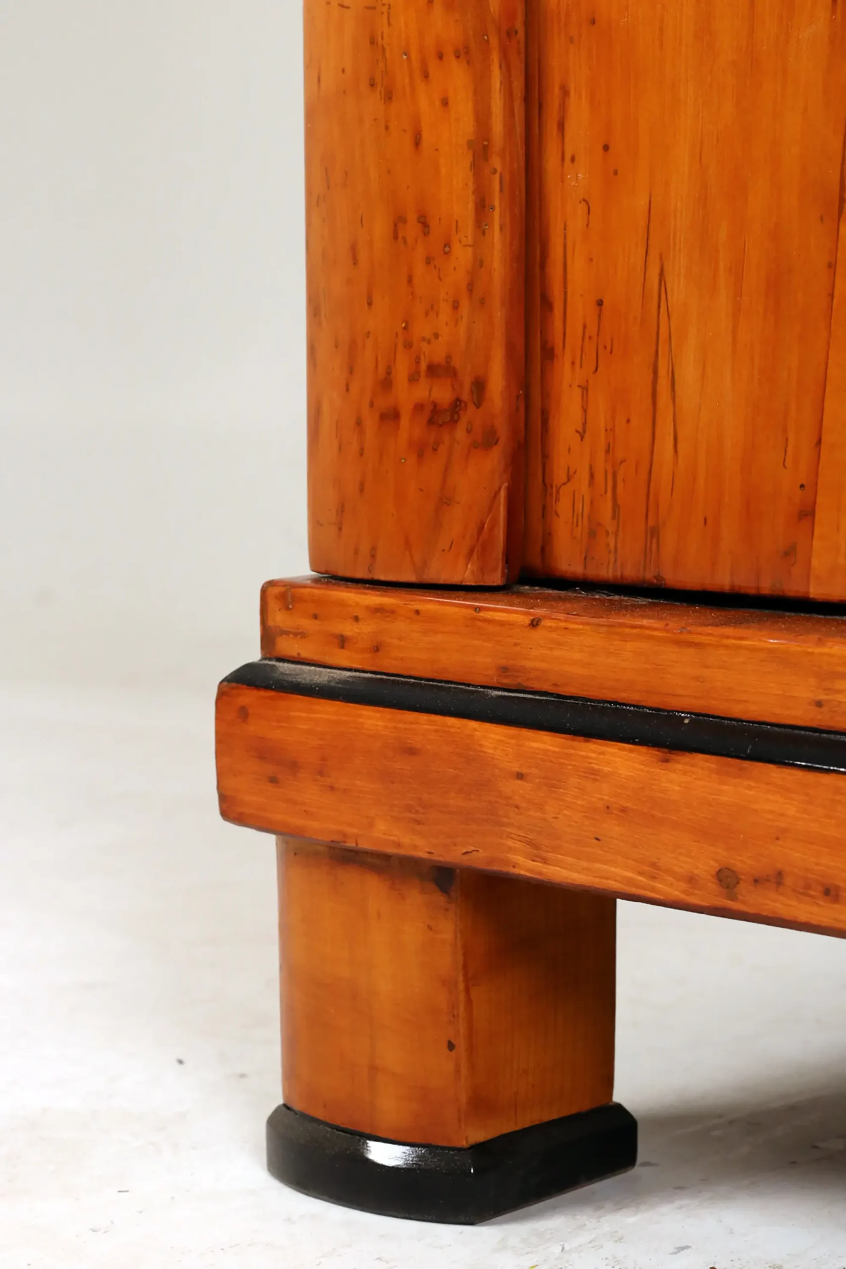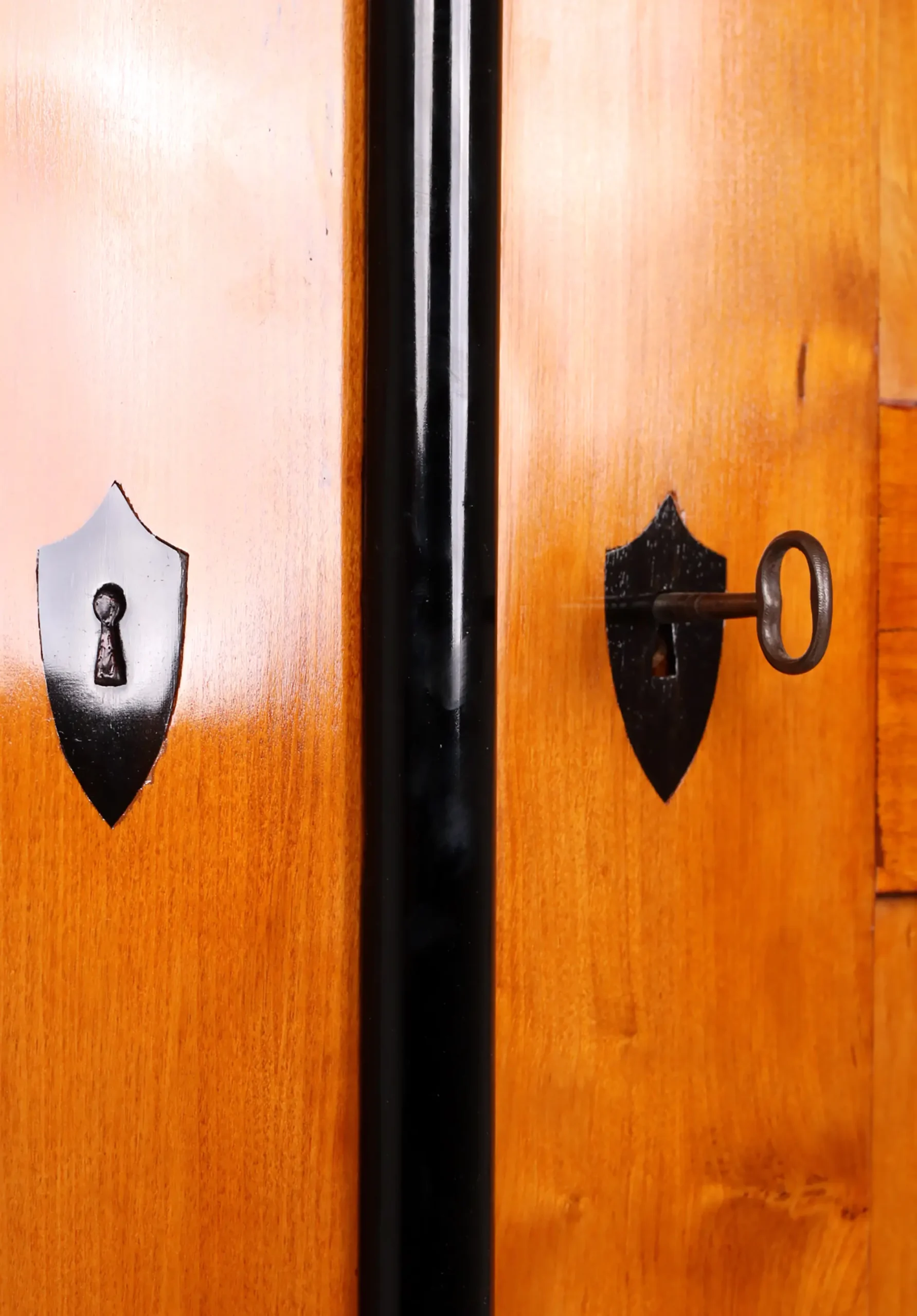 This piece embodies the refined restraint and harmonious proportions characteristic of the Biedermeier period. The façade features two tall, panelled doors framed by clean architectural lines and crowned with a subtly projecting cornice, creating a balanced and timeless silhouette.