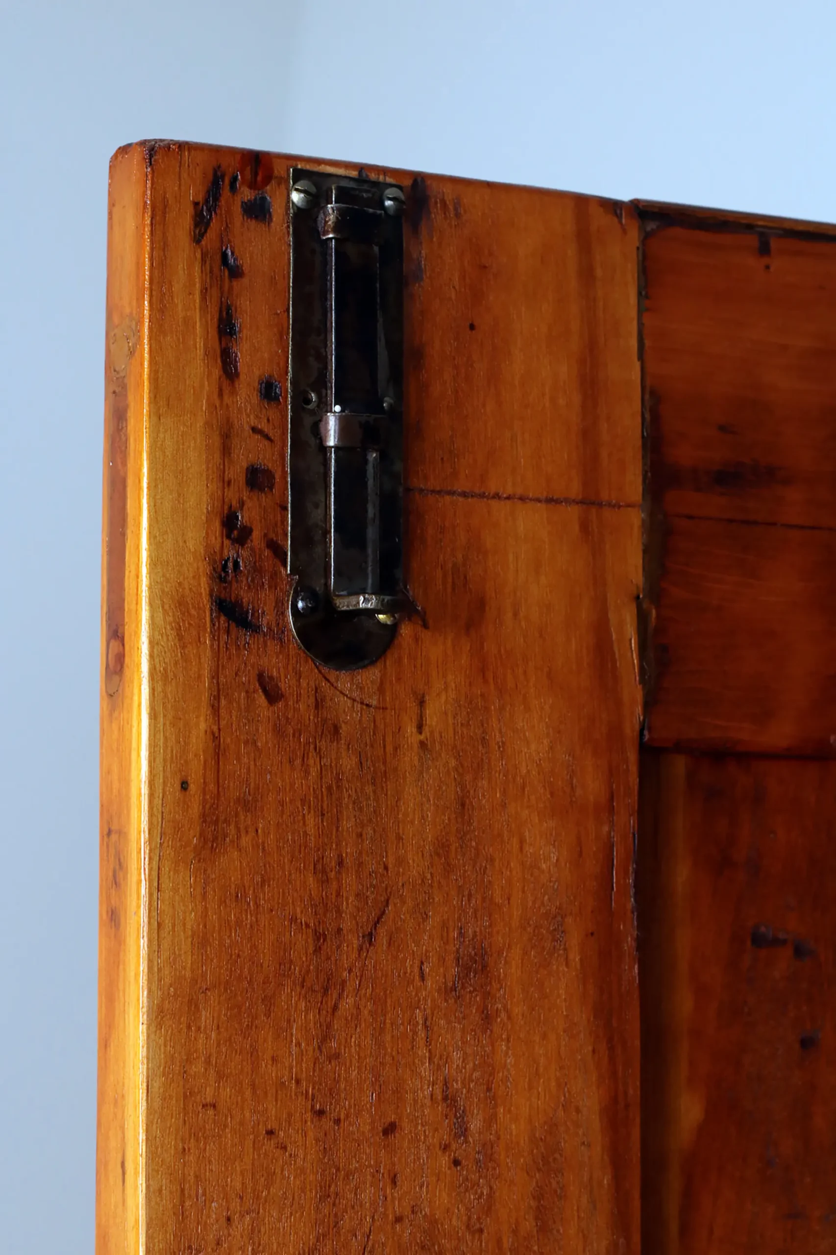 The wardrobe stands on simple block feet, subtly accented with ebonised elements that provide a refined contrast to the light tone of the wood. Original escutcheons further underline the authenticity of the piece.