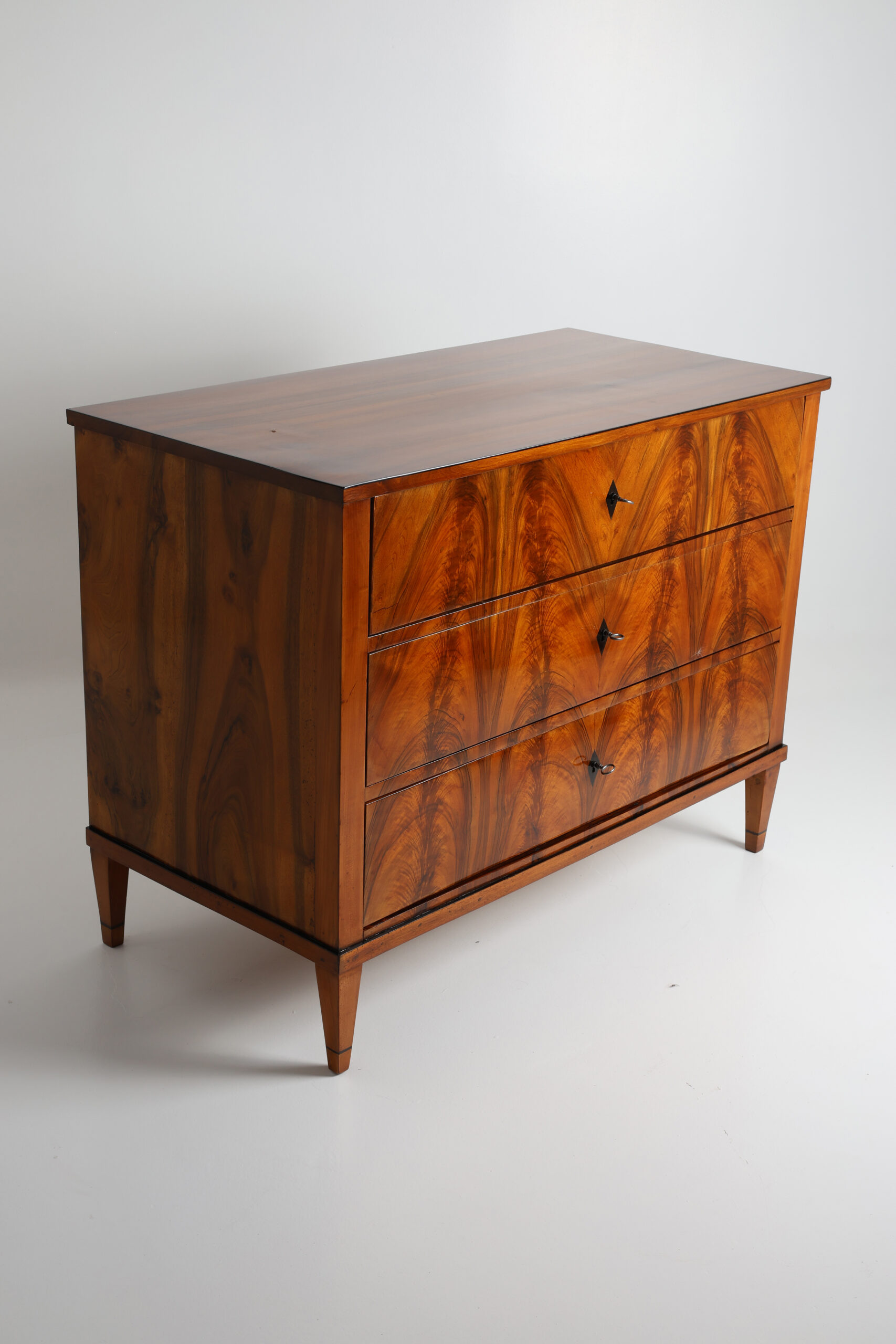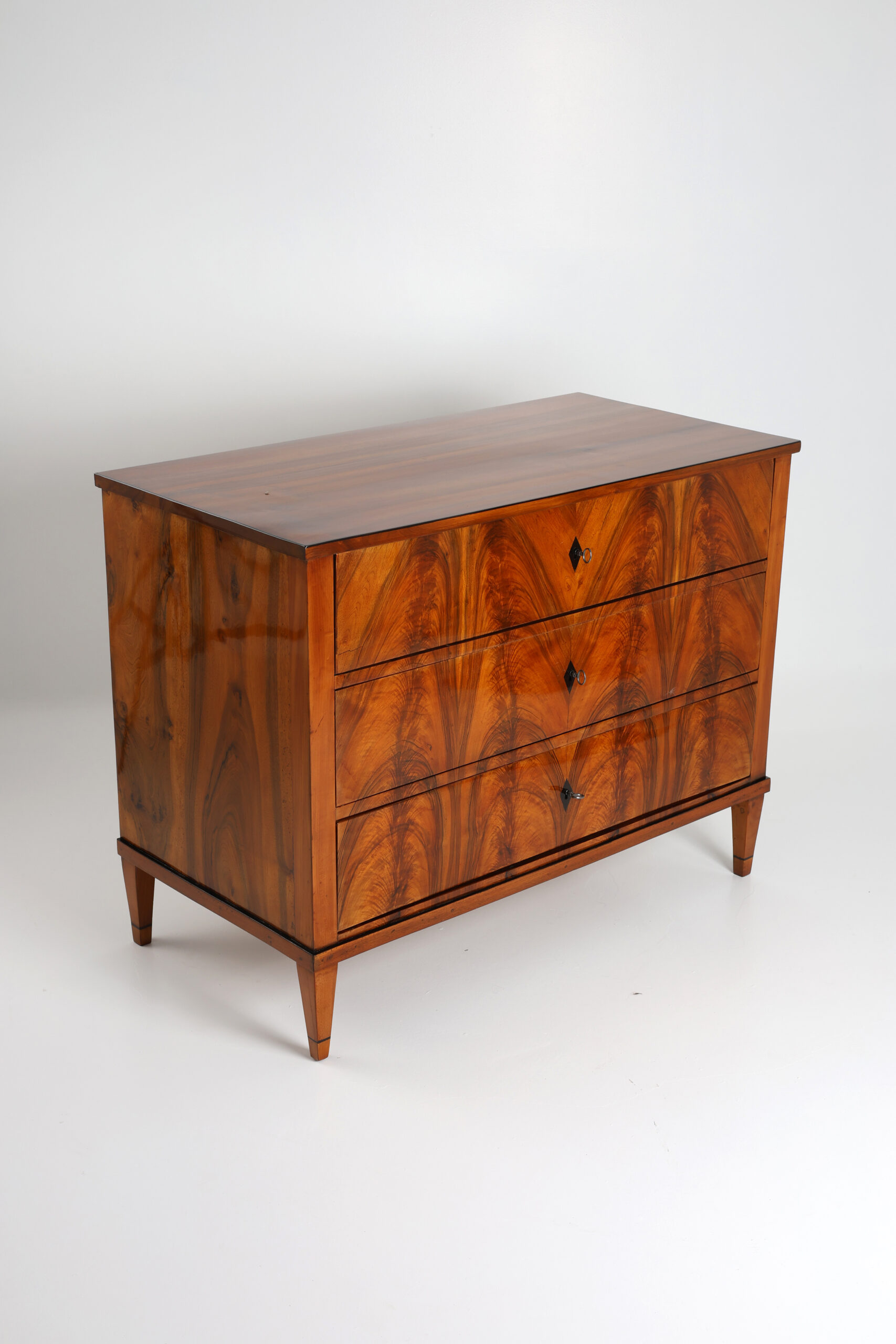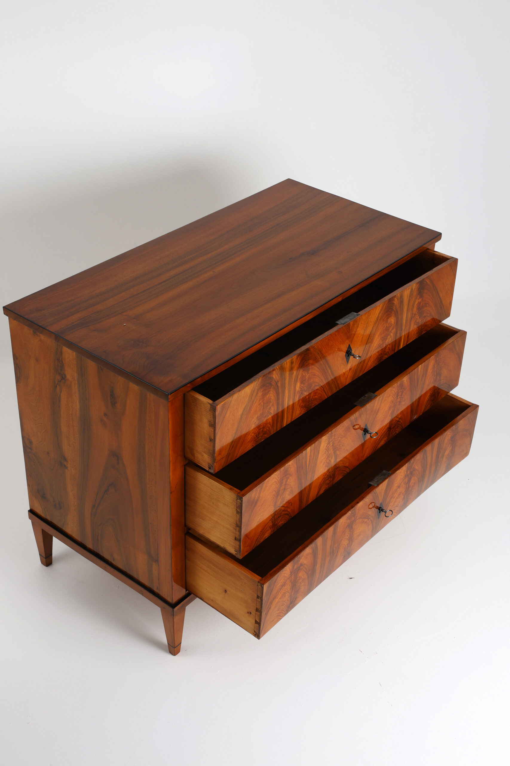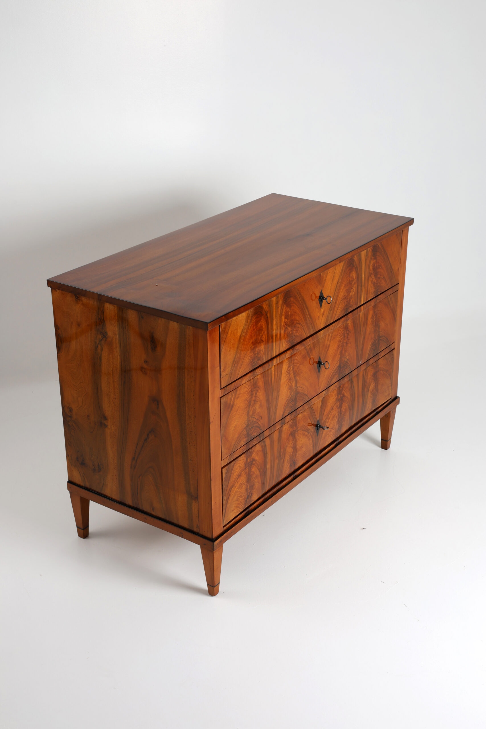 The carcass is constructed in pine, typical for the period, and veneered in fine walnut. Subtle details such as ebonised stringing and escutcheons enhance the refined and restrained aesthetic characteristic of the early Biedermeier style. The chest stands on slender, tapered legs, giving the piece a sense of lightness and well-balanced proportions.