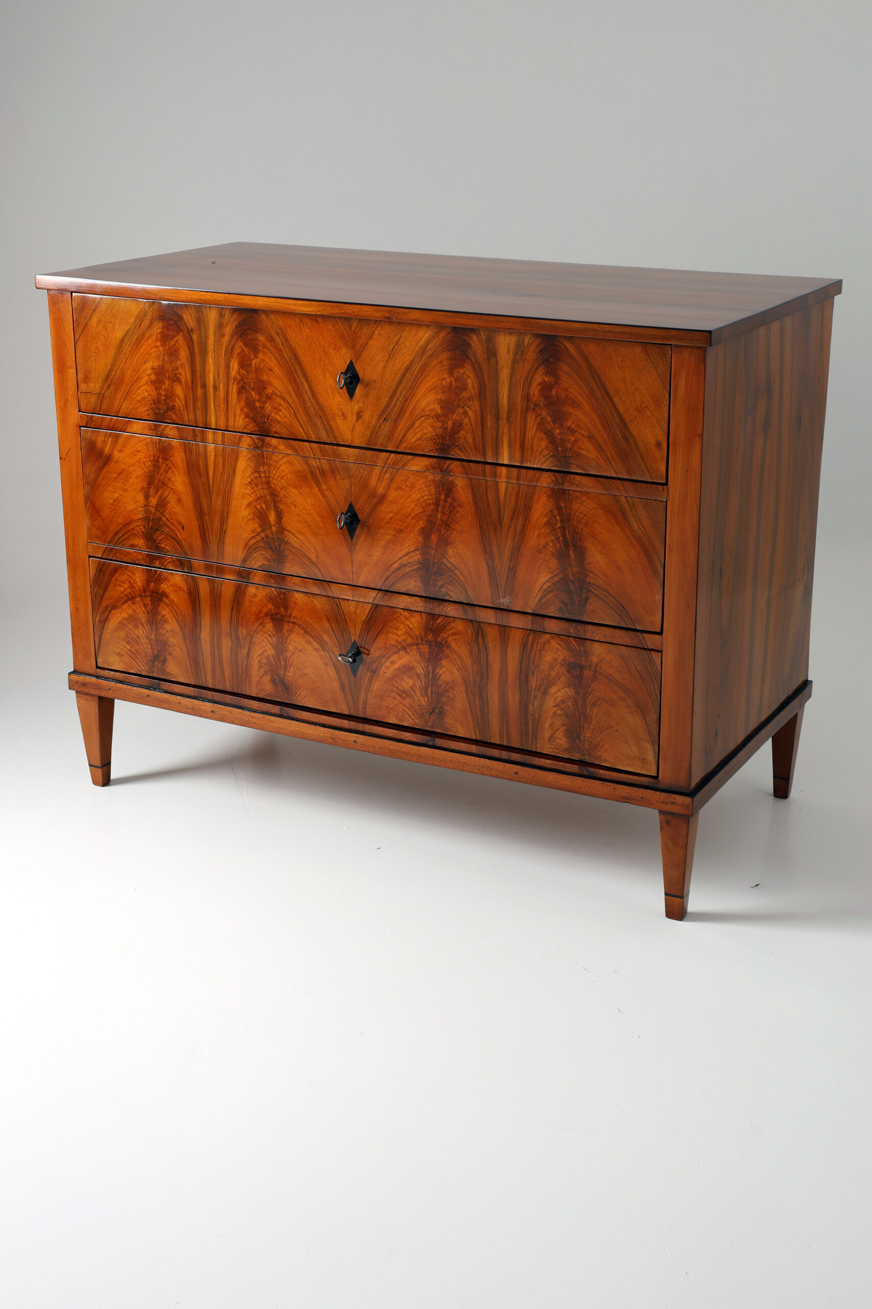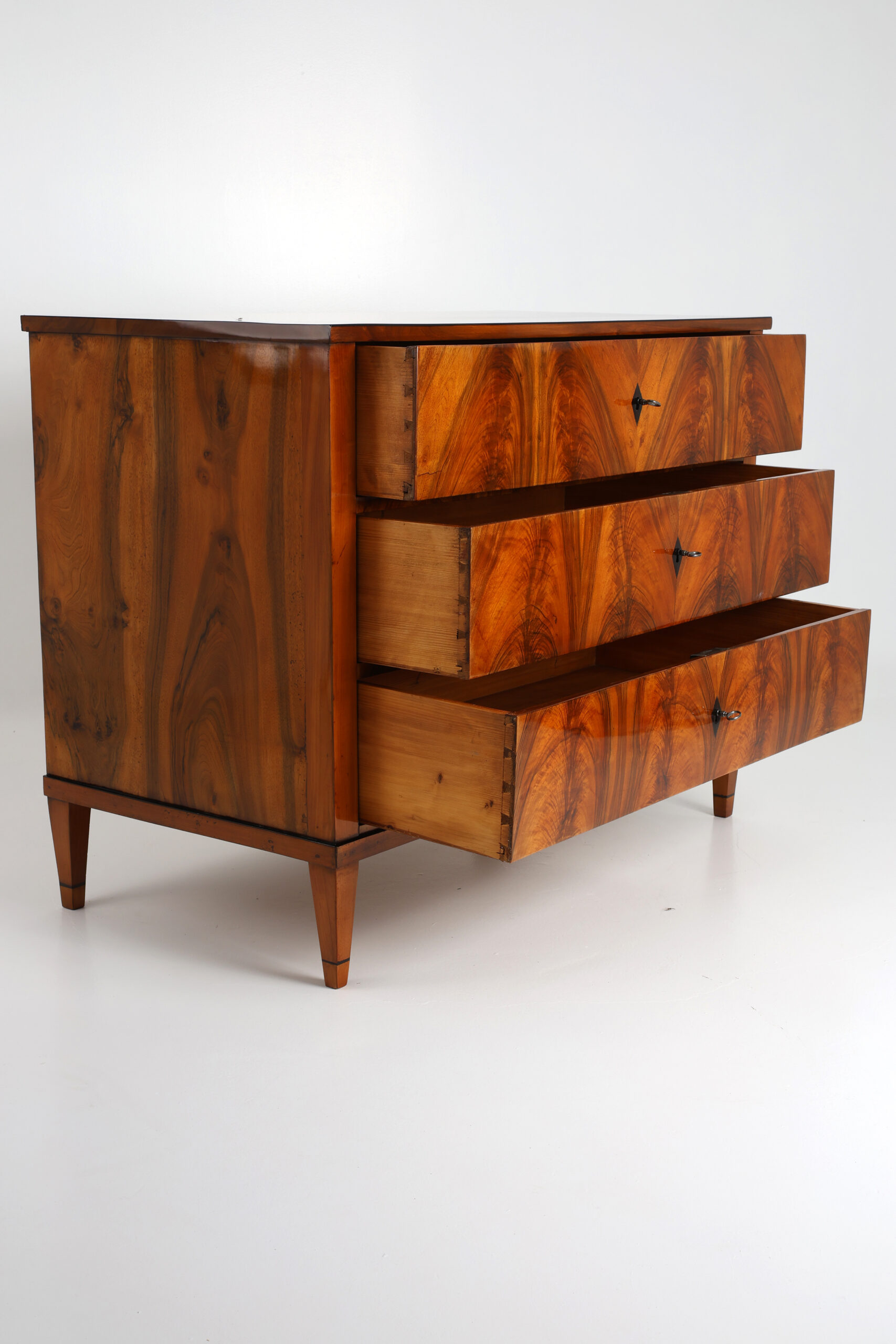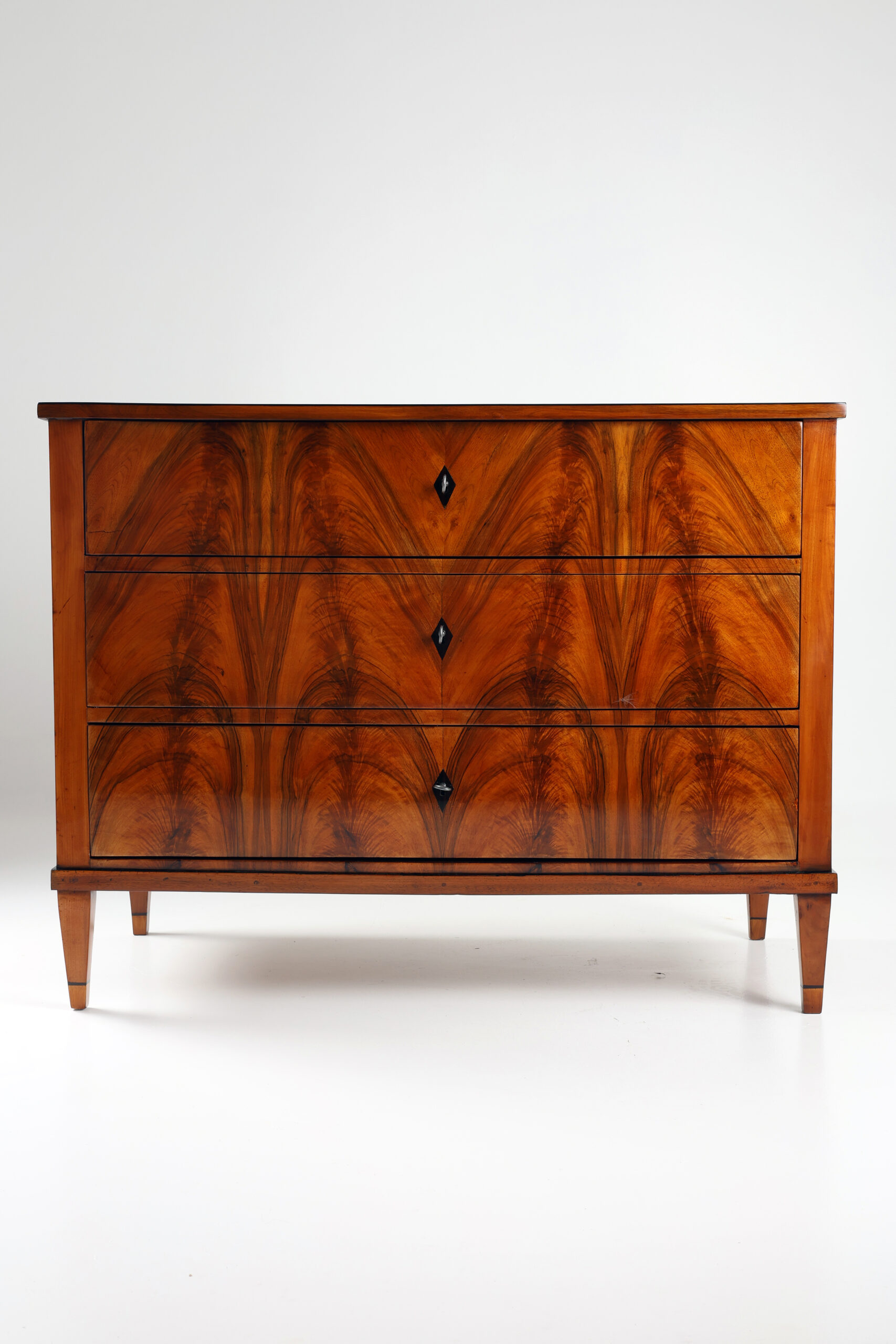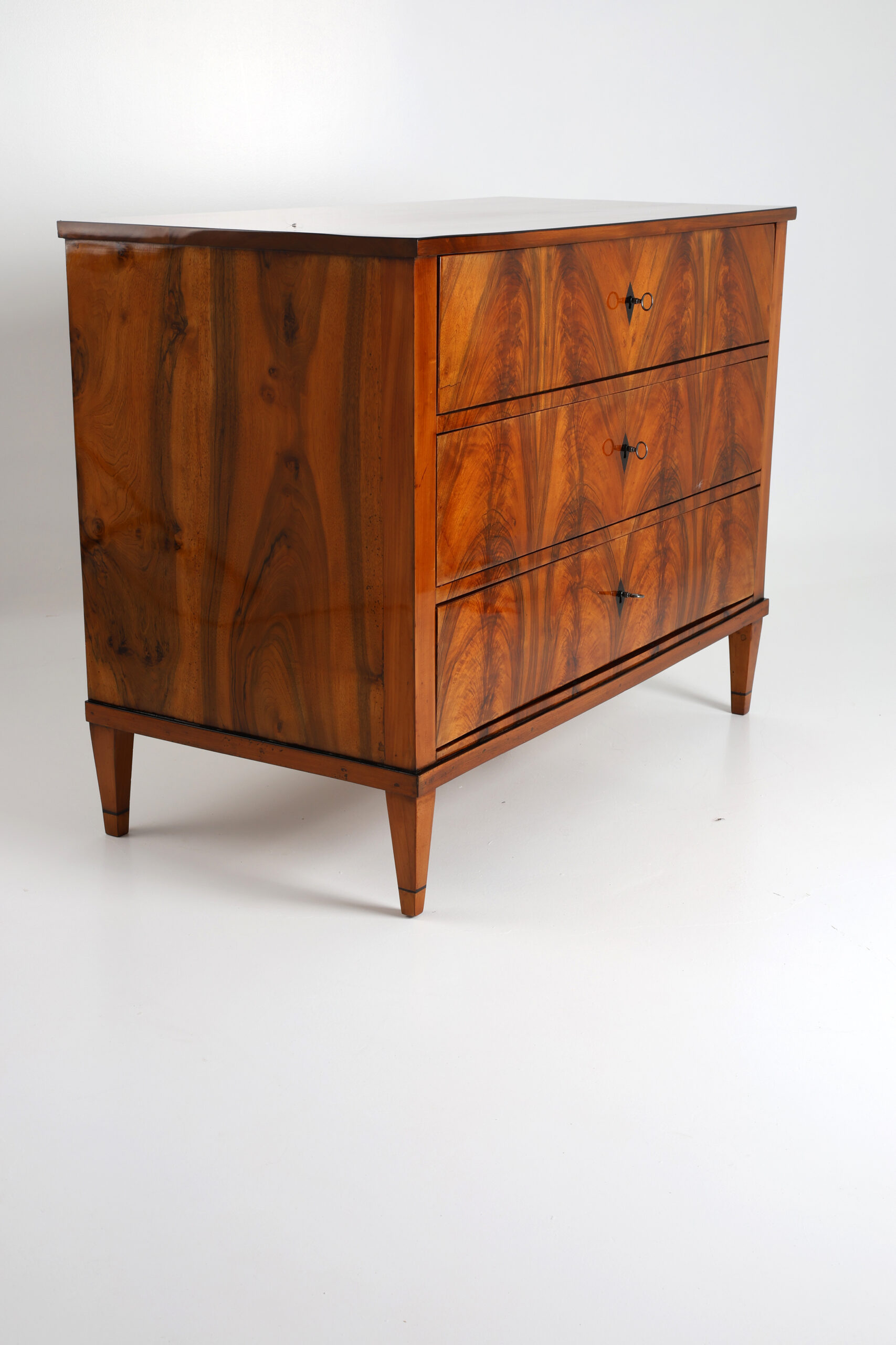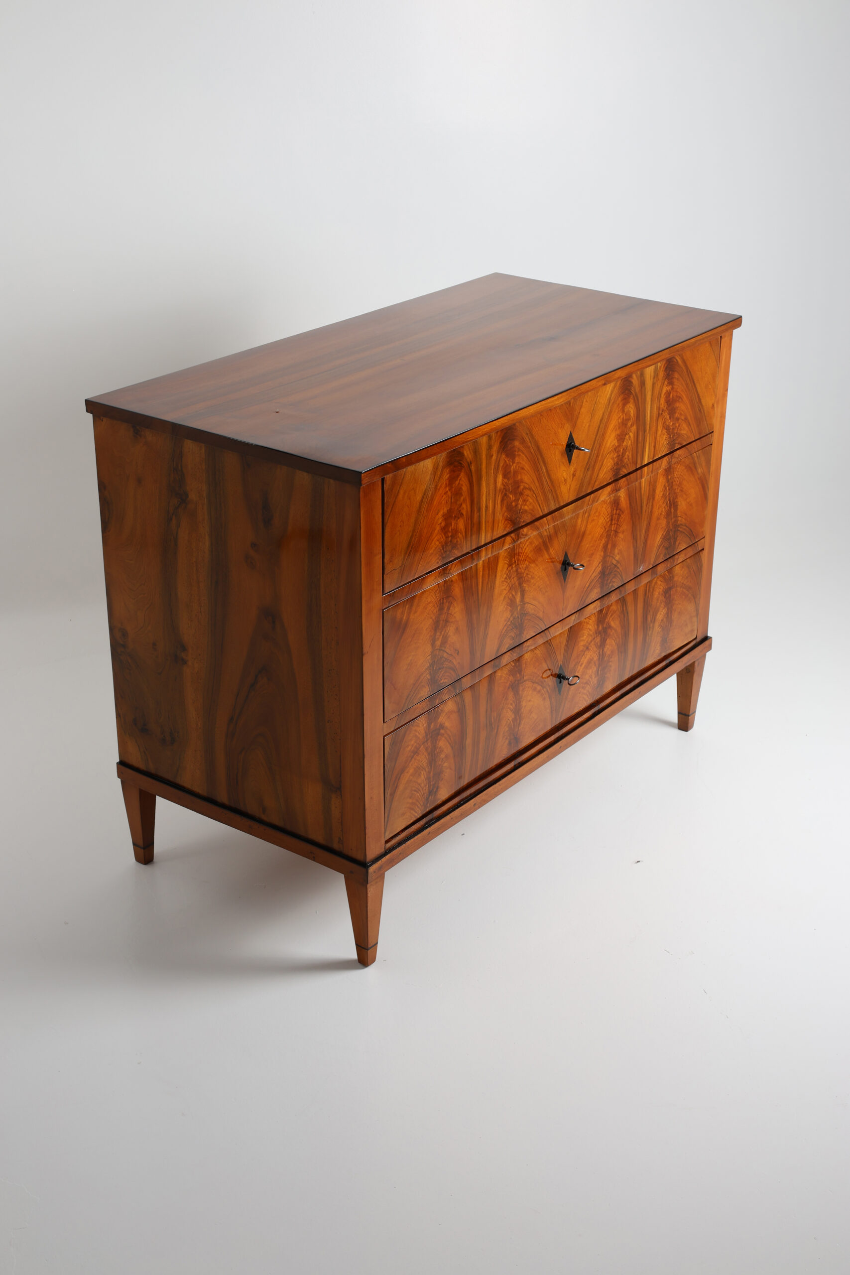 The carcass is constructed in pine, typical for the period, and veneered in fine walnut. Subtle details such as ebonised stringing and escutcheons enhance the refined and restrained aesthetic characteristic of the early Biedermeier style. The chest stands on slender, tapered legs, giving the piece a sense of lightness and well-balanced proportions.