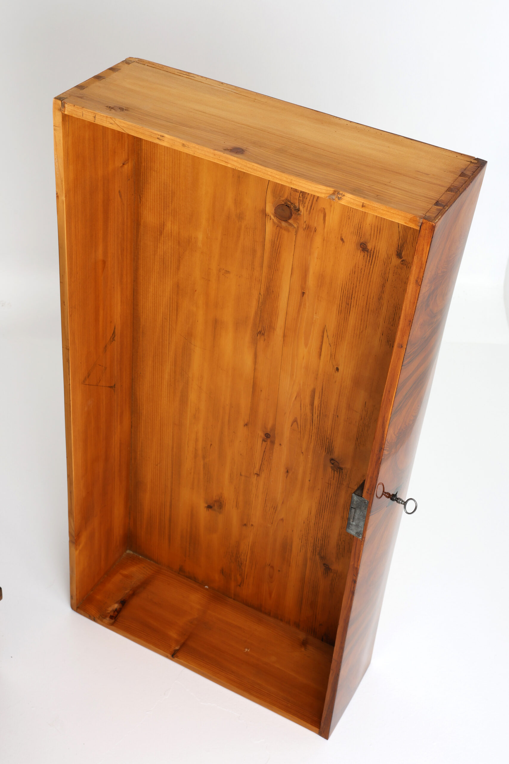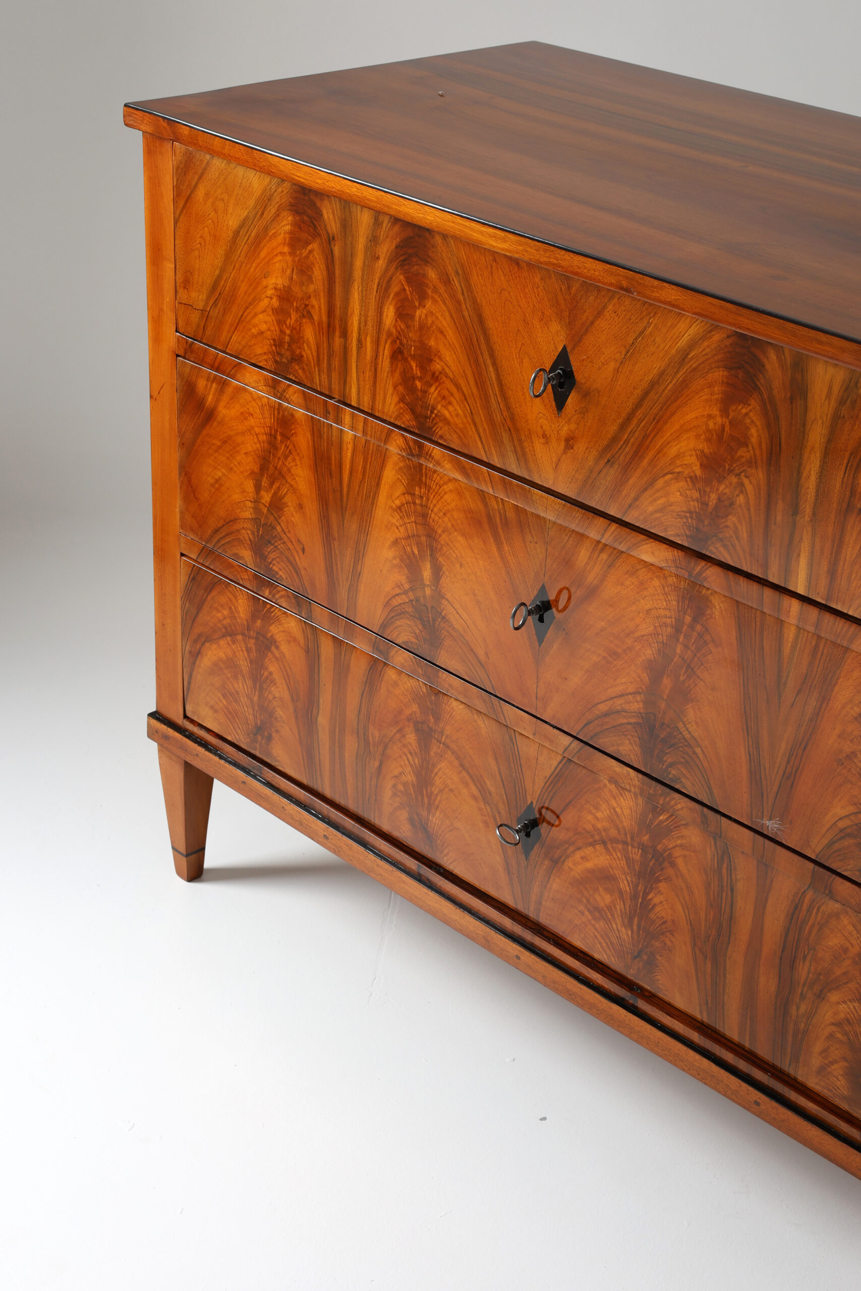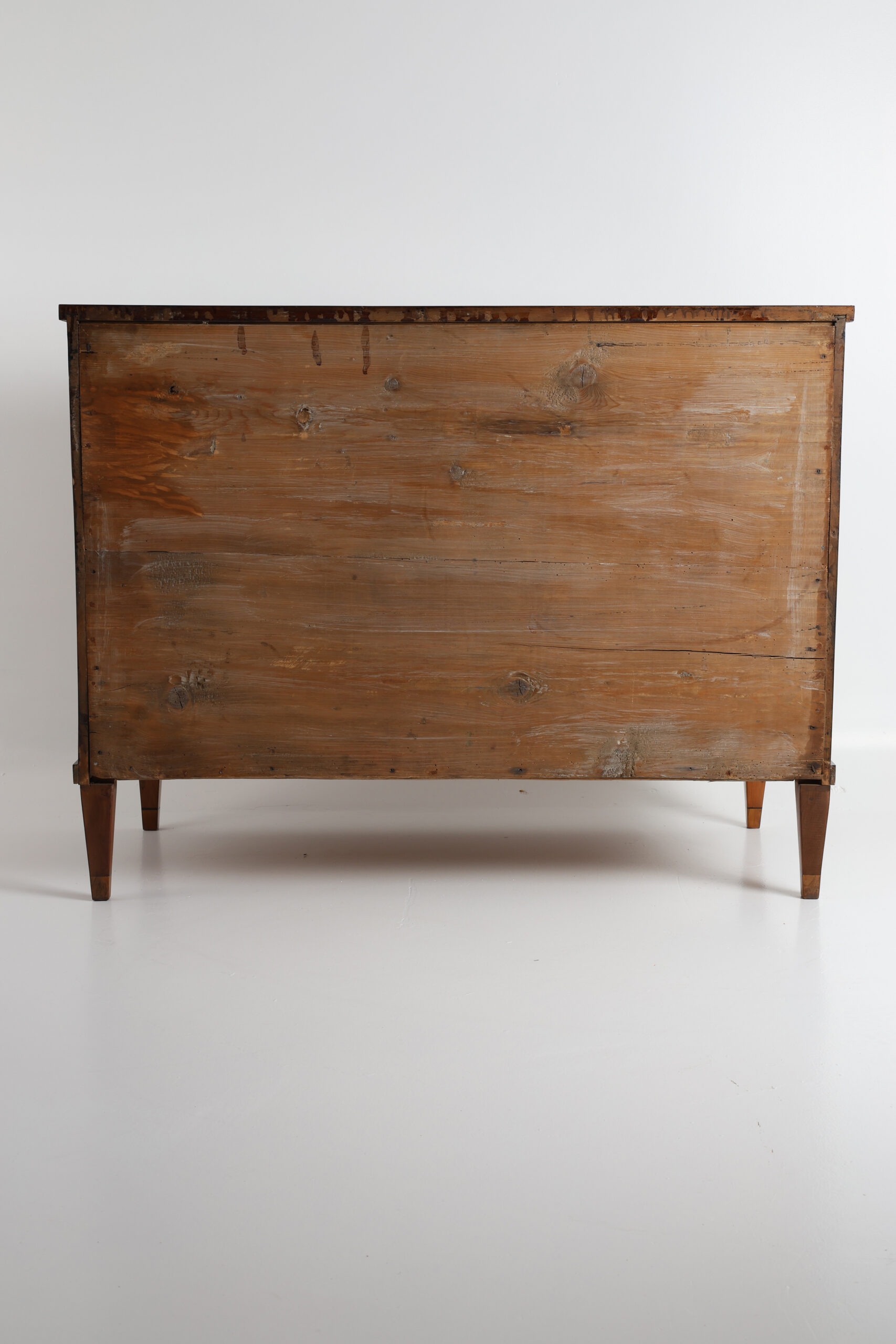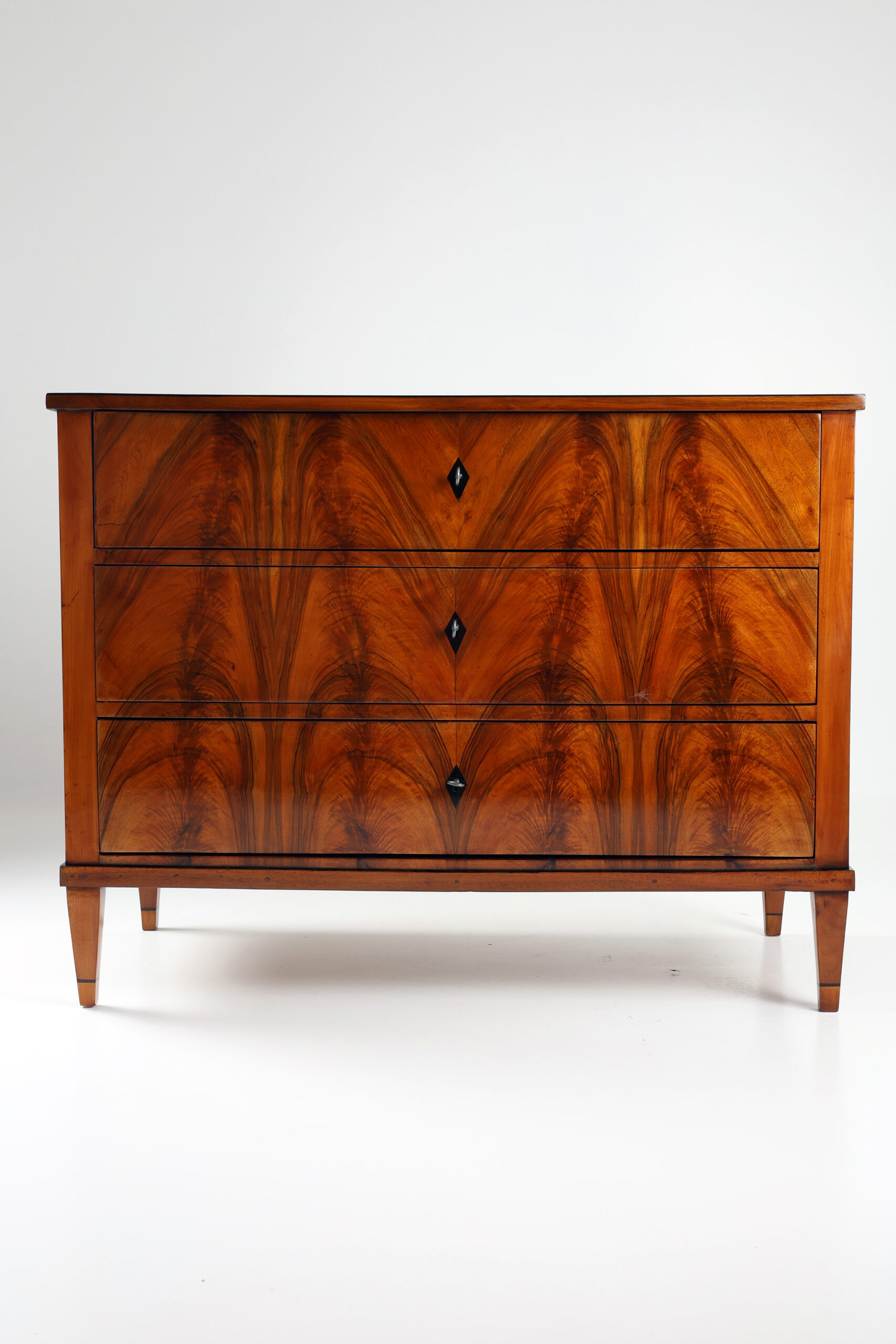 The carcass is constructed in pine, typical for the period, and veneered in fine walnut. Subtle details such as ebonised stringing and escutcheons enhance the refined and restrained aesthetic characteristic of the early Biedermeier style. The chest stands on slender, tapered legs, giving the piece a sense of lightness and well-balanced proportions.