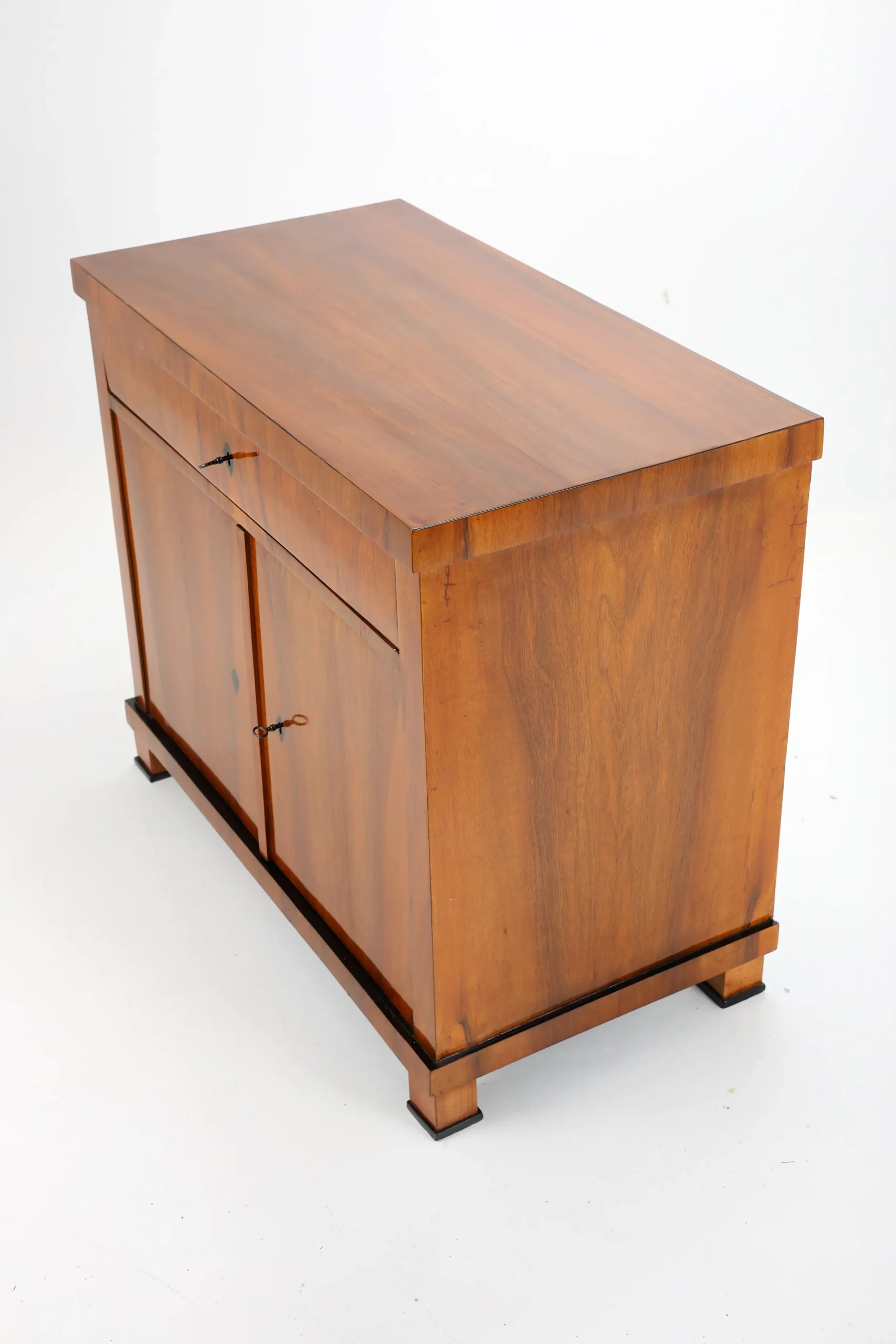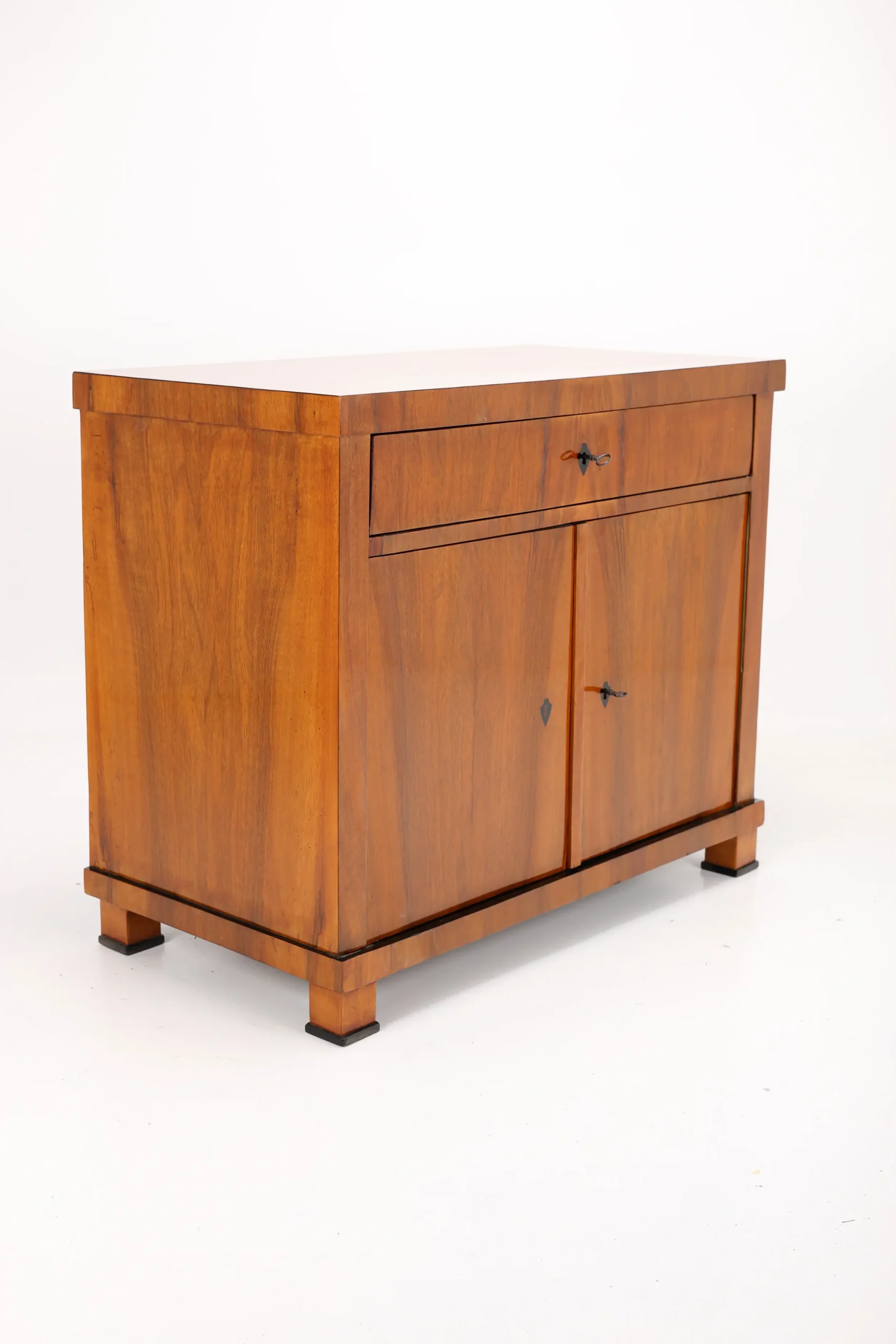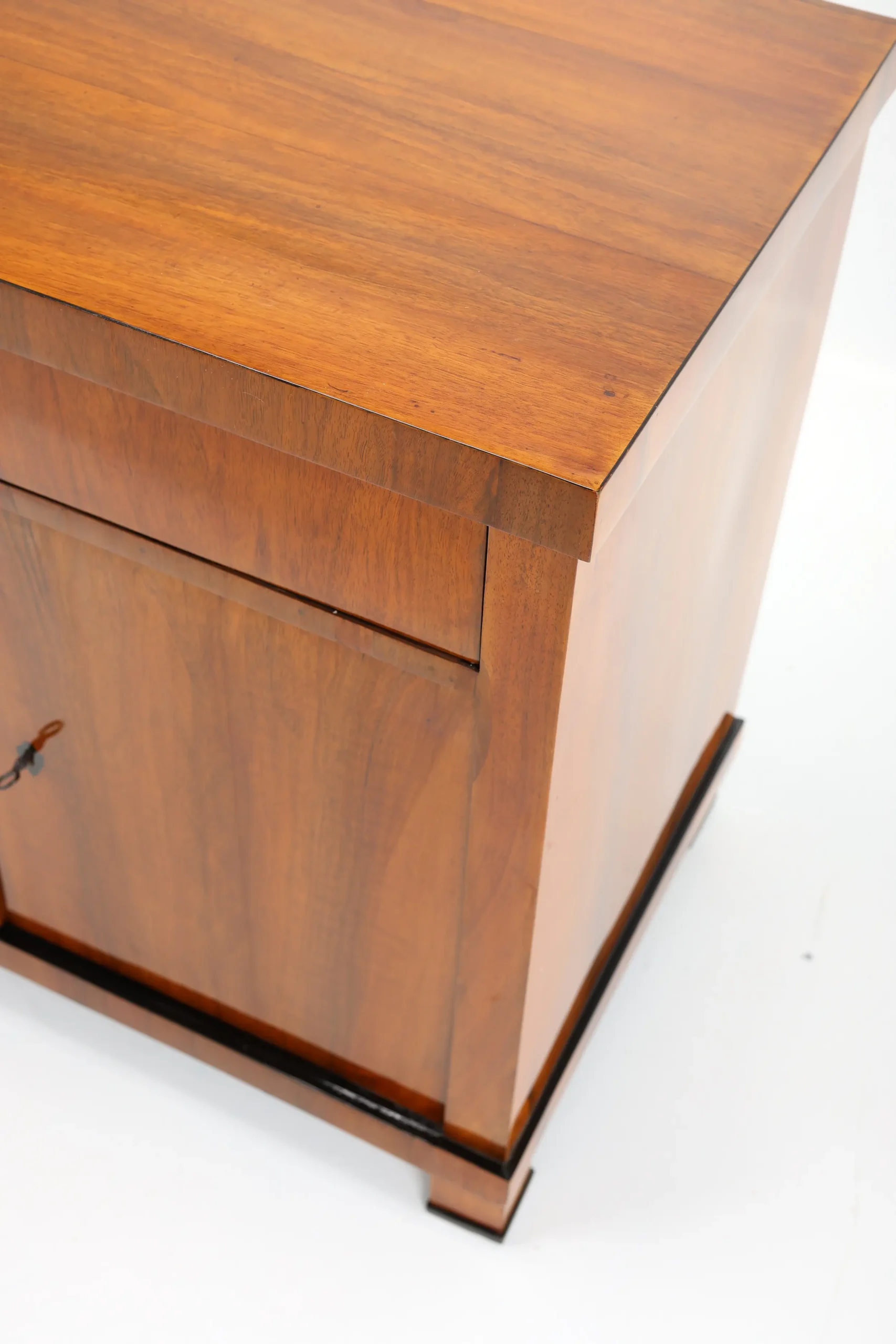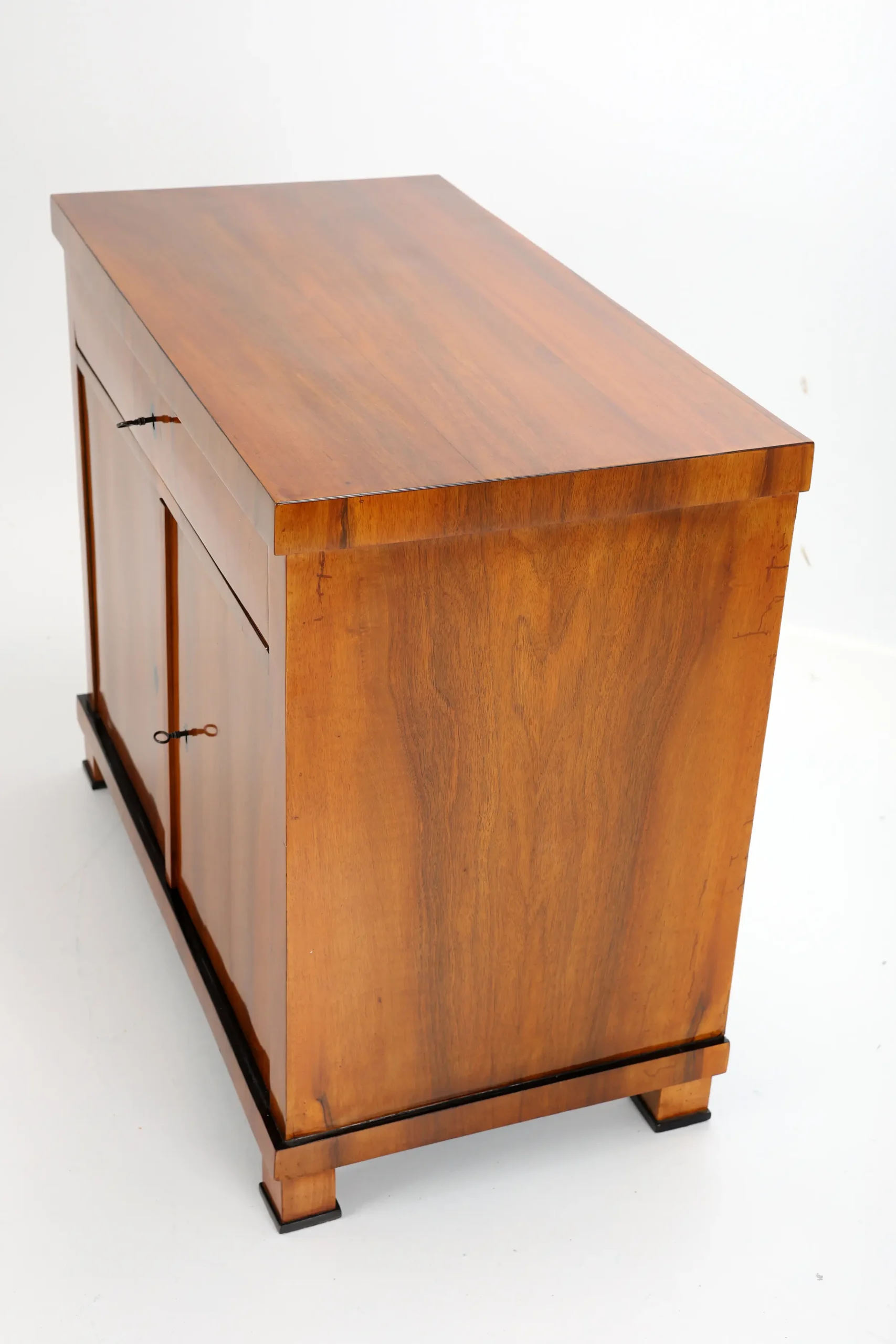 The cabinet stands gracefully upon block-shaped feet, beneath which lies a subtle ebonised-plated plinth, echoing the elegant details of the piece. A similar ebonised inlay decorates the edge of the top surface, framing the piece with a refined, understated flourish. This exquisite detail, a slender inlay of ebonised, not only adds a sense of sophistication but also firmly places the cabinet within the Biedermeier tradition, where craftsmanship and aesthetic harmony are paramount.