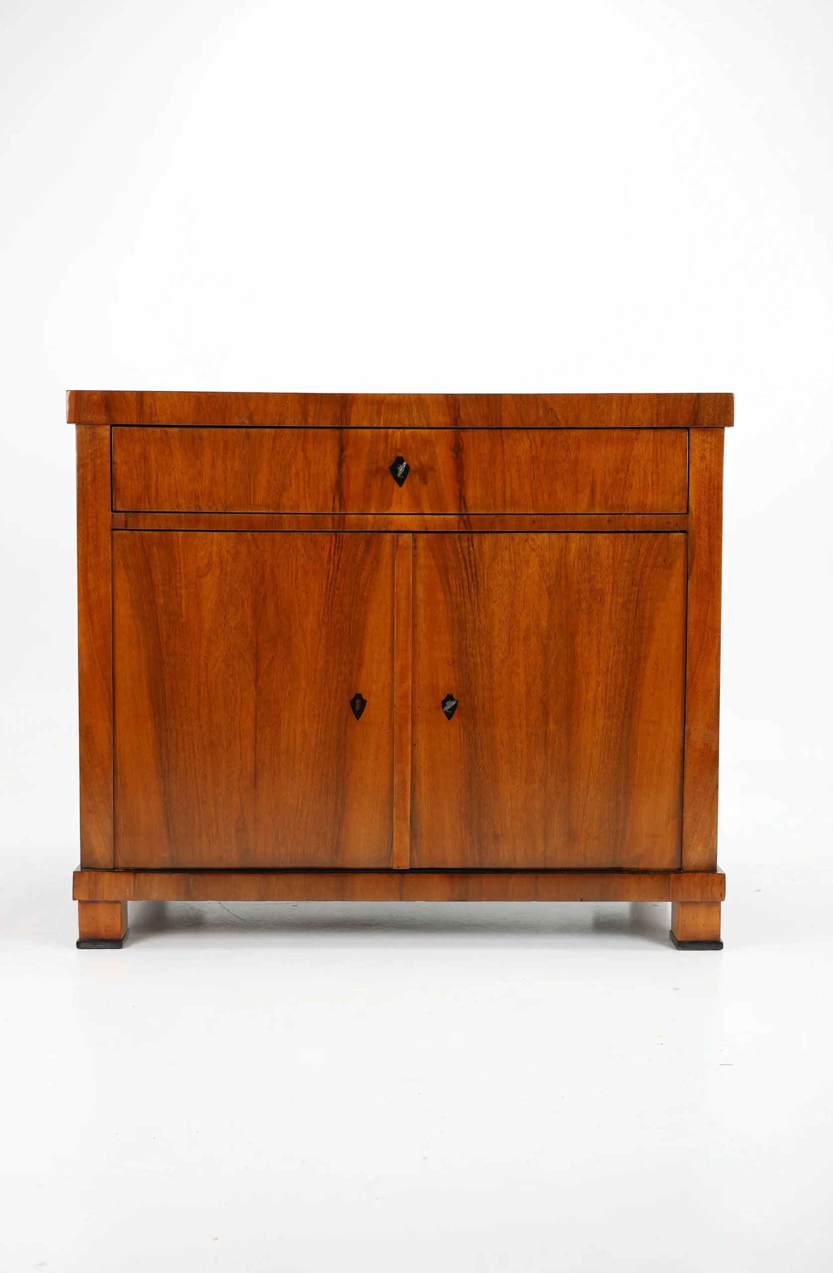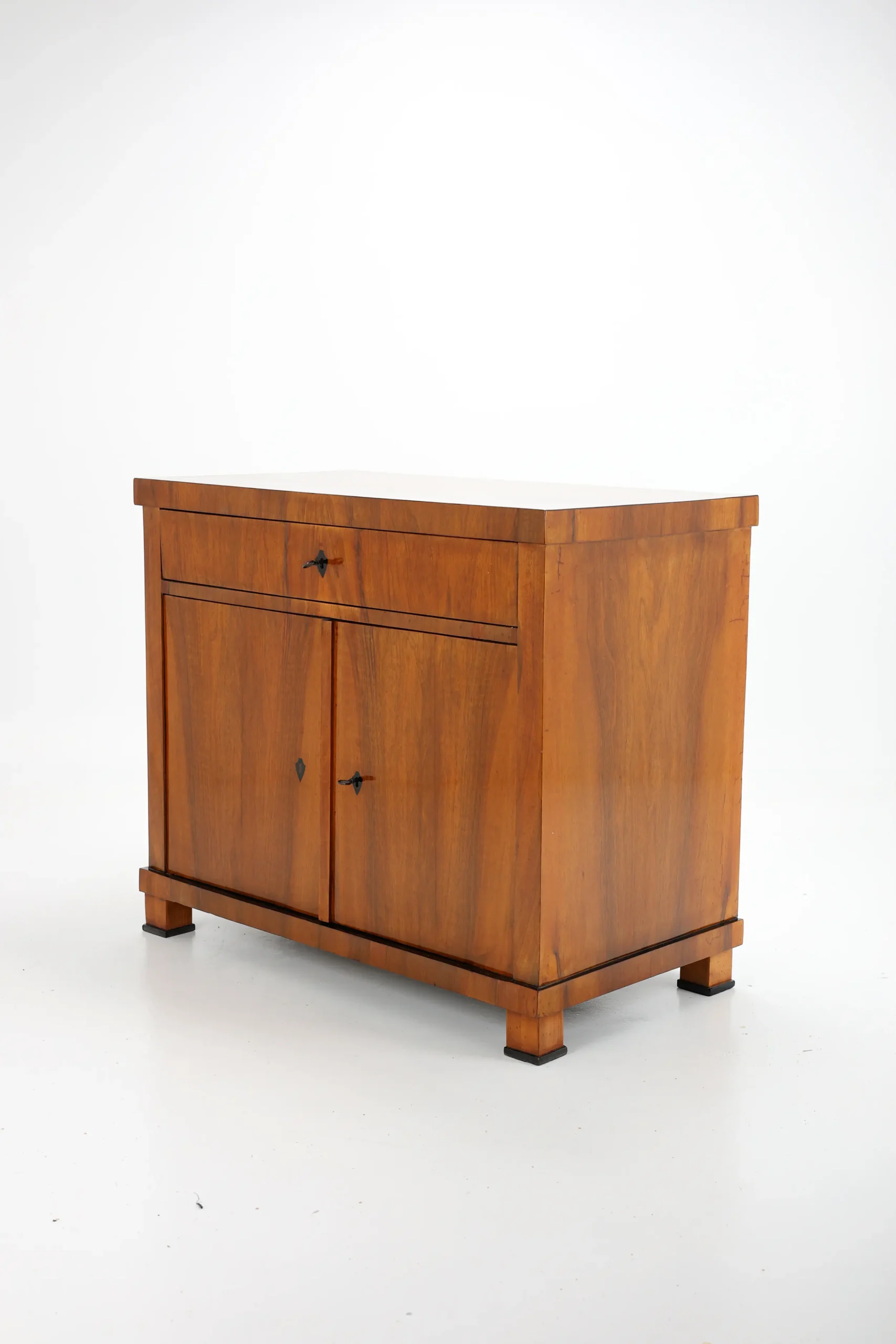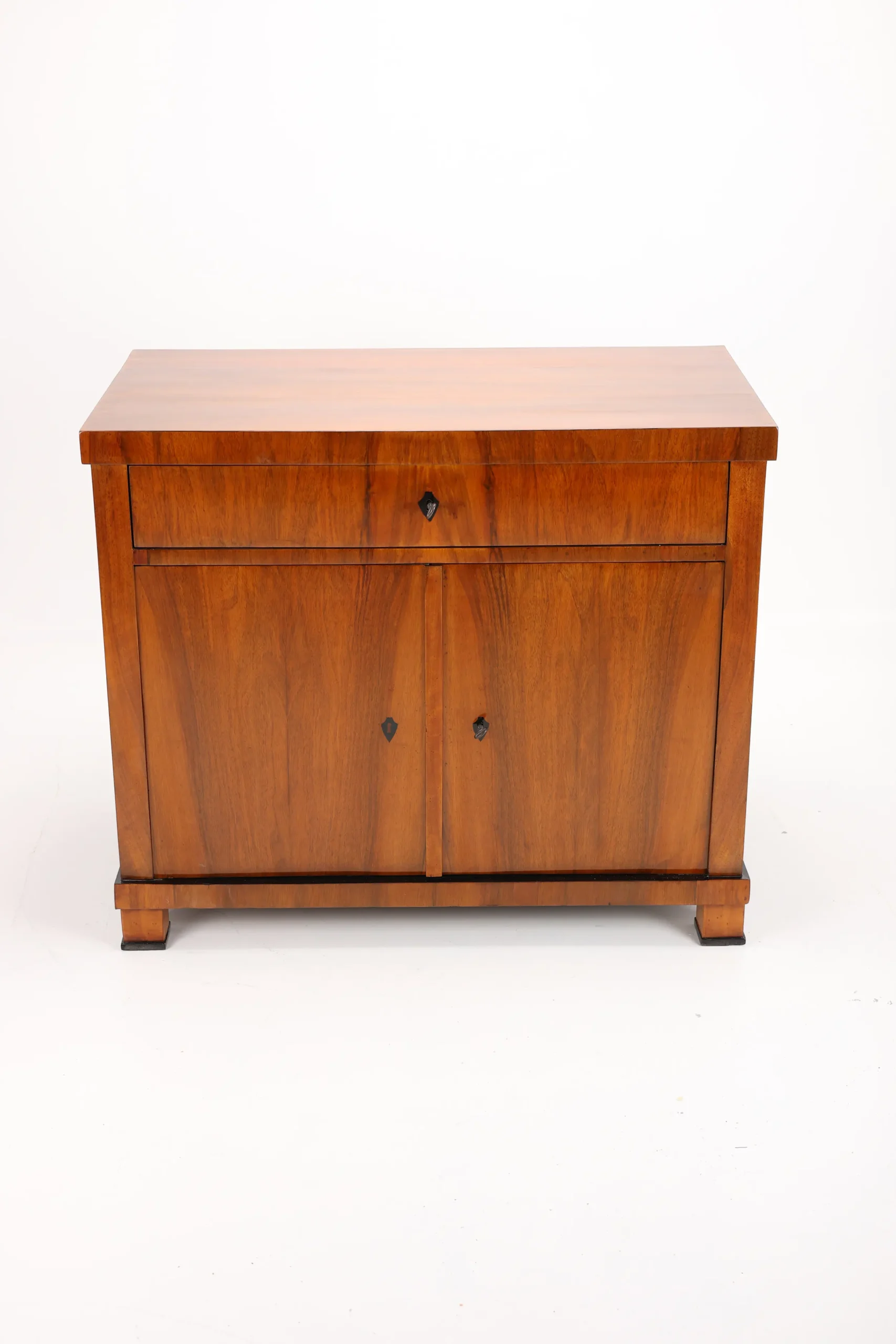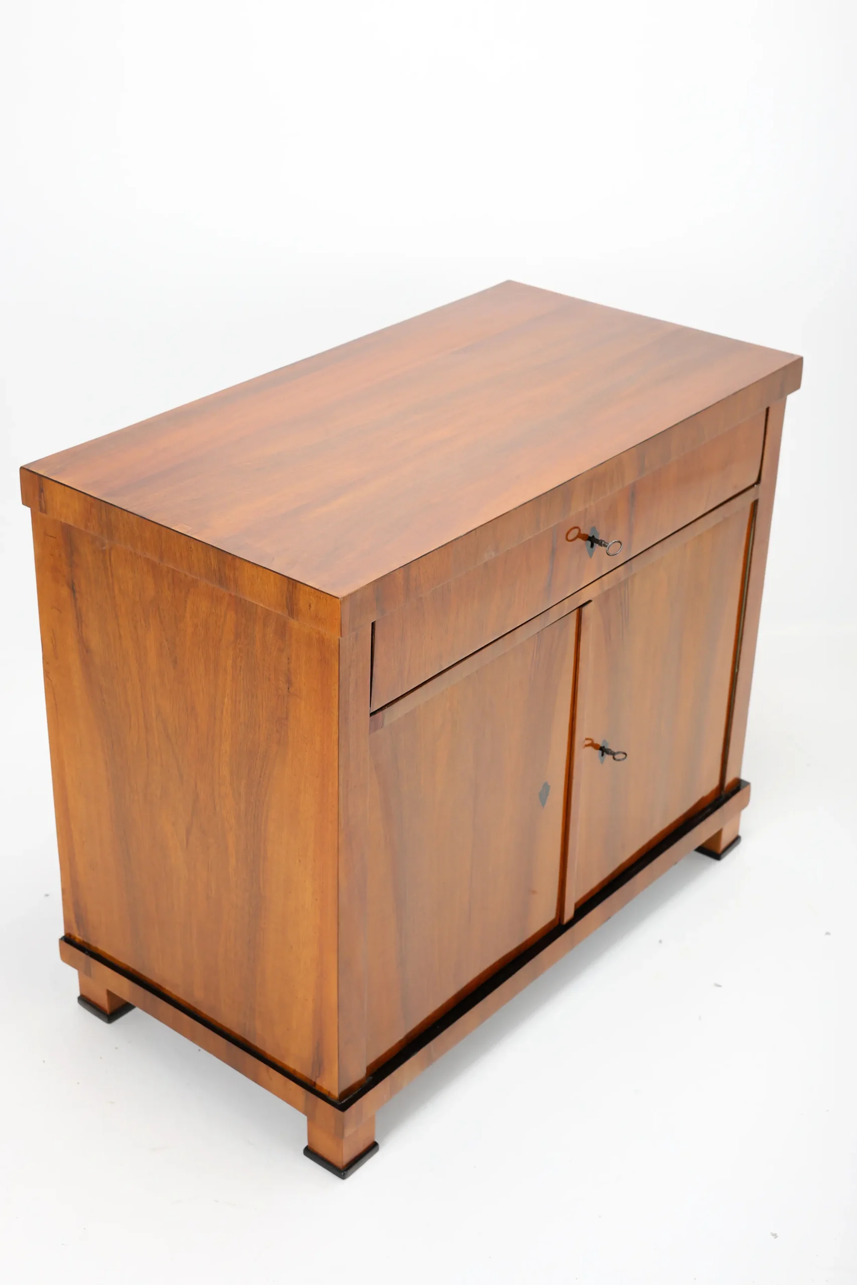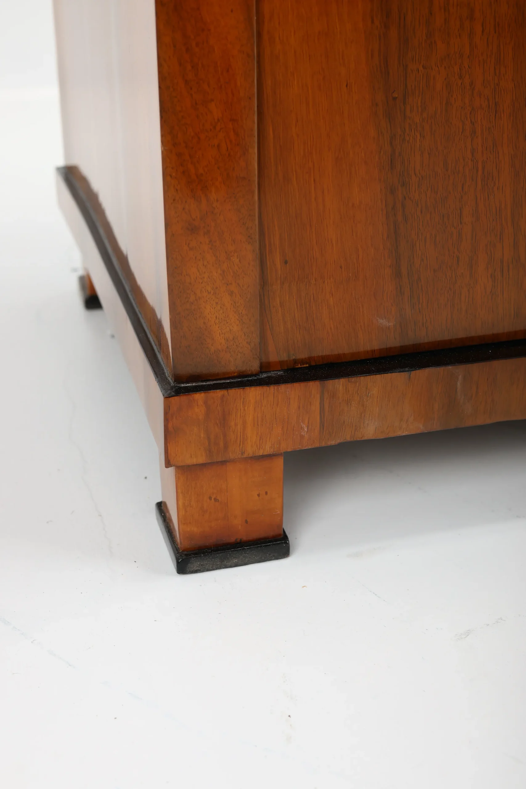 The cabinet stands gracefully upon block-shaped feet, beneath which lies a subtle ebonised-plated plinth, echoing the elegant details of the piece. A similar ebonised inlay decorates the edge of the top surface, framing the piece with a refined, understated flourish. This exquisite detail, a slender inlay of ebonised, not only adds a sense of sophistication but also firmly places the cabinet within the Biedermeier tradition, where craftsmanship and aesthetic harmony are paramount.