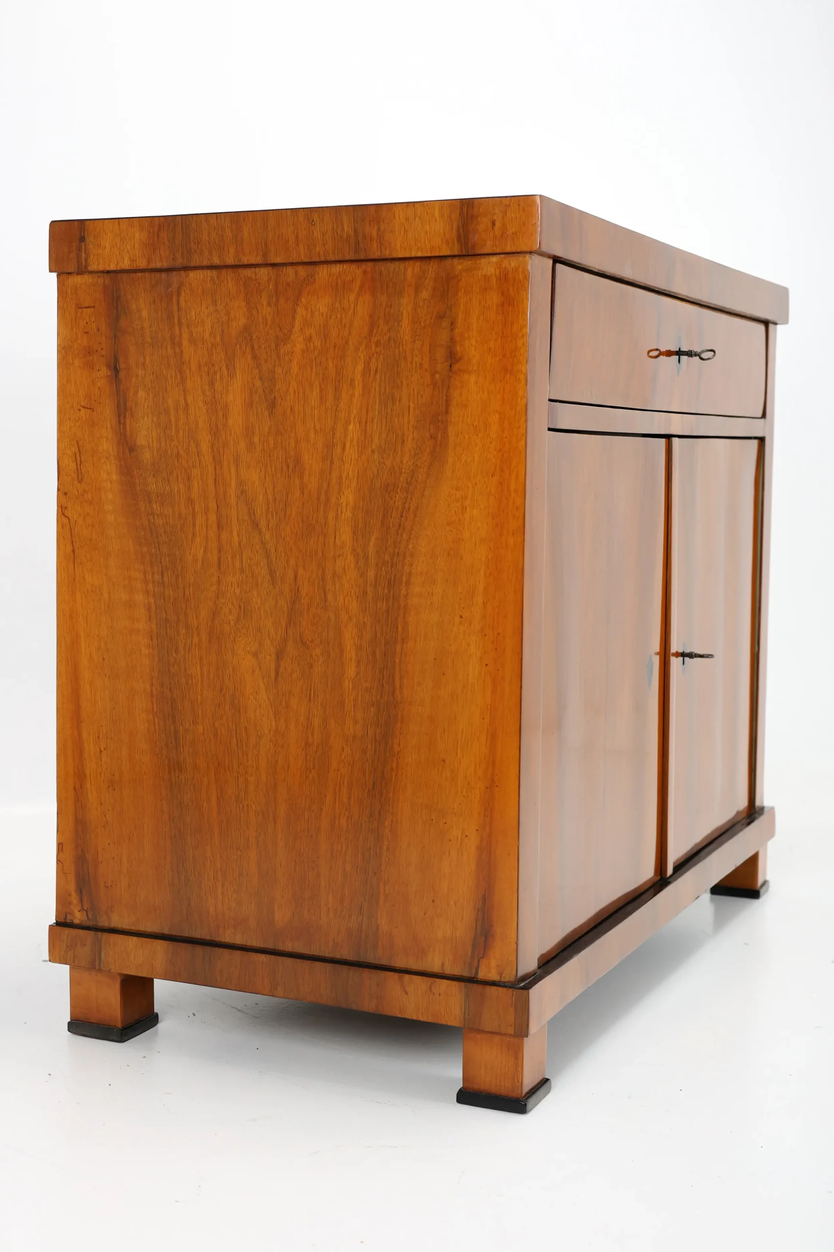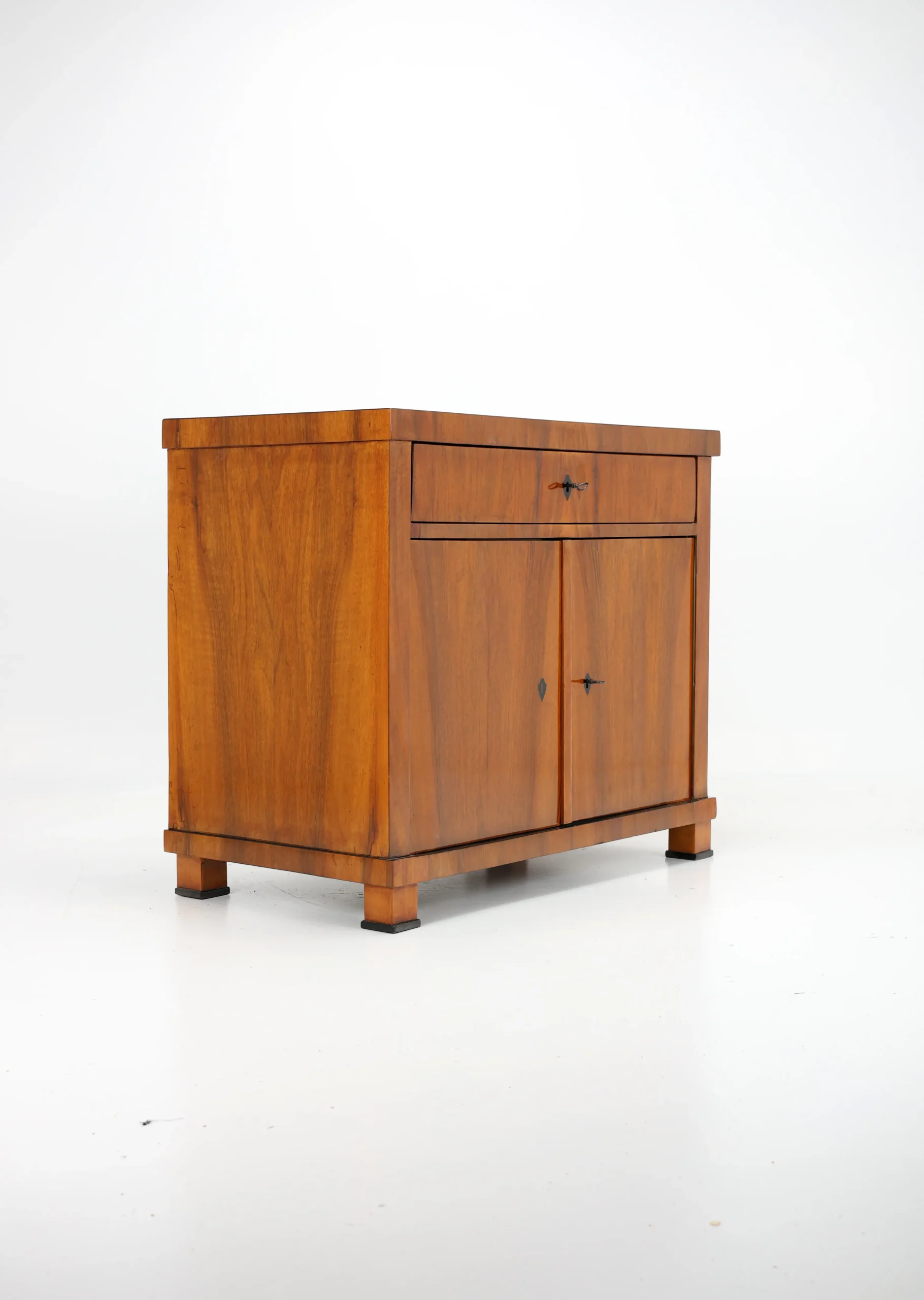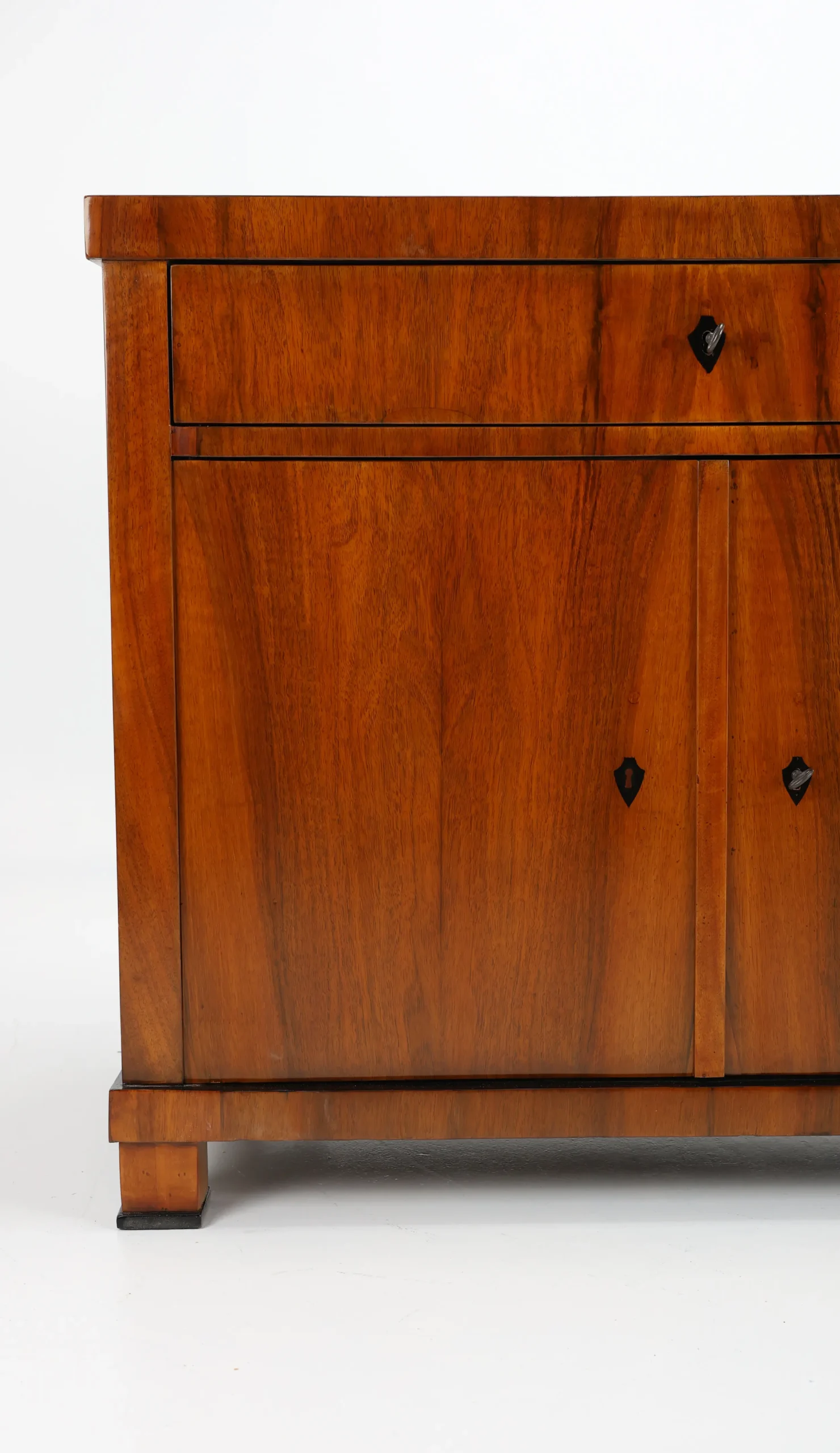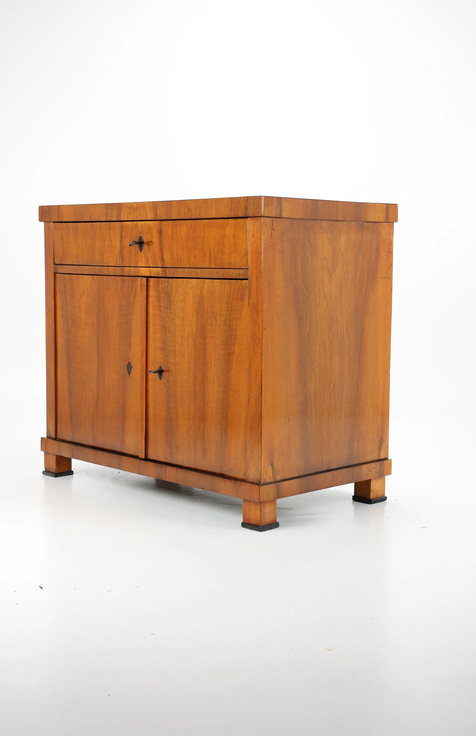 The cabinet stands gracefully upon block-shaped feet, beneath which lies a subtle ebonised-plated plinth, echoing the elegant details of the piece. A similar ebonised inlay decorates the edge of the top surface, framing the piece with a refined, understated flourish. This exquisite detail, a slender inlay of ebonised, not only adds a sense of sophistication but also firmly places the cabinet within the Biedermeier tradition, where craftsmanship and aesthetic harmony are paramount.