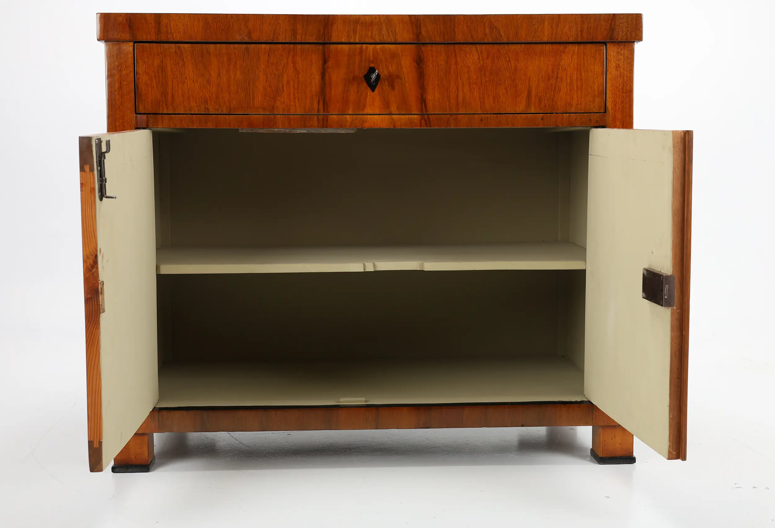 Exquisite piece, crafted in the early 19th century, is a stunning example of Biedermeier style, originating from southern Germany between 1820 and 1830. The beautifully executed veneer, with its harmonious grain pattern, enriches the overall aesthetic of the cabinet, bringing an elegant and timeless charm to any setting.