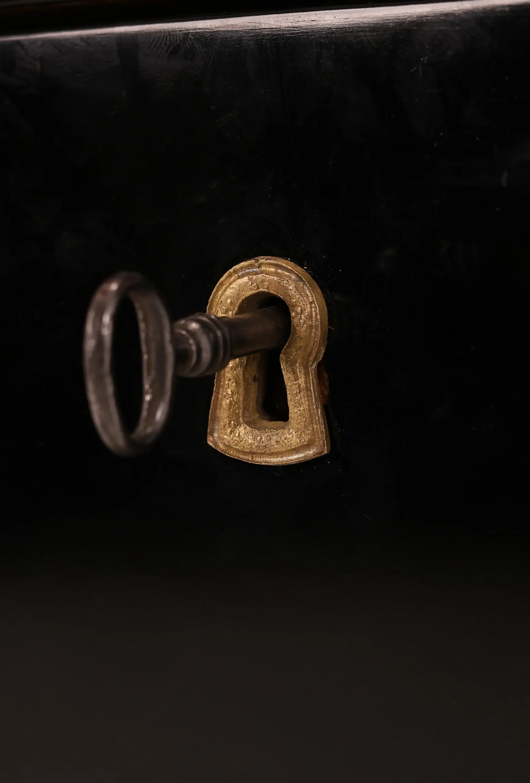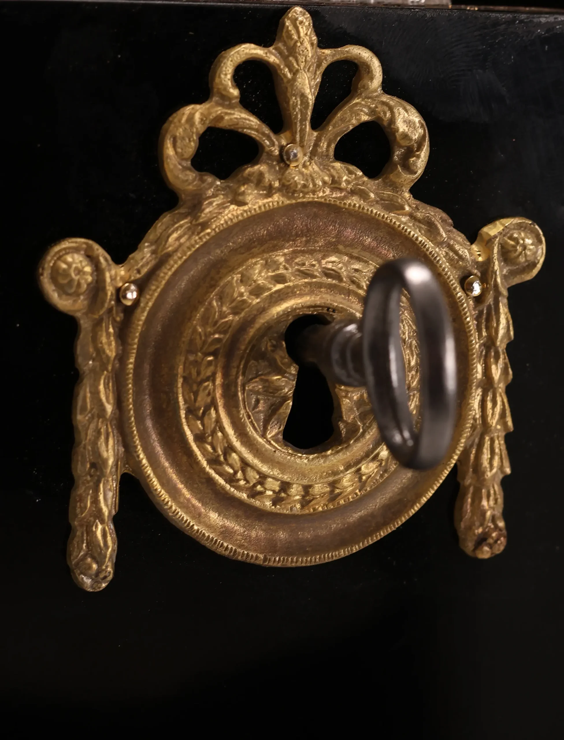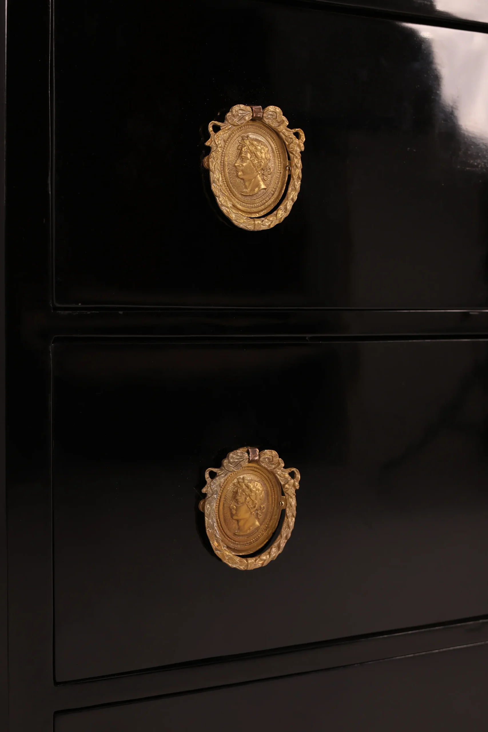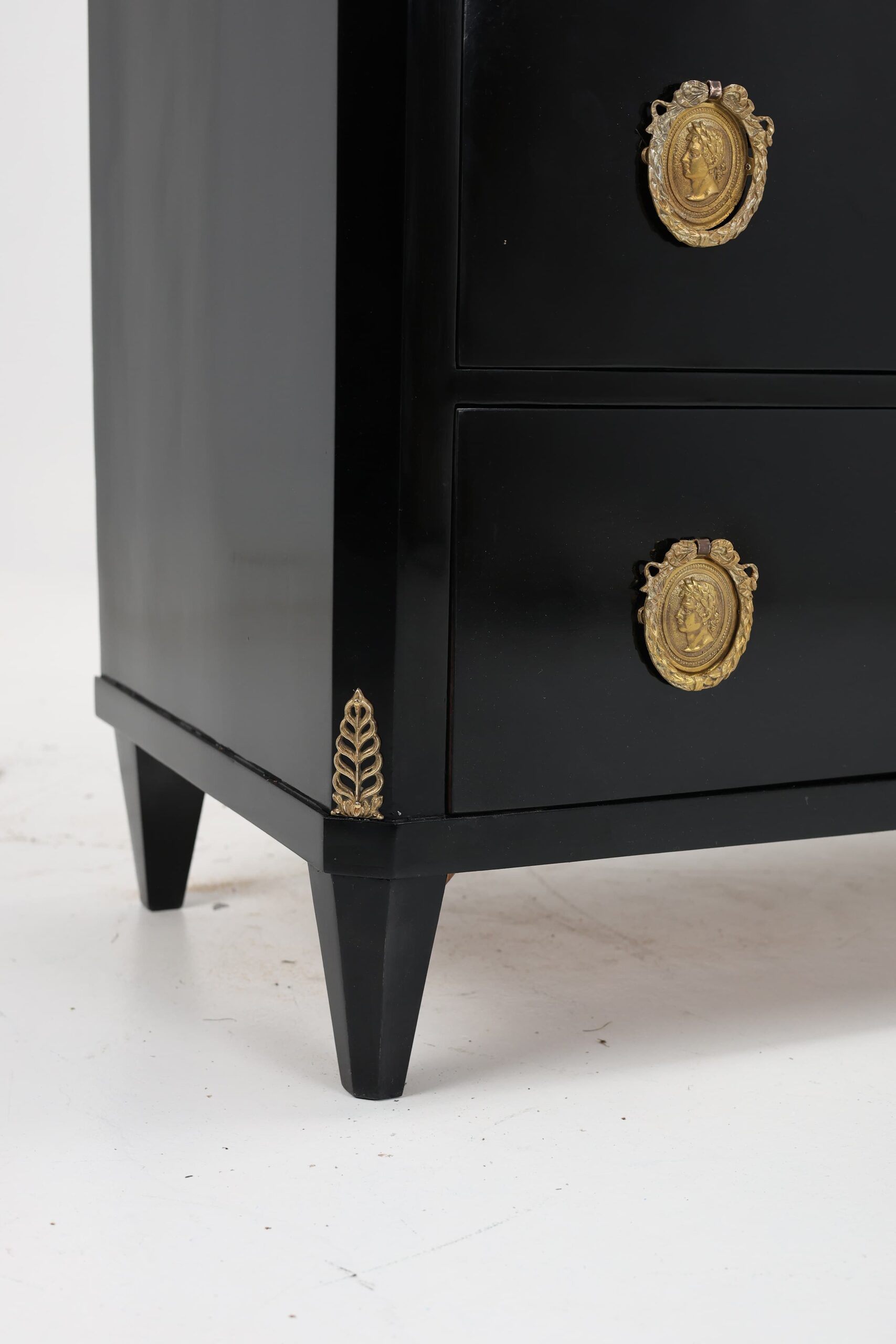 The desk’s surface has been expertly ebonised, providing a striking black finish that exudes sophistication and timeless charm. The bronze fittings adorning the front are a testament to the craftsmanship of the era, adding an element of opulence and grandeur.