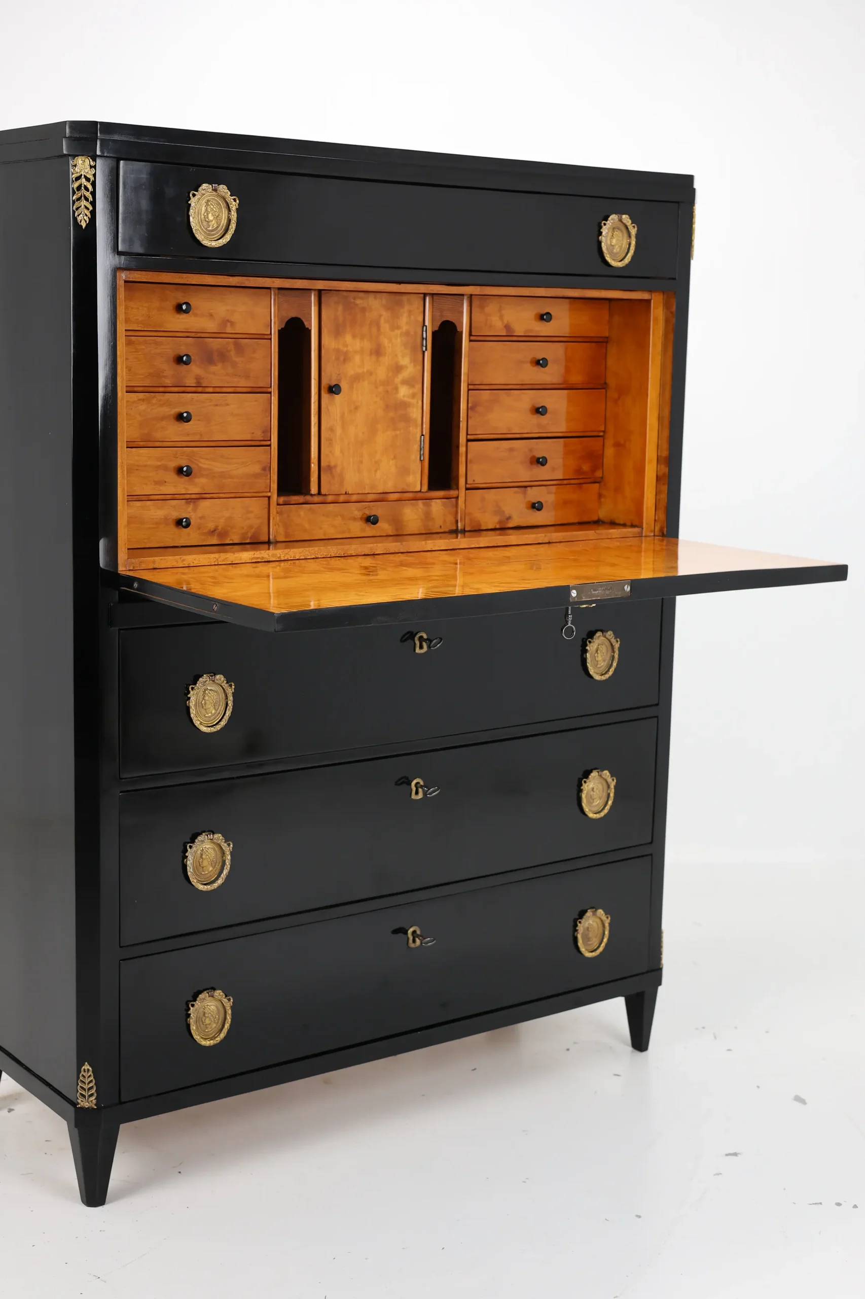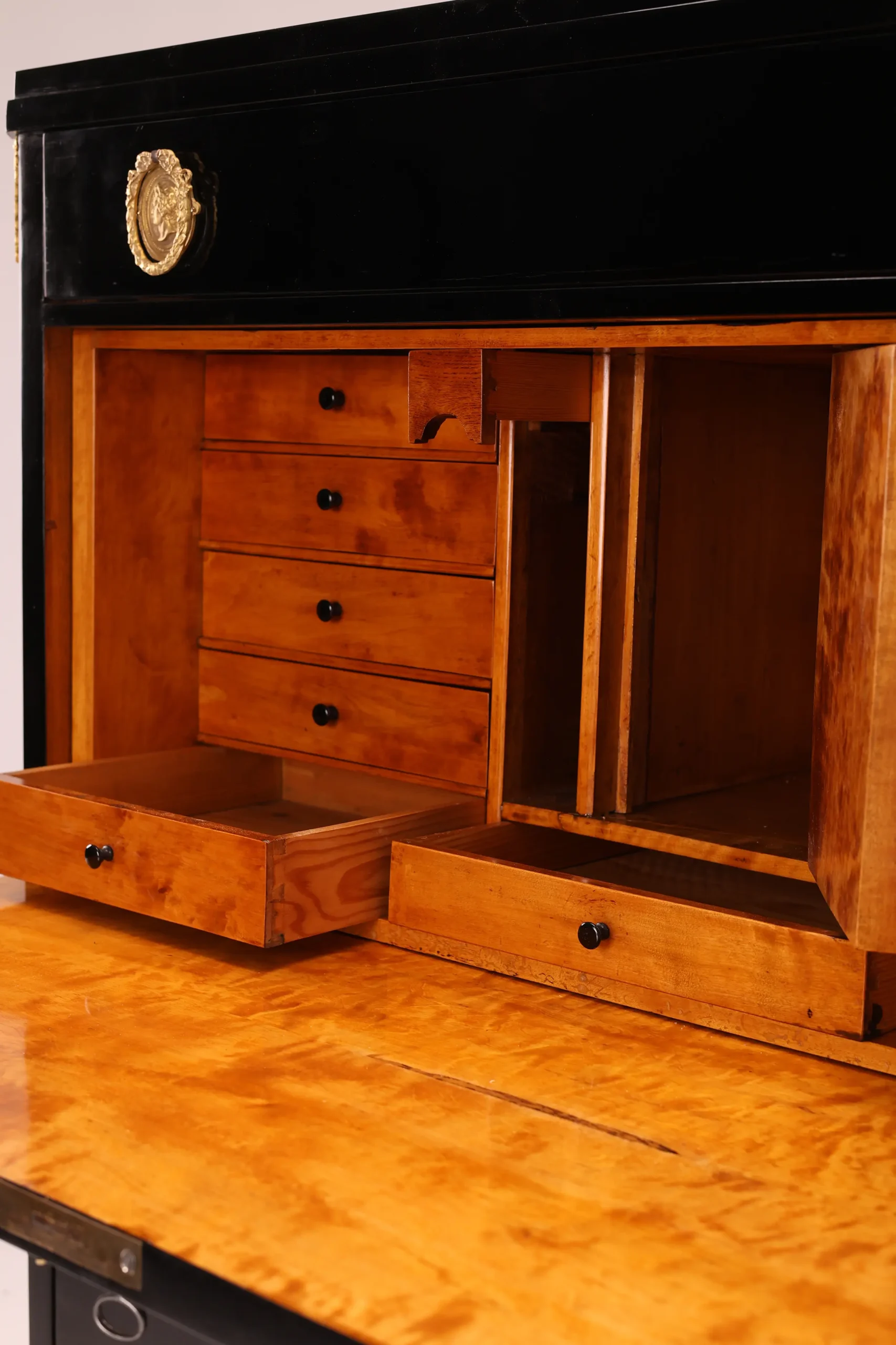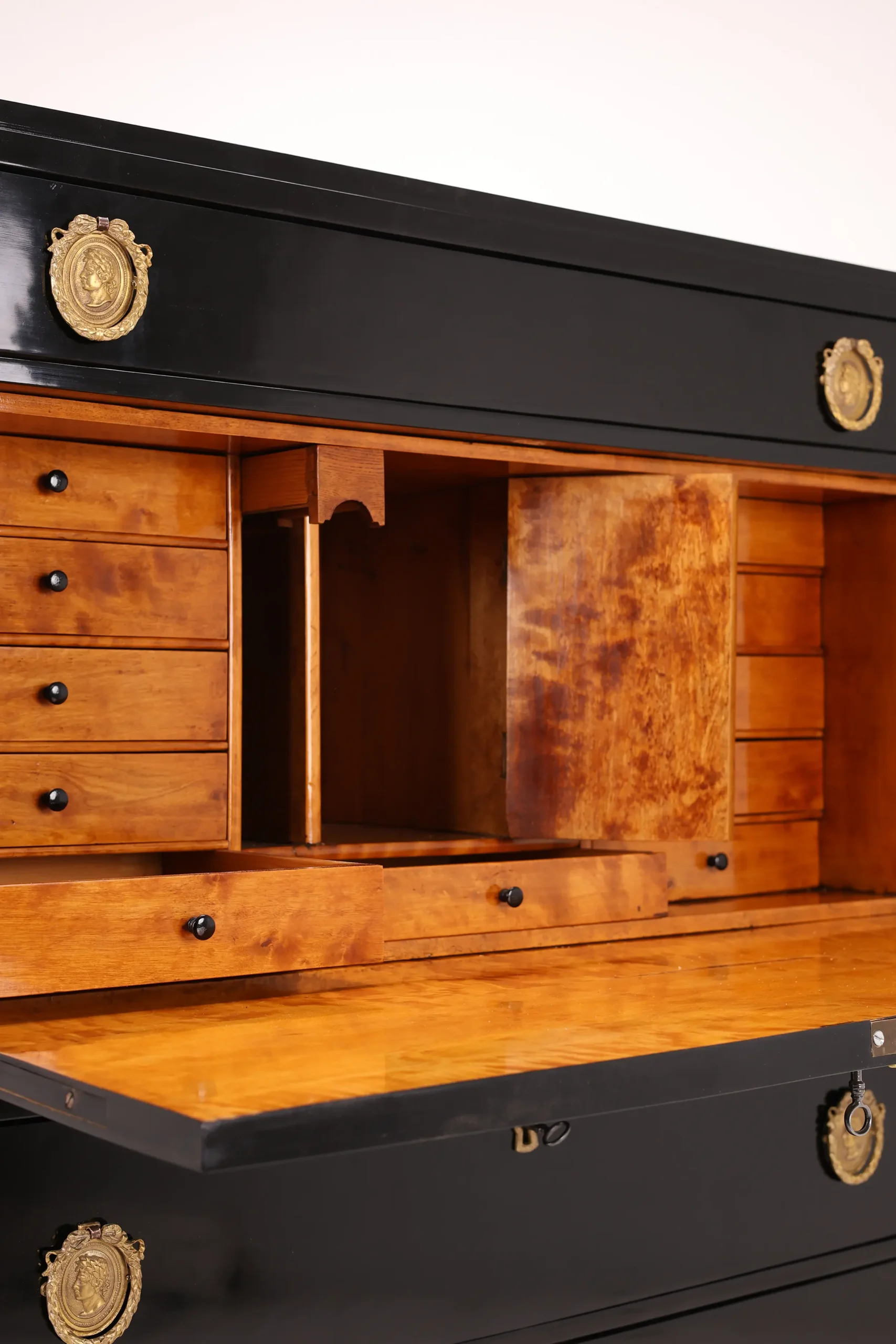 Upon opening the flap, one is greeted by a beautifully contrasting interior cabinet in warm tones, featuring numerous practical drawers and a functional flap that serves as a writing surface. This feature adds both practicality and an inviting warmth to the piece, making it perfect for writing or correspondence.