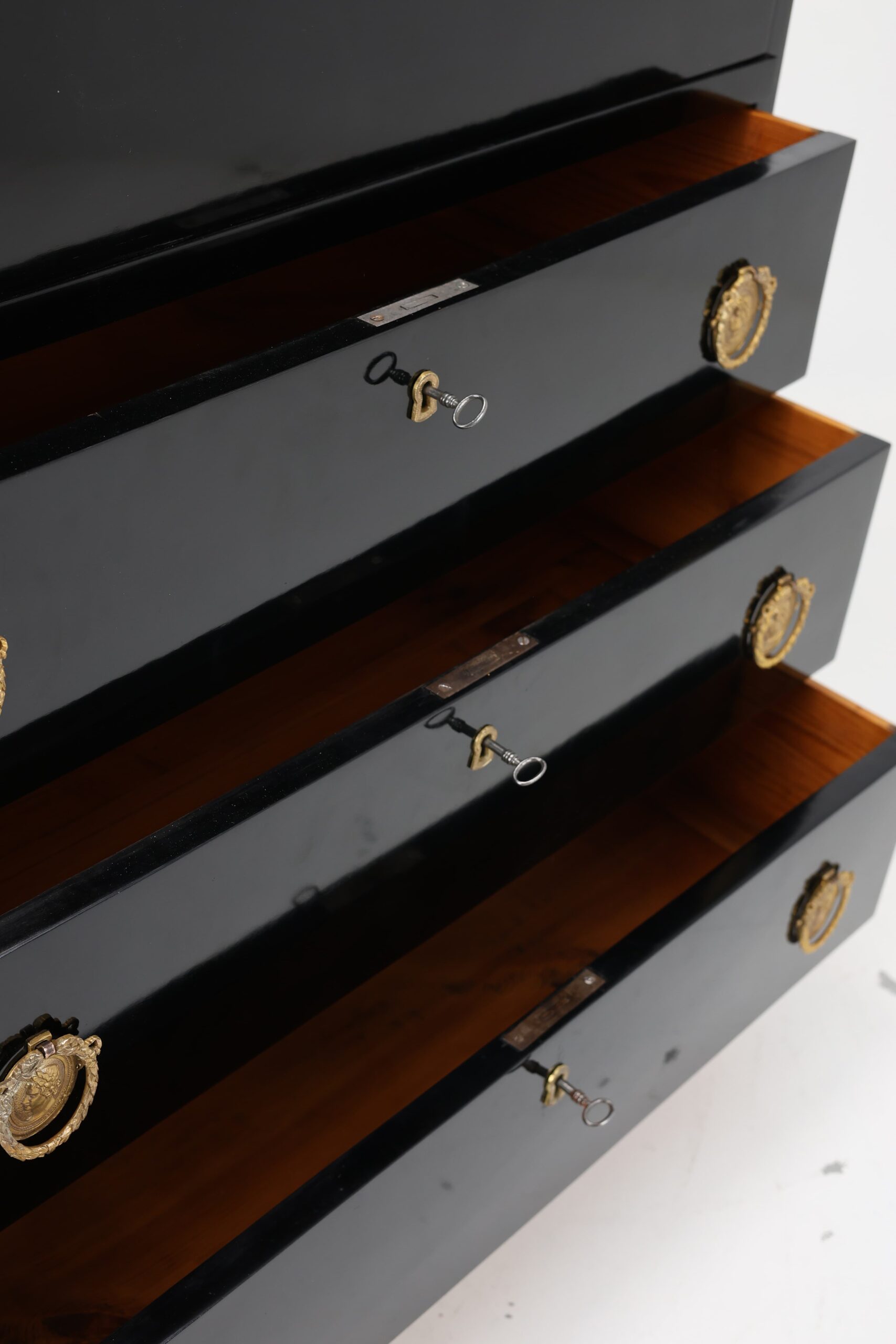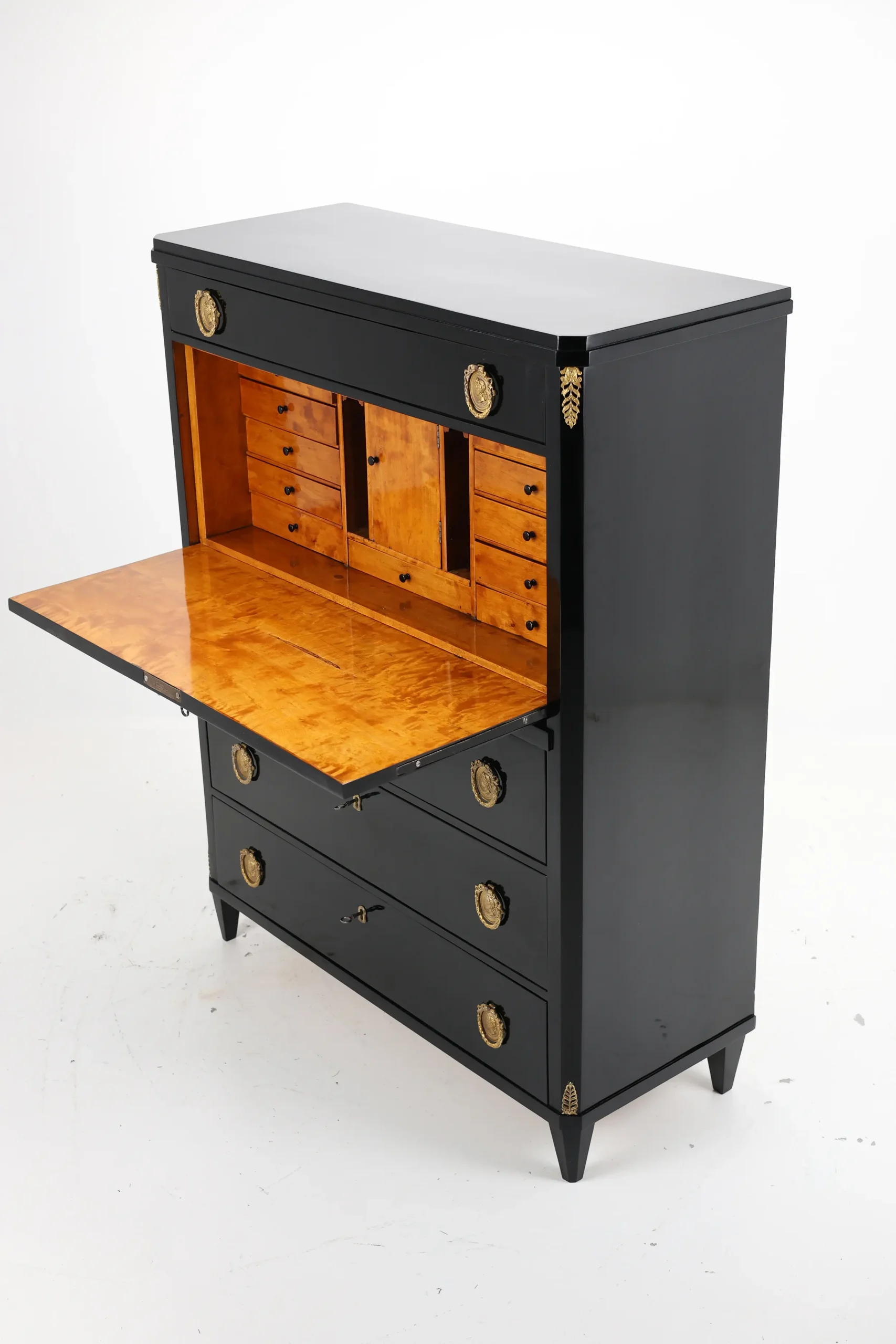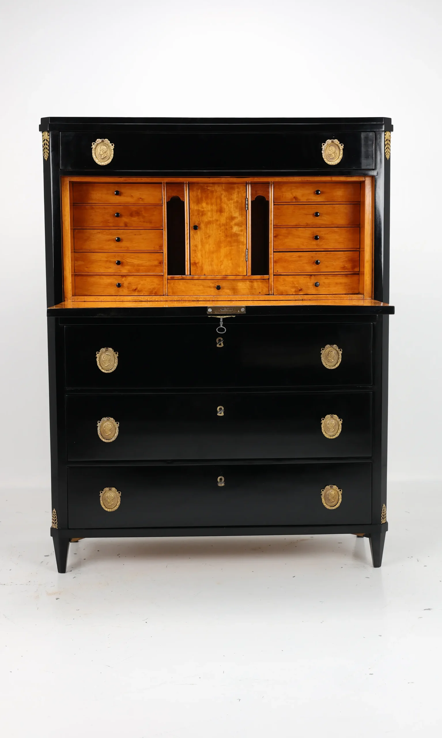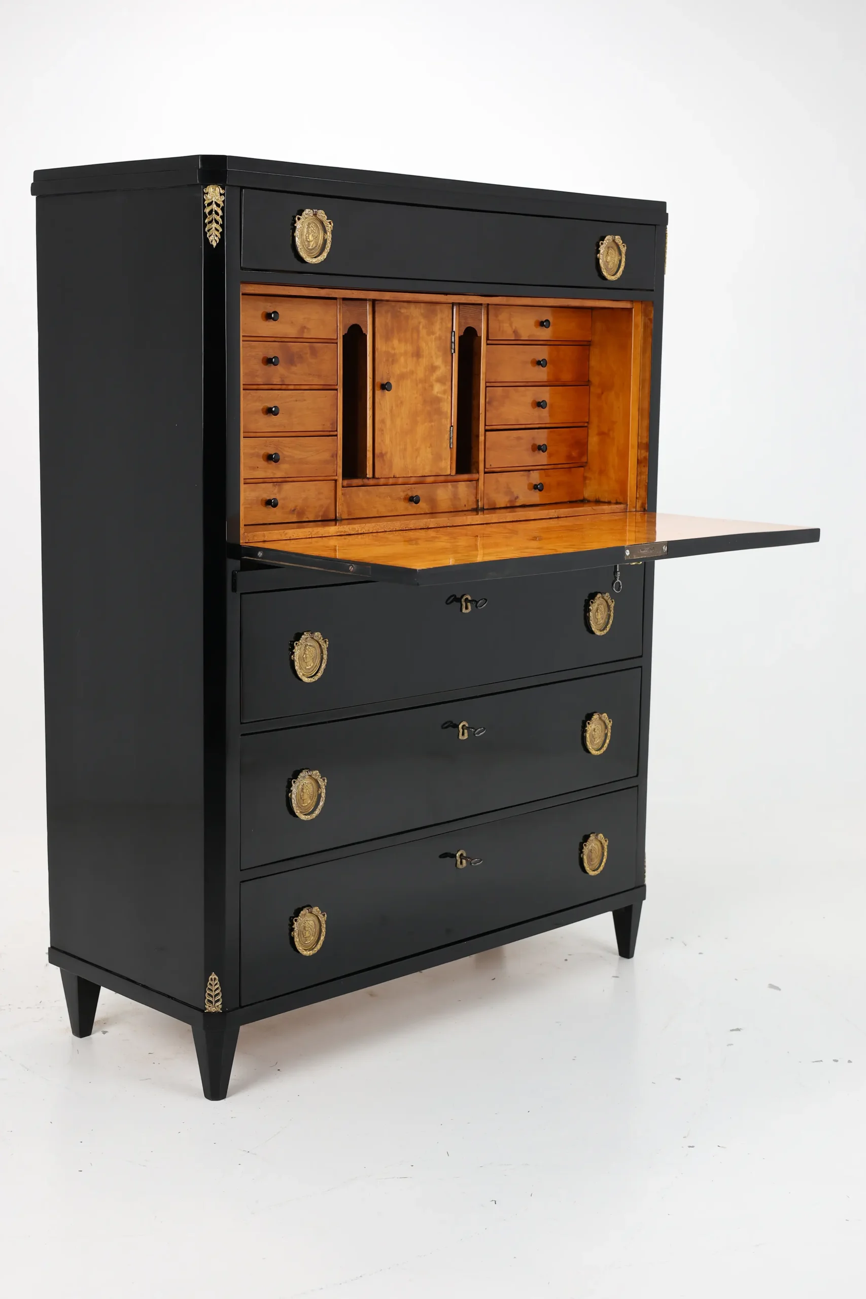 Upon opening the flap, one is greeted by a beautifully contrasting interior cabinet in warm tones, featuring numerous practical drawers and a functional flap that serves as a writing surface. This feature adds both practicality and an inviting warmth to the piece, making it perfect for writing or correspondence.