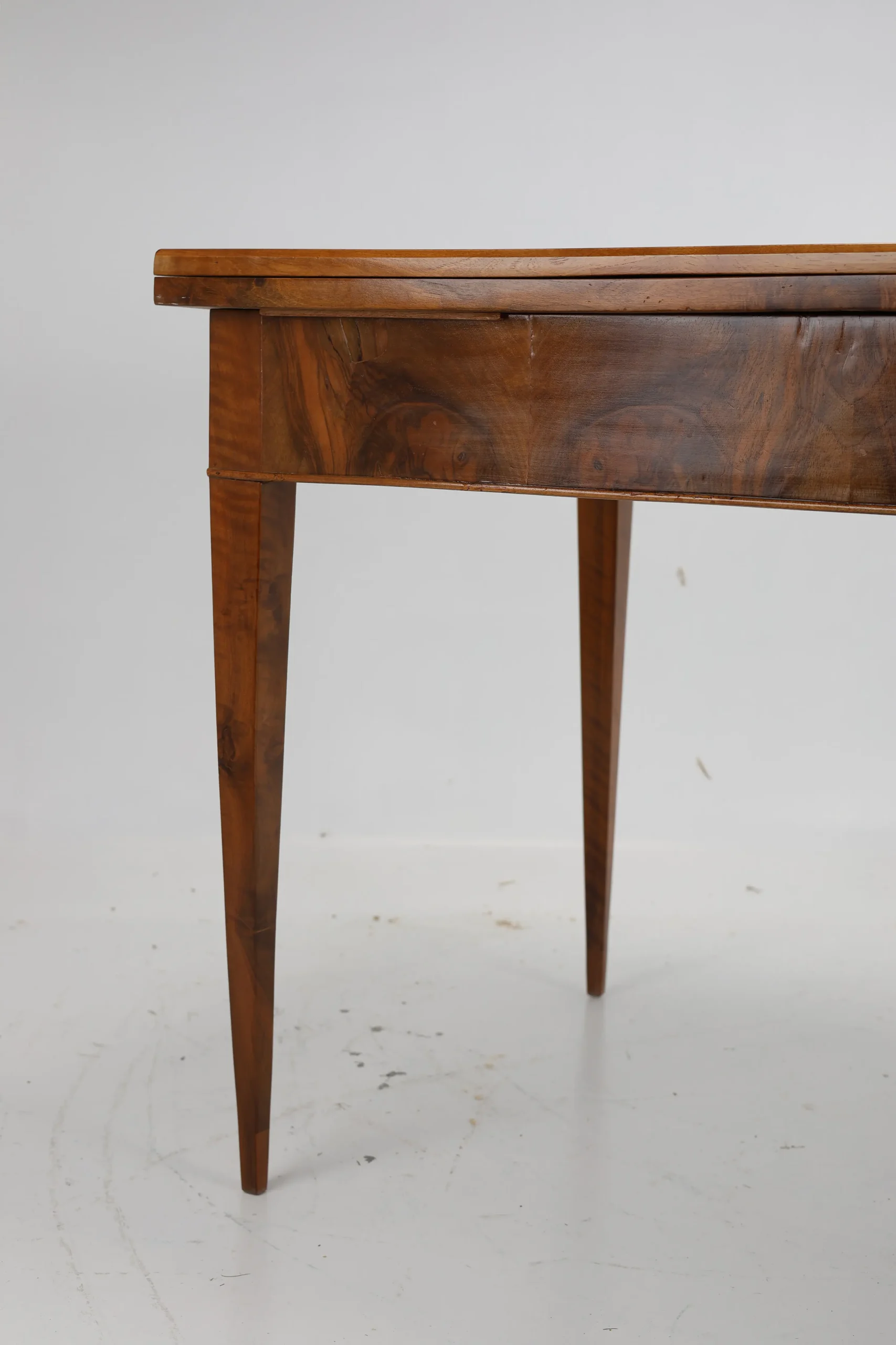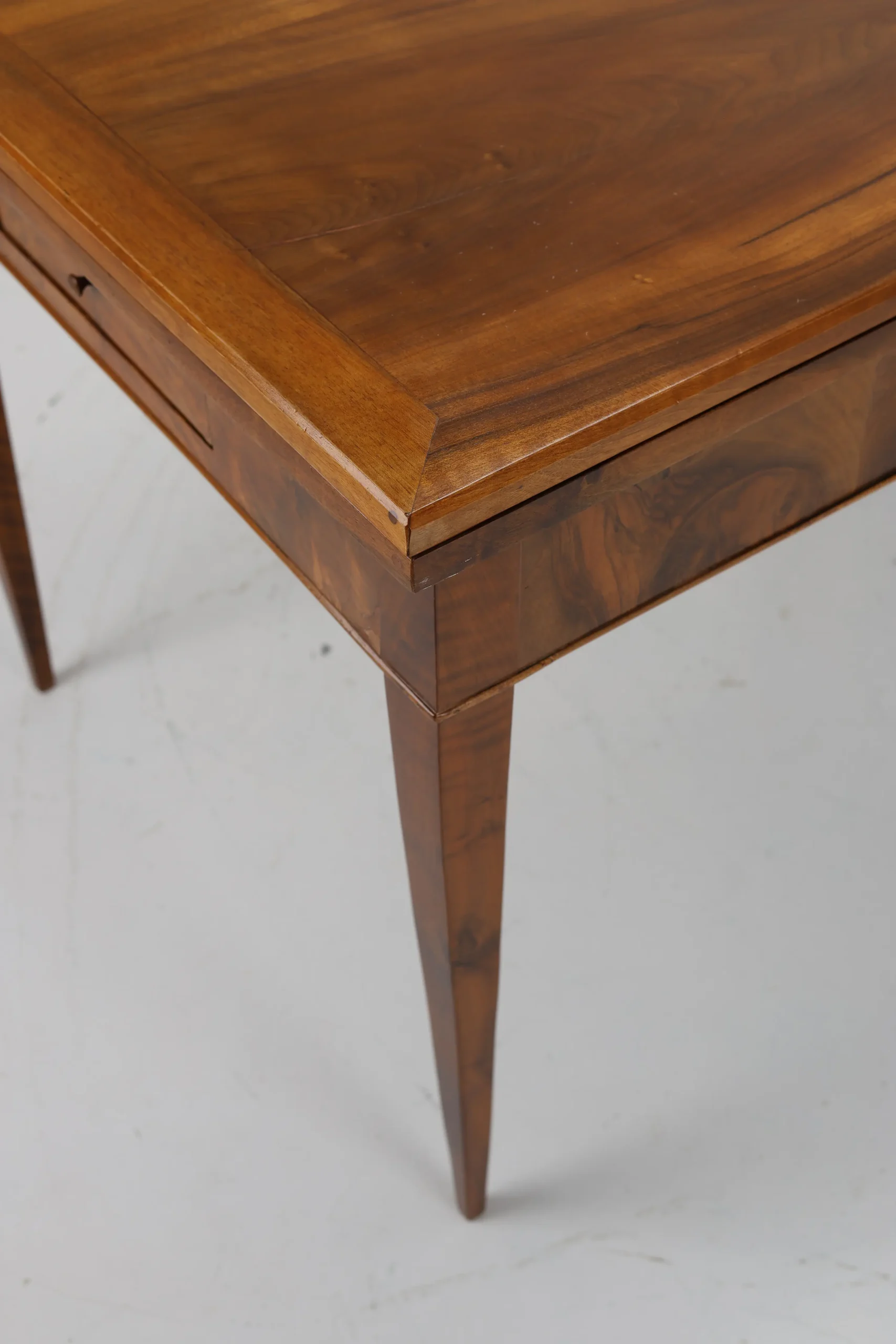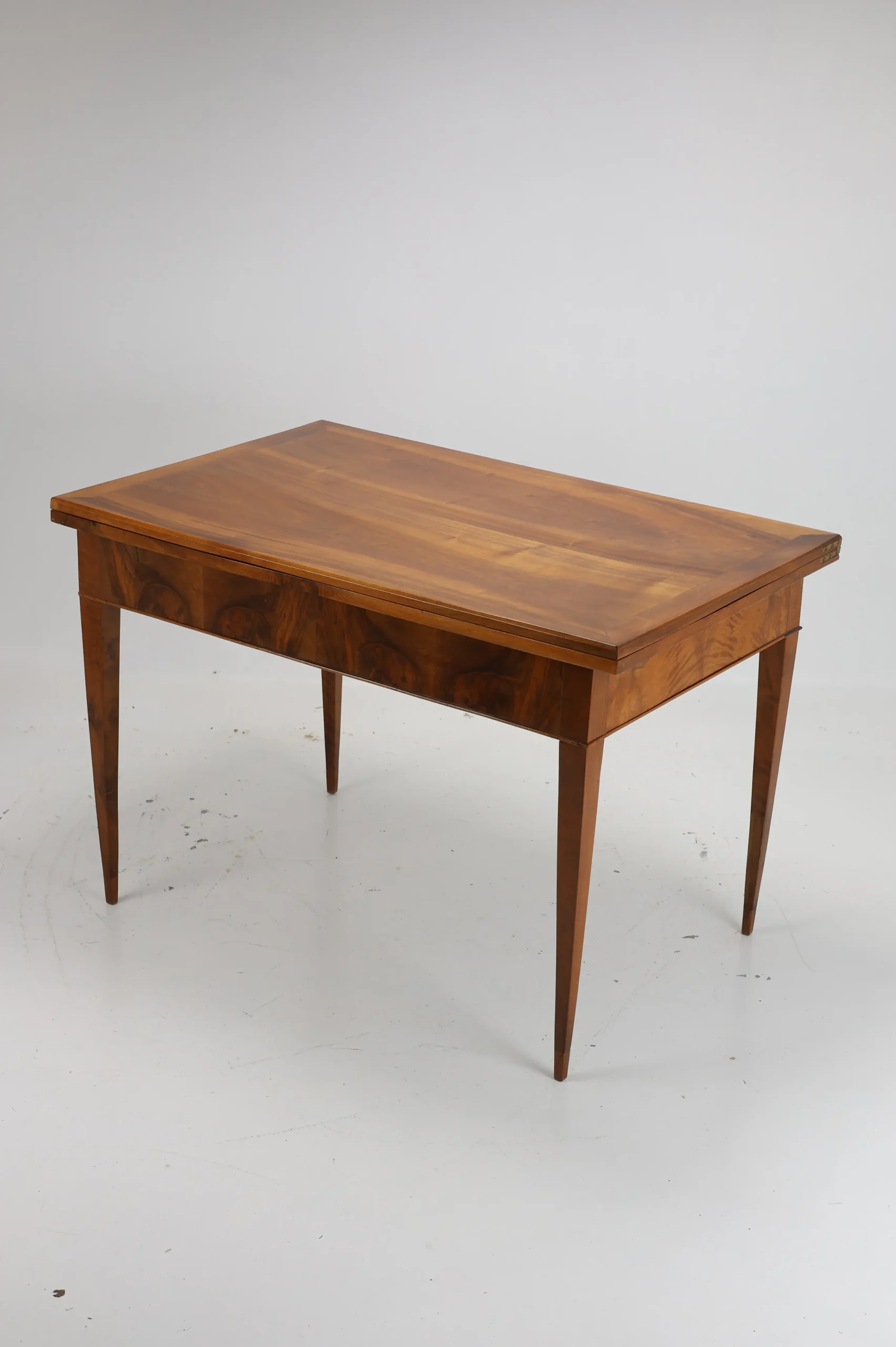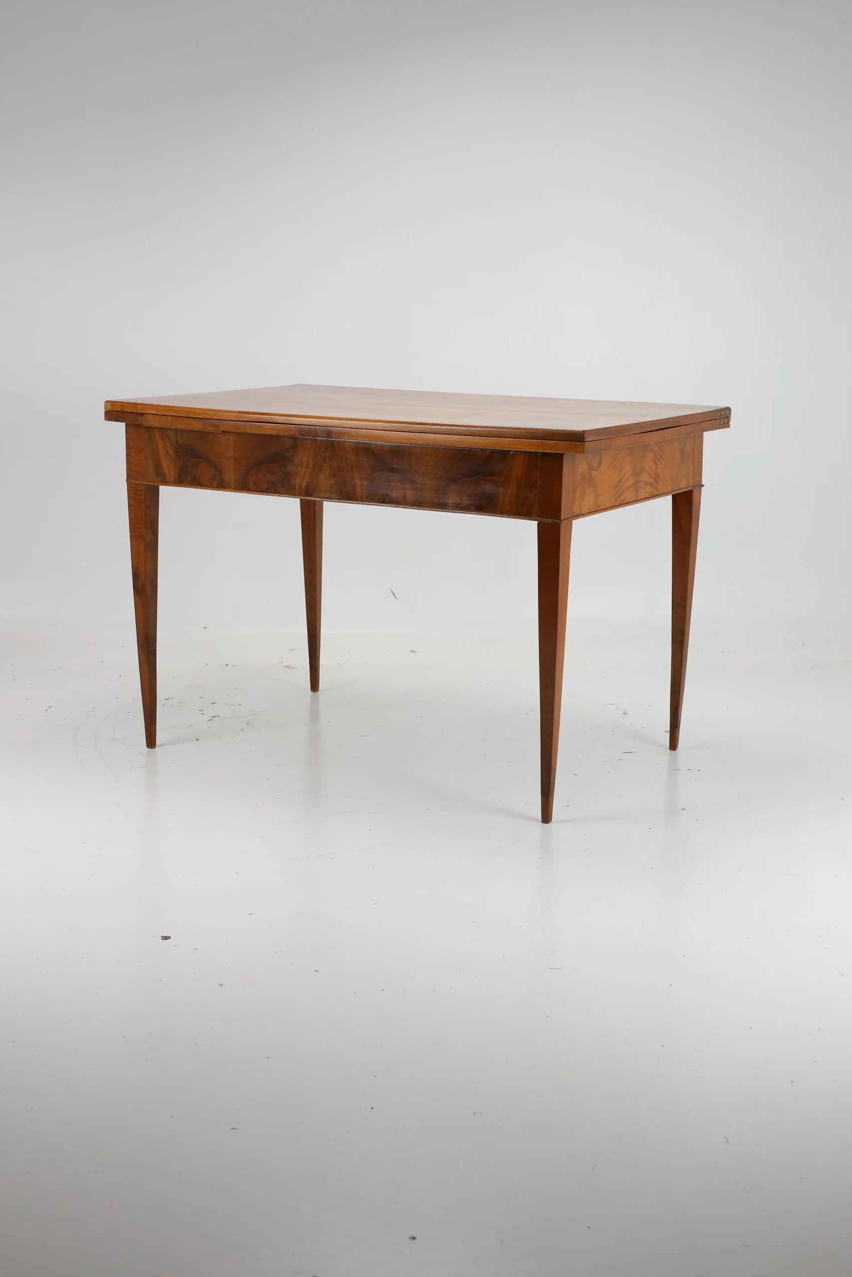 Original Biedermeier dining table, dating back to around 1820, is a true testament to the elegance and craftsmanship of the era. Made from solid walnut wood, it showcases a stunning and harmonious grain pattern that adds a touch of warmth and sophistication.