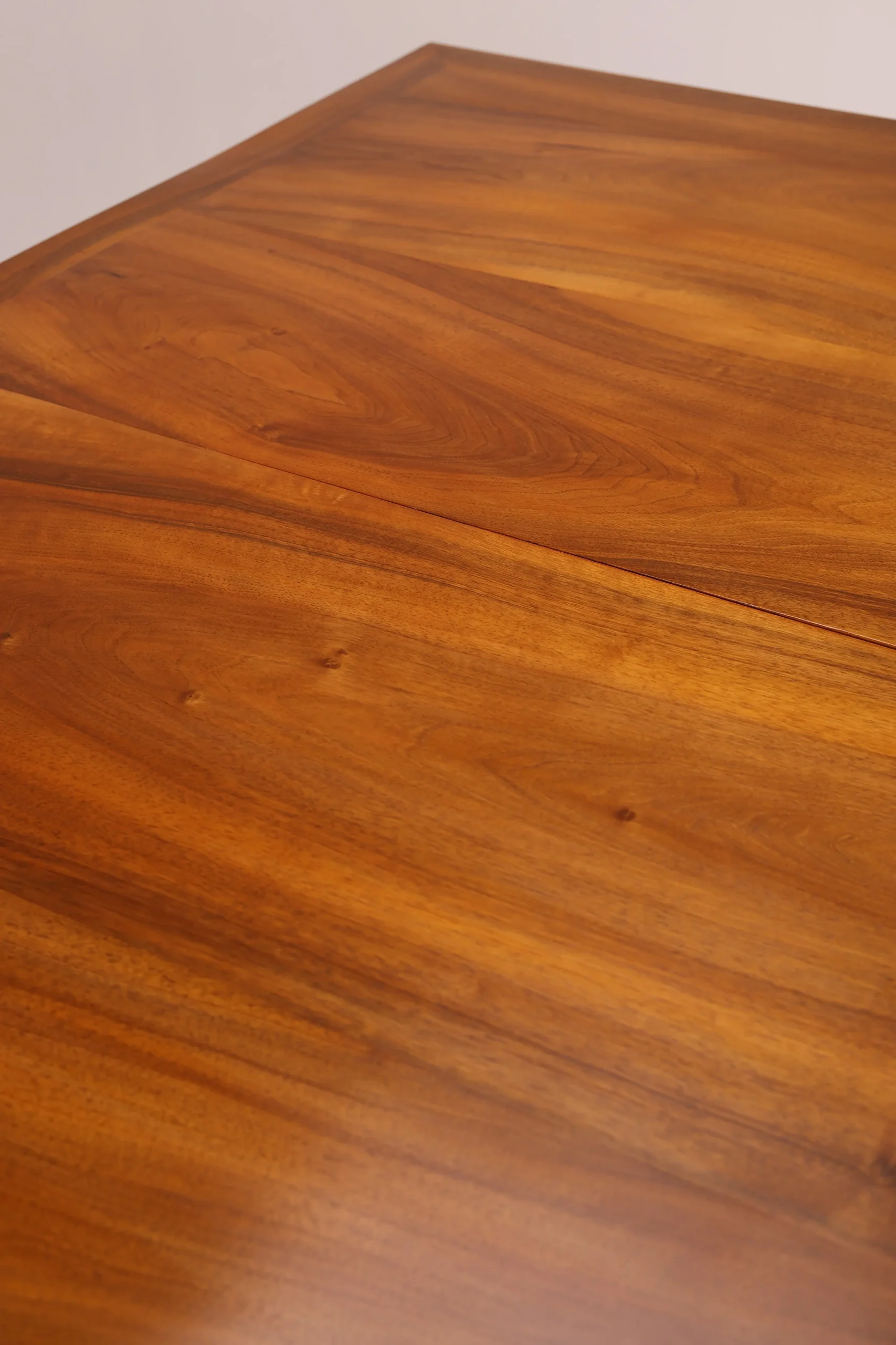 The tabletop is crafted from solid walnut, finished with a subtle satin oil that is both practical and visually appealing, while the apron is veneered and polished to a high sheen.