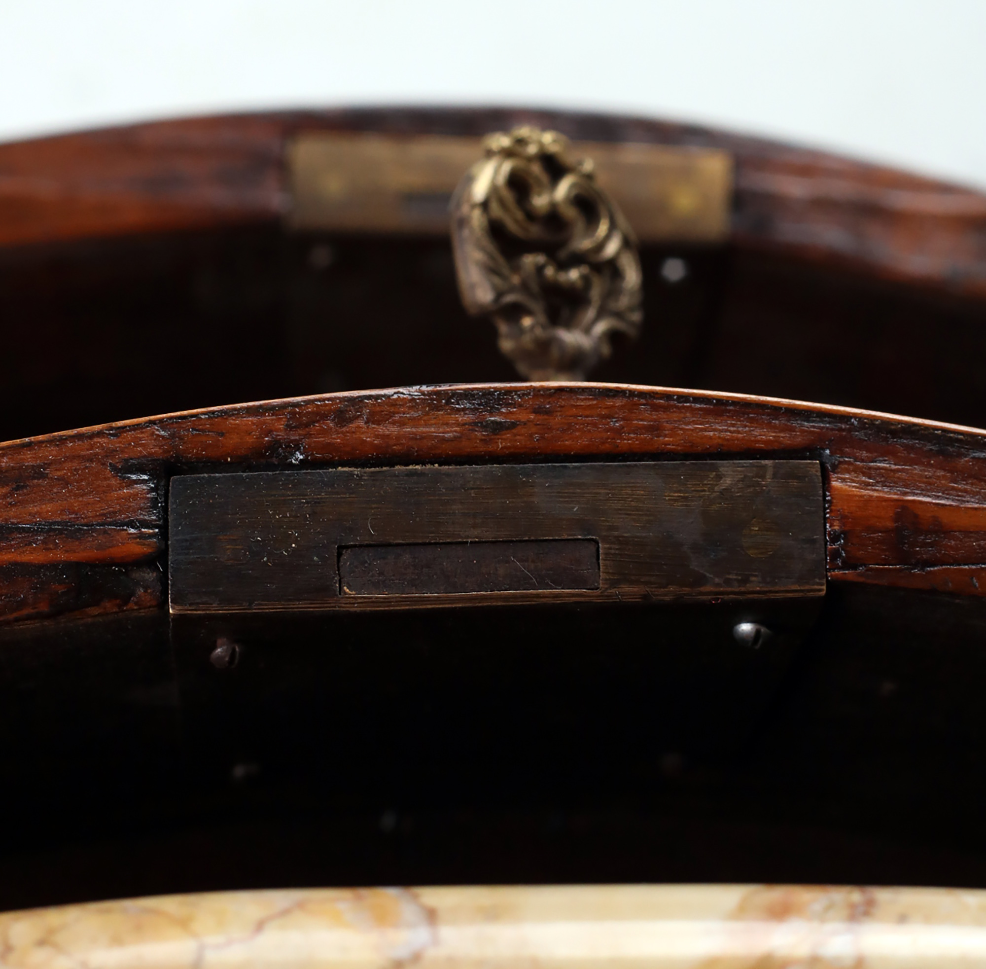 The two drawers have bronze handles and escutcheons and the wood veneer is warm and rich. The marquetry cube on the sides is a work of trompe-l’œil artistry, creating a 3D effect that adds to the overall beauty. Bronze mounts and cabriole legs complete the elegant shape, without being too ornate.