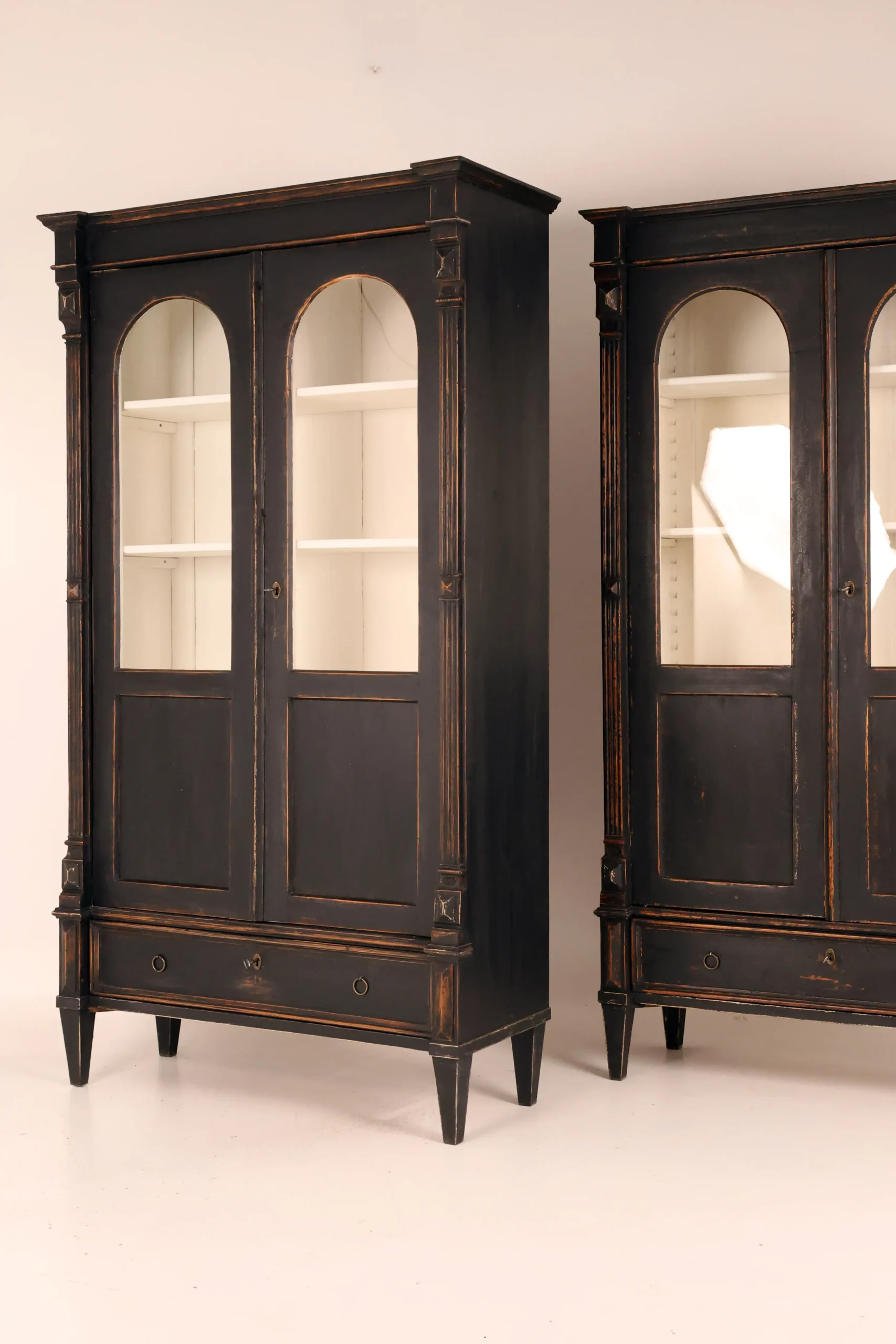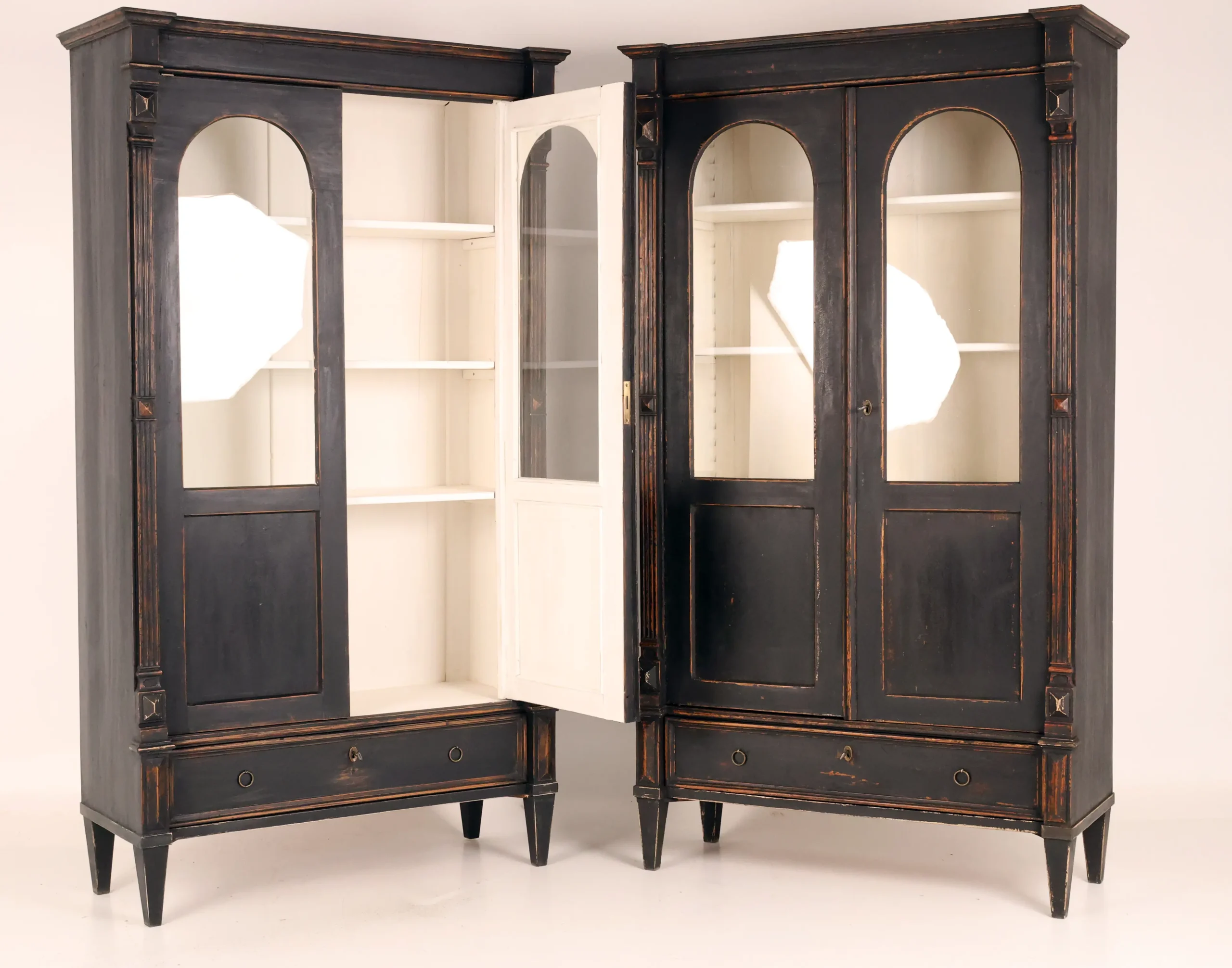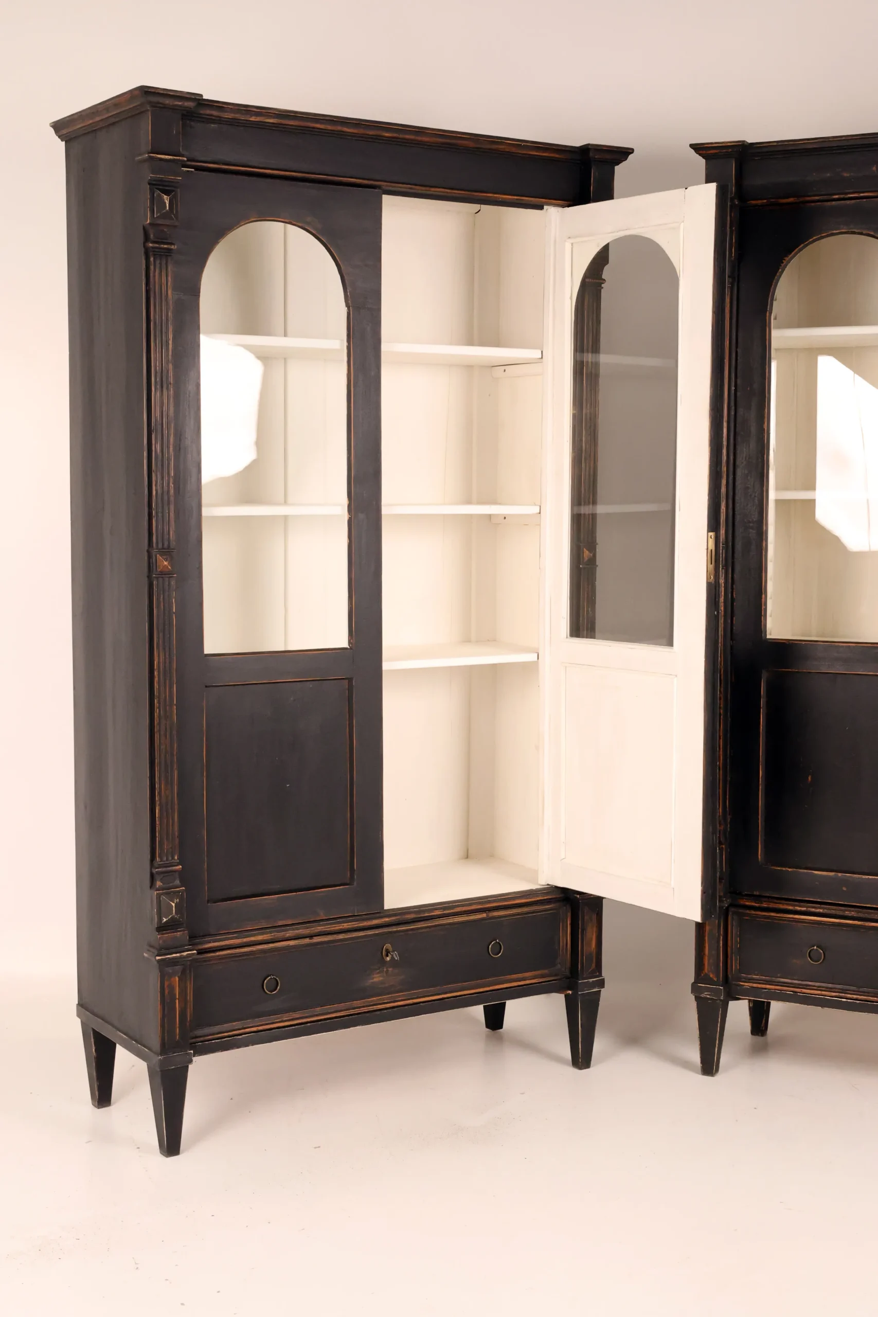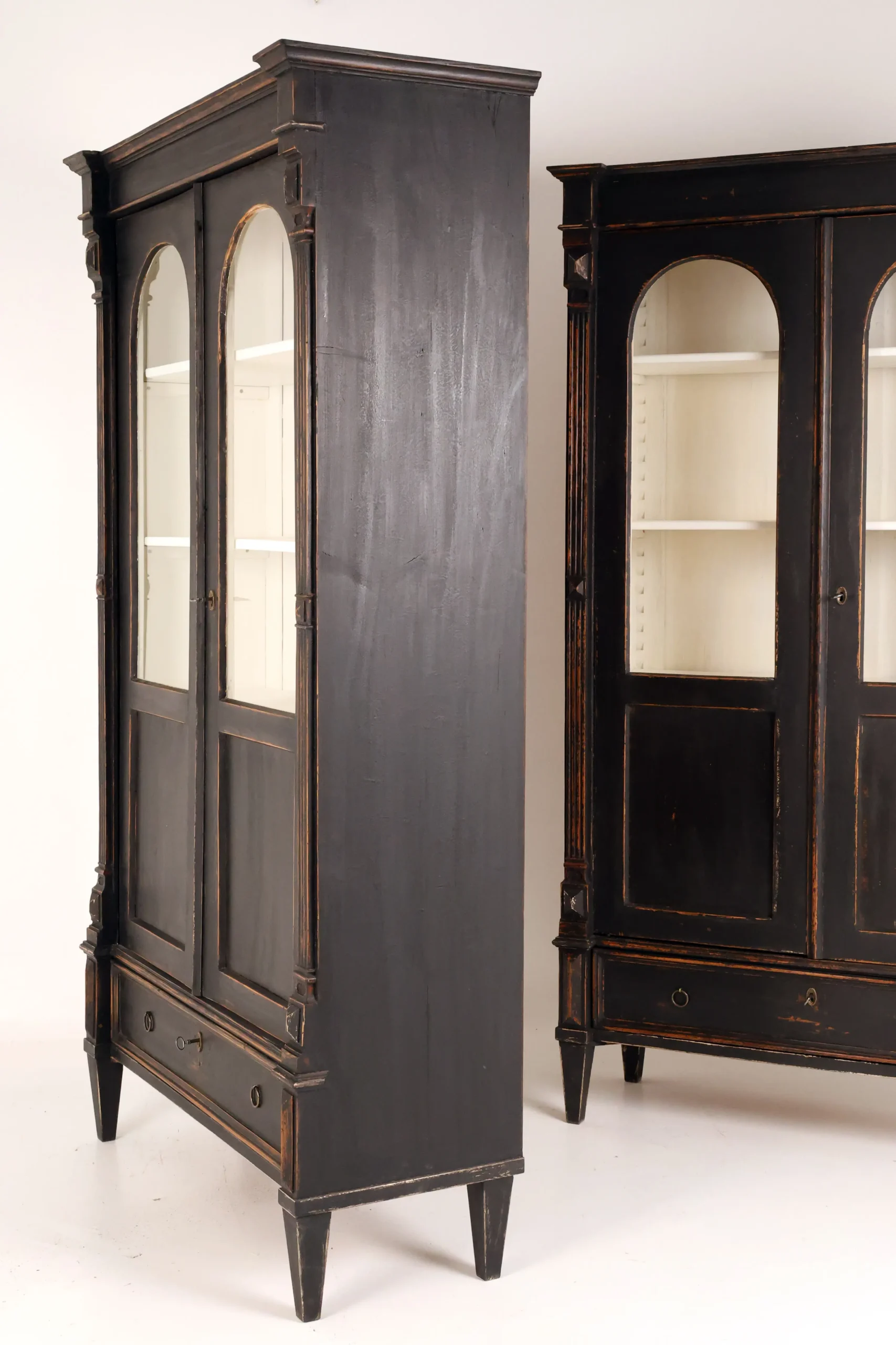 Each cabinet is framed by fluted pilasters with carved block capitals and bases, enclosing elegant arched glazed doors. The light-painted interiors are fitted with adjustable shelves, creating a refined contrast with the dark exterior and providing an ideal display environment for books, porcelain, or curated objects.