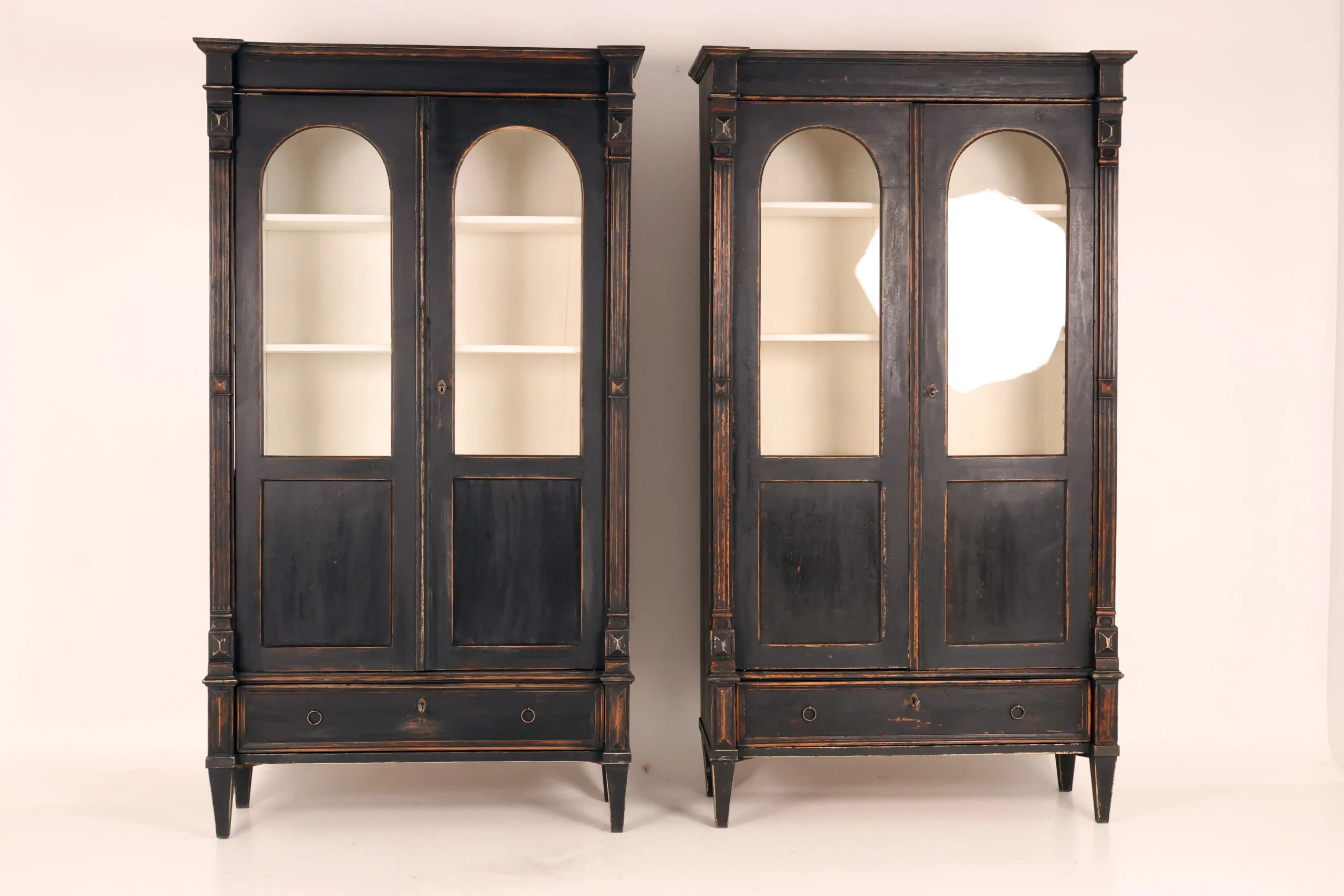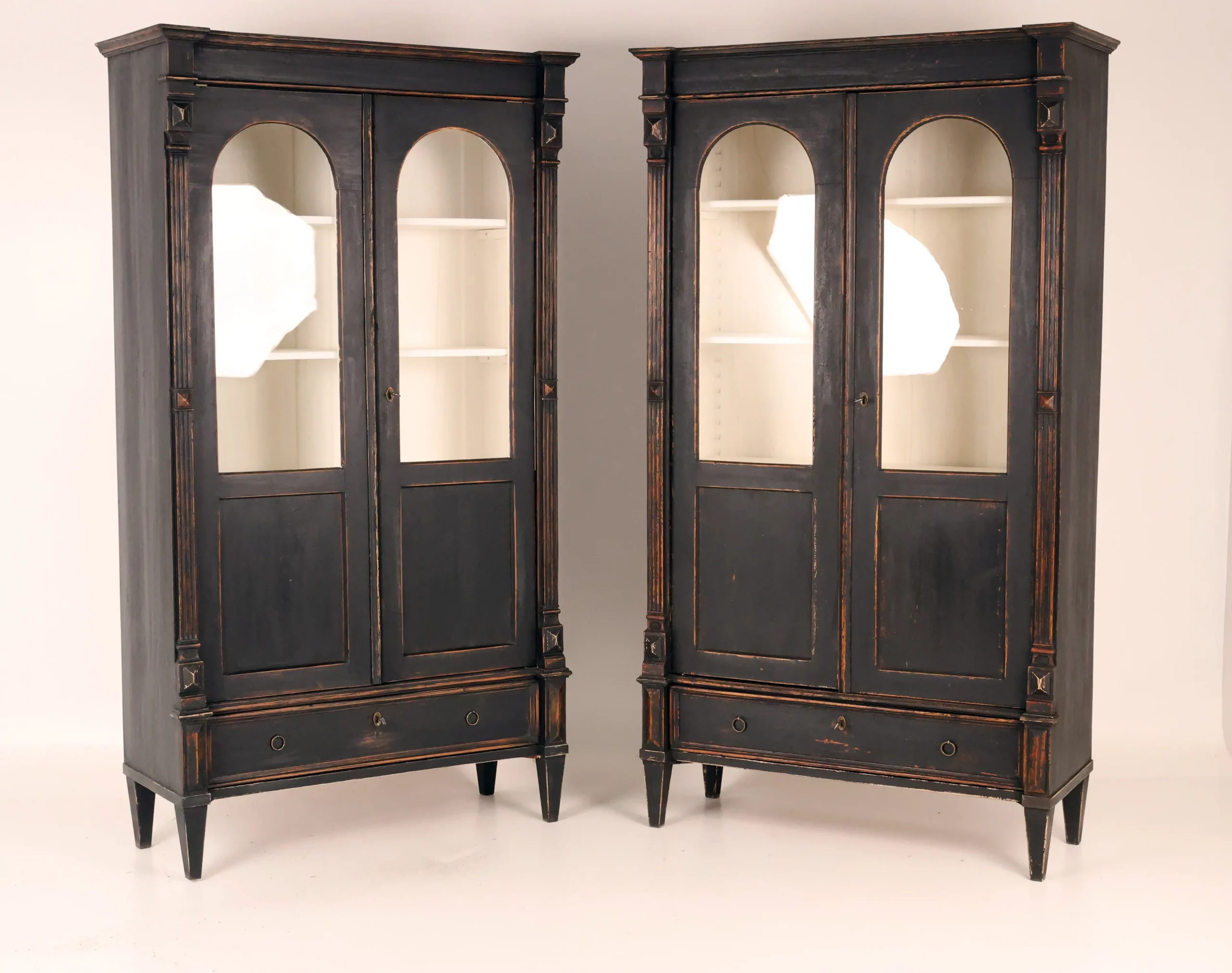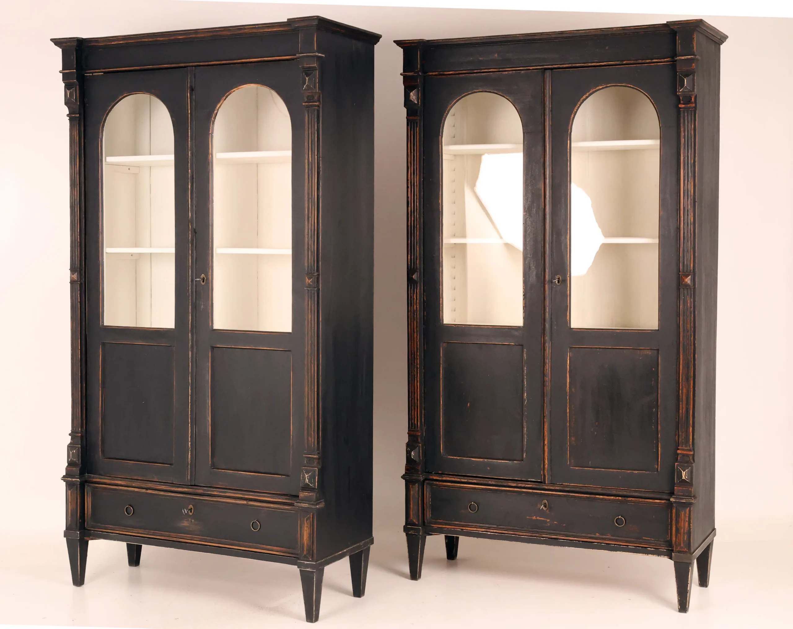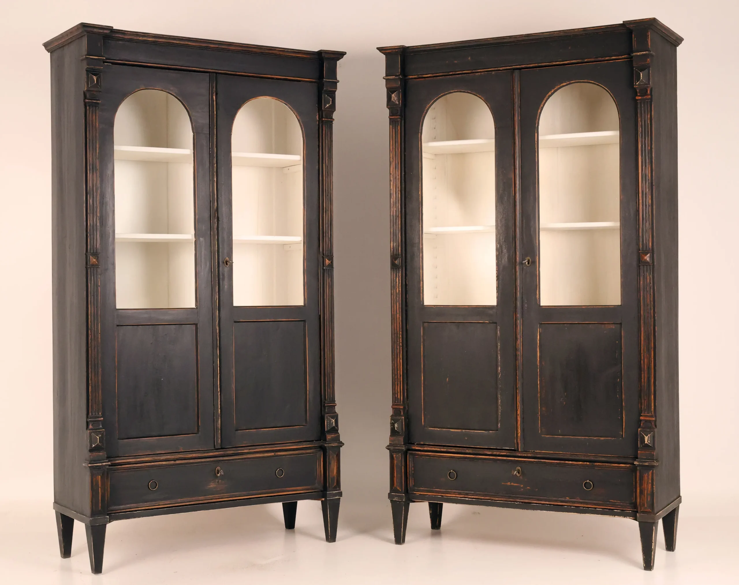Each cabinet is framed by fluted pilasters with carved block capitals and bases, enclosing elegant arched glazed doors. The light-painted interiors are fitted with adjustable shelves, creating a refined contrast with the dark exterior and providing an ideal display environment for books, porcelain, or curated objects.