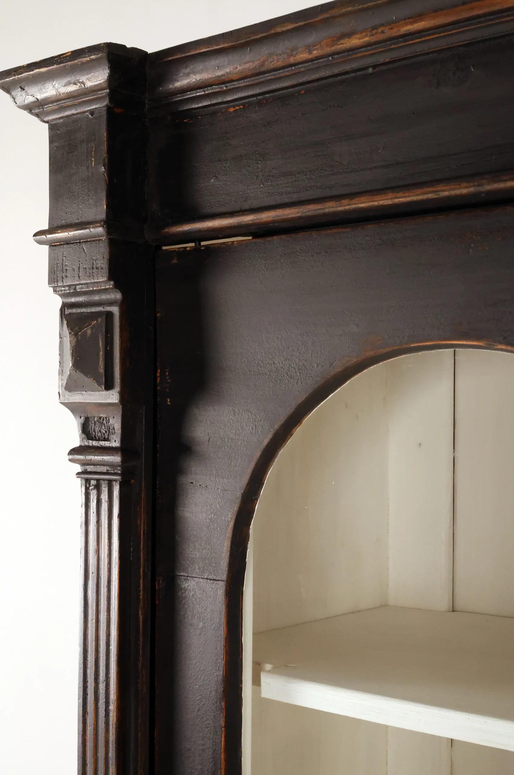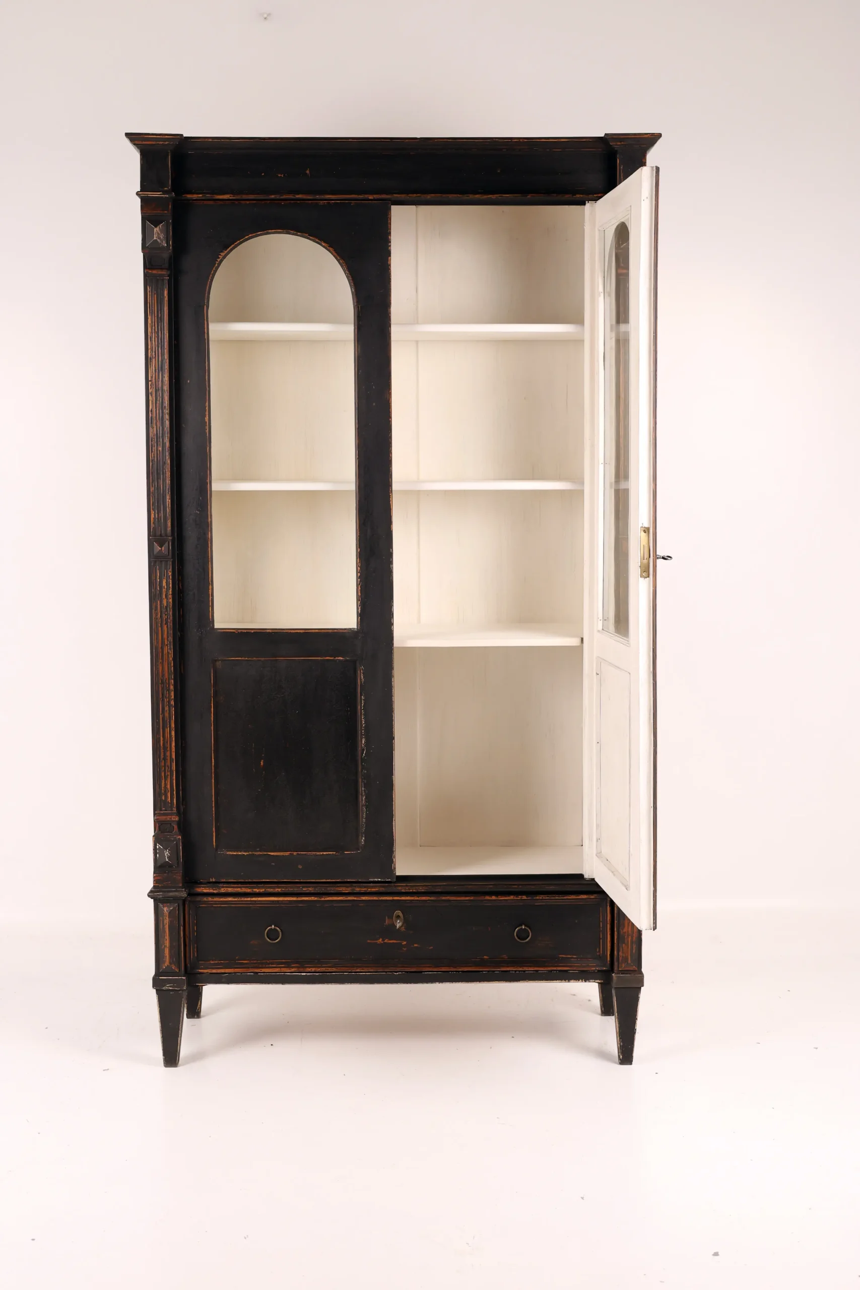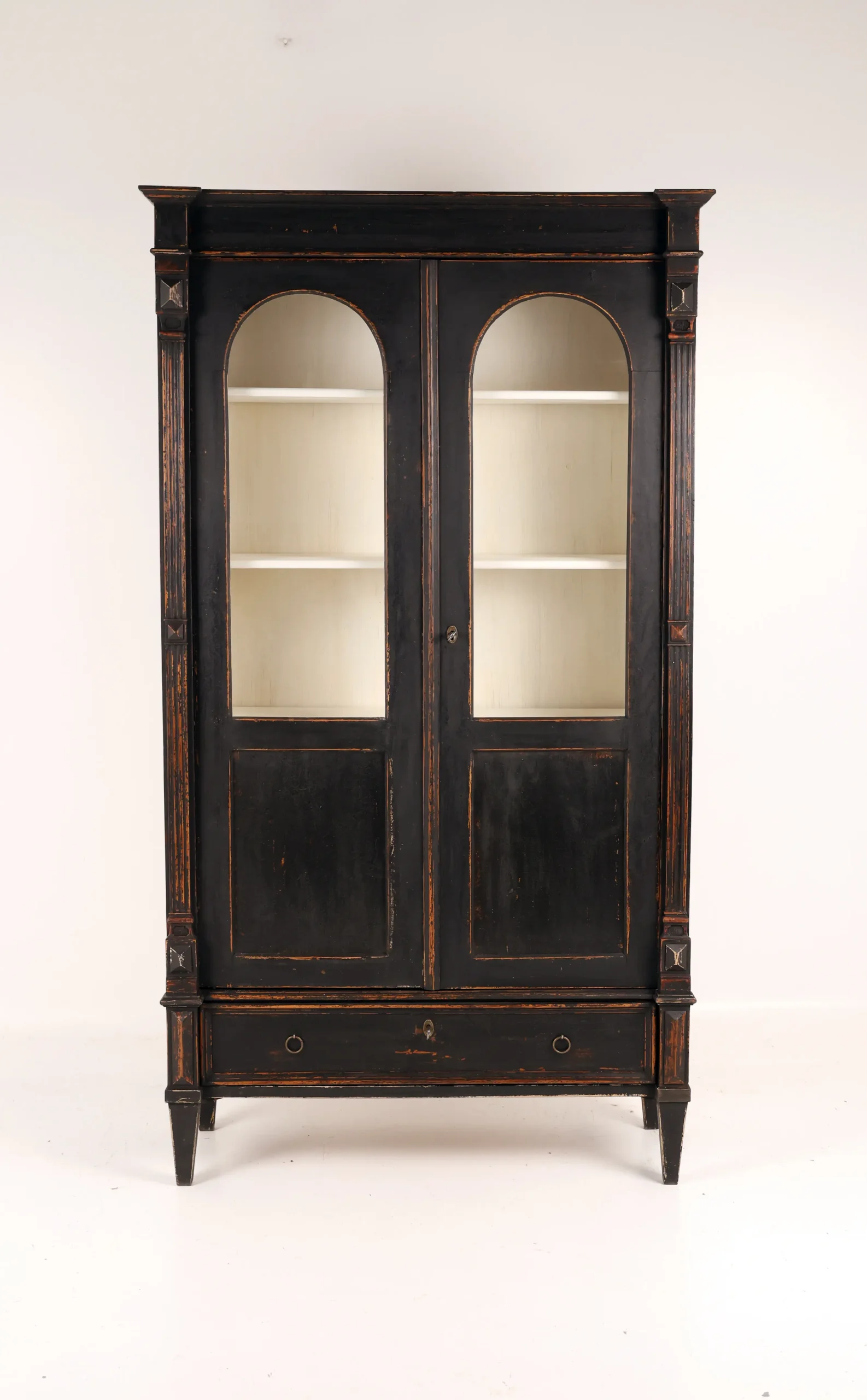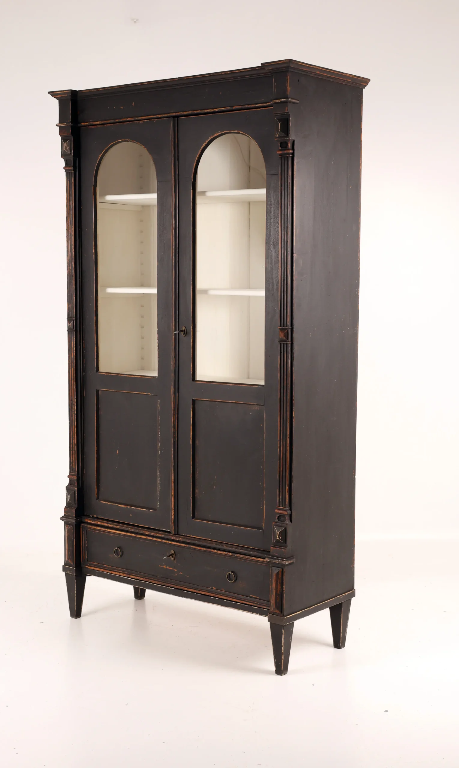 Each cabinet is framed by fluted pilasters with carved block capitals and bases, enclosing elegant arched glazed doors. The light-painted interiors are fitted with adjustable shelves, creating a refined contrast with the dark exterior and providing an ideal display environment for books, porcelain, or curated objects.