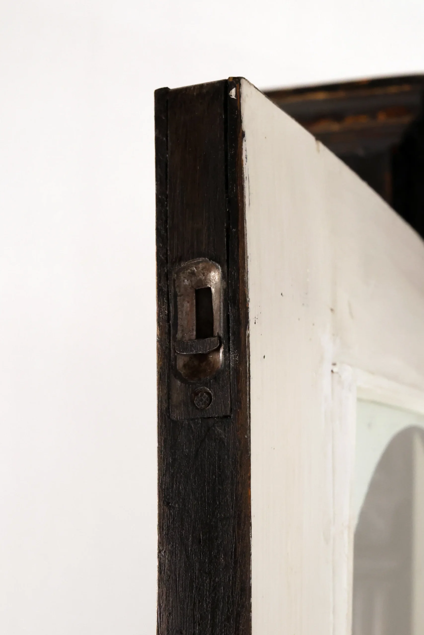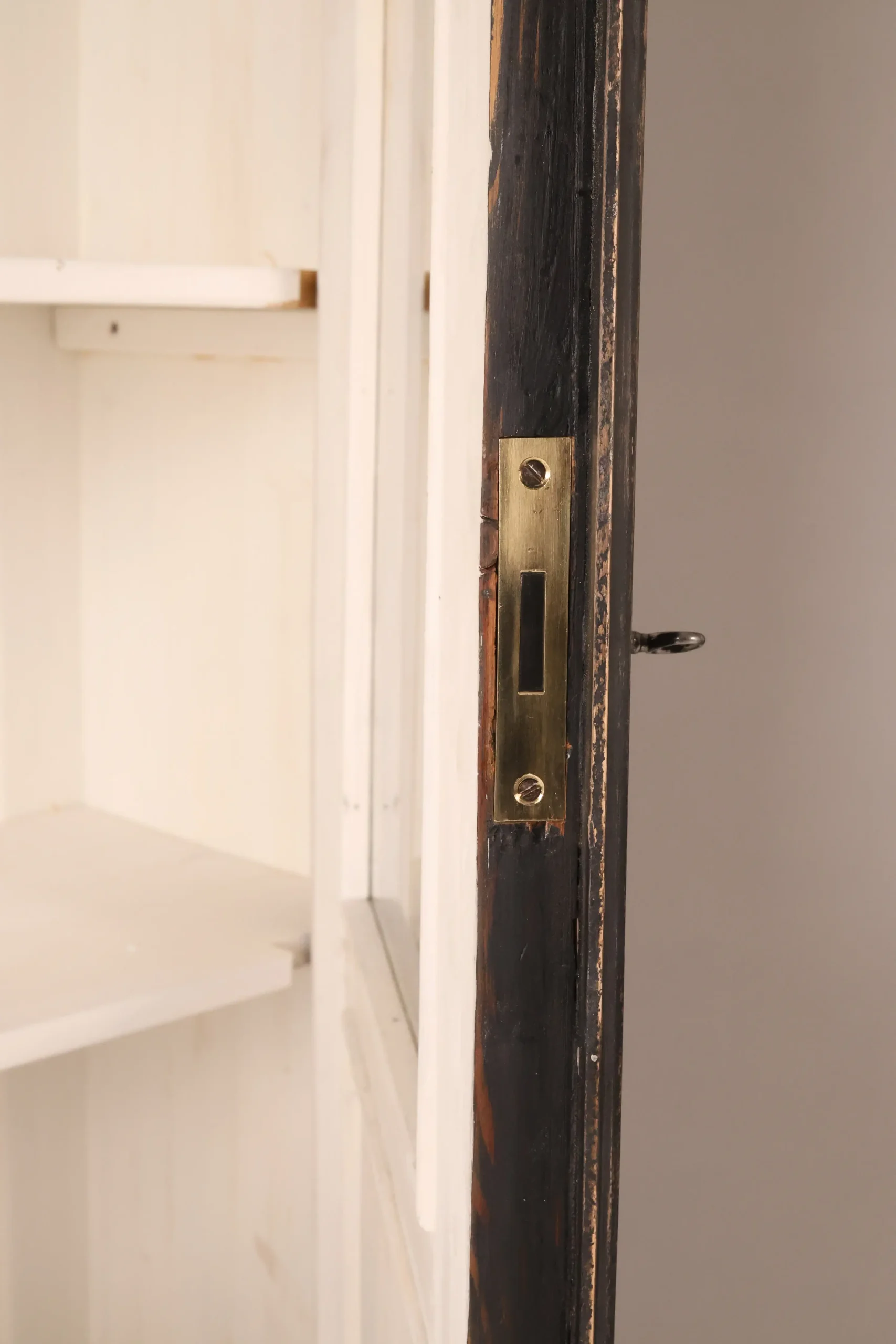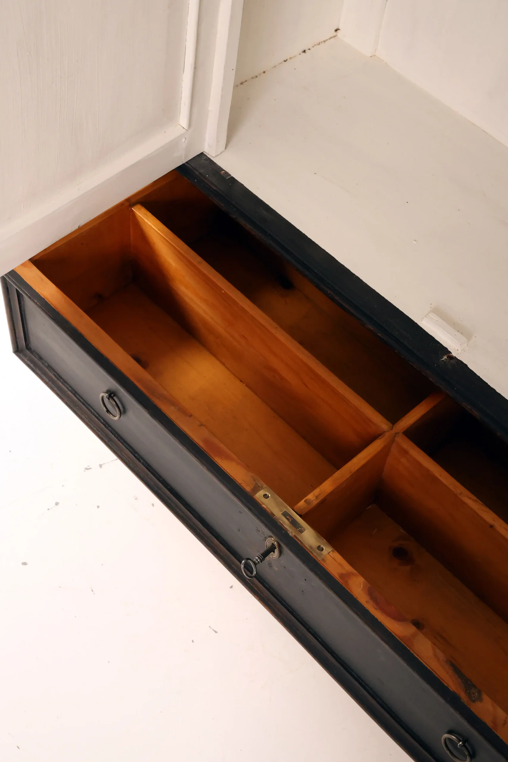 Crafted in solid pine, the cabinets are finished in a deep hand-painted ebonised surface. The layered application subtly reveals warm undertones along edges and mouldings, enhancing the sculptural articulation of the façades and giving the pair remarkable visual depth. The natural grain structure of the solid pine contributes to the authenticity and character of the finish.