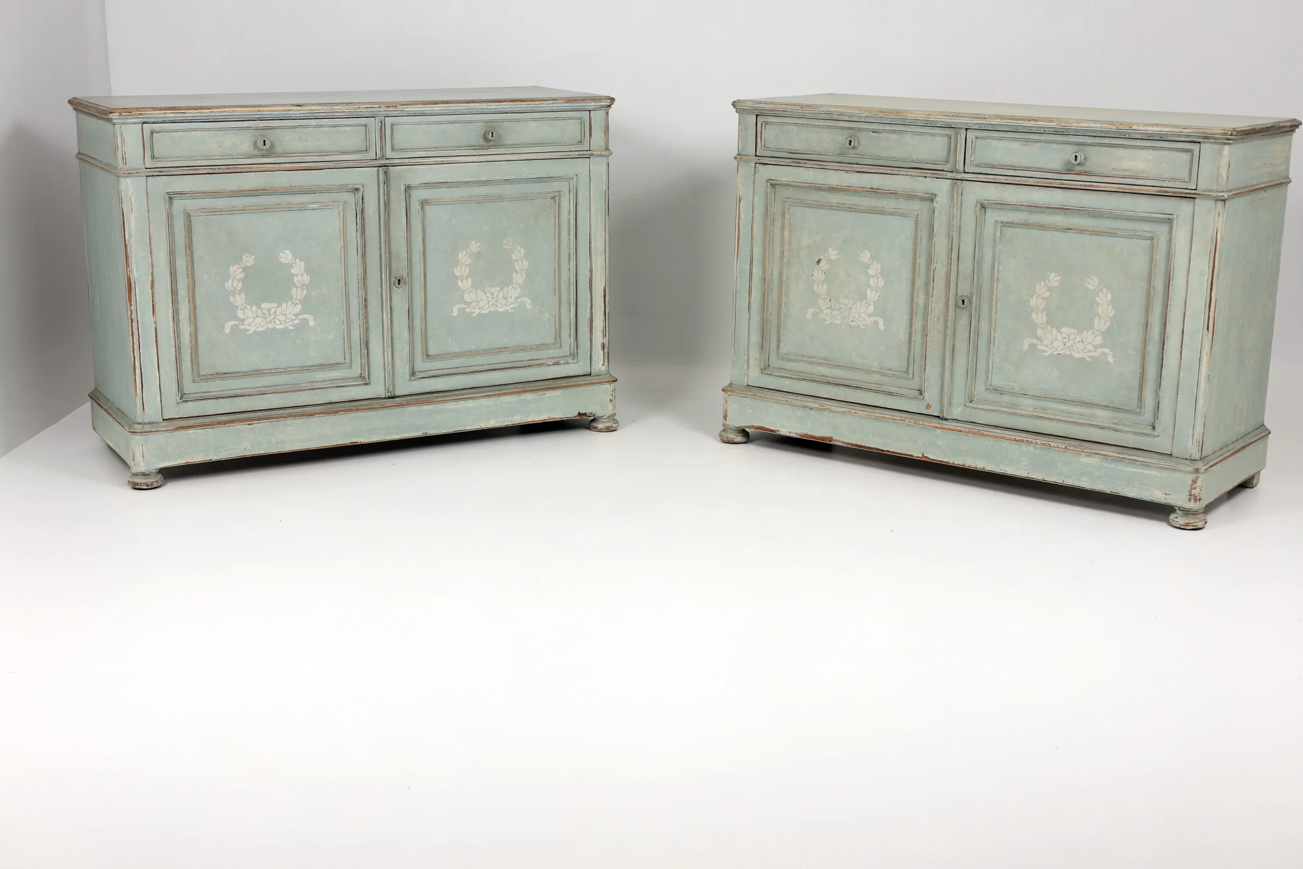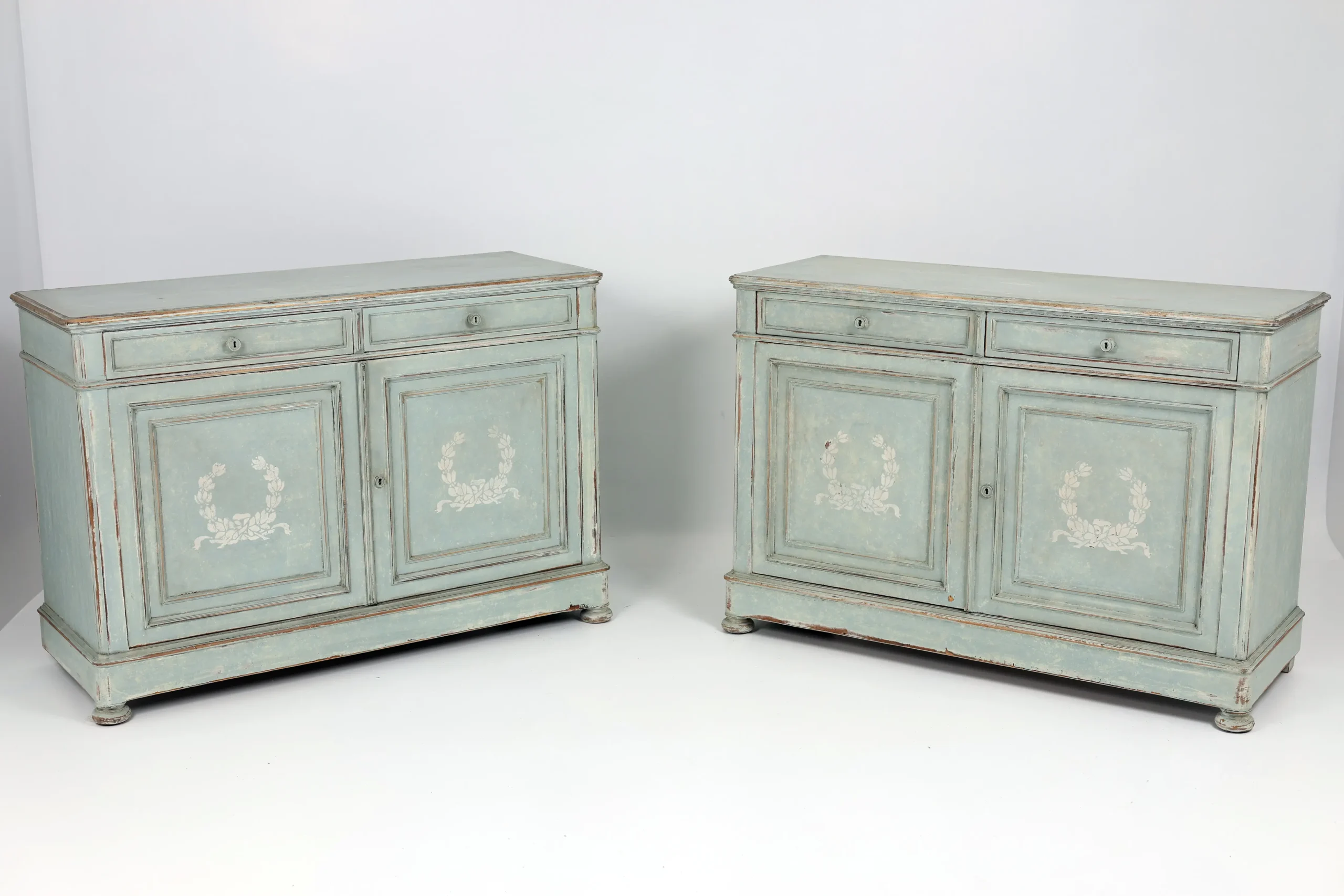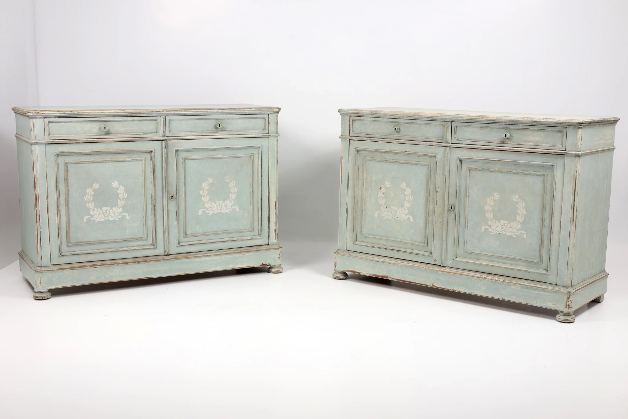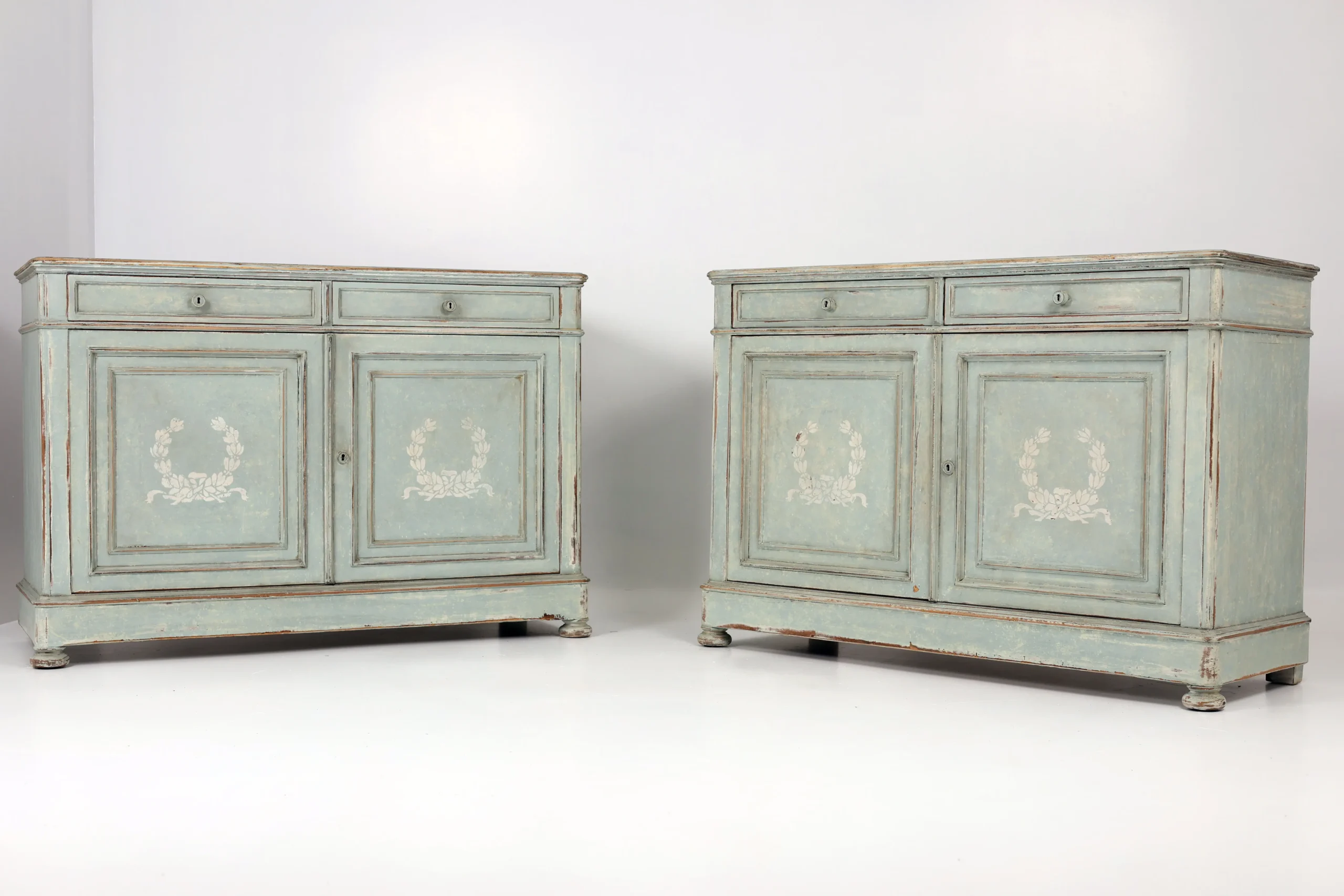 Each sideboard features two drawers above double doors framed with delicate mouldings. Both the drawers and doors are fitted with original working locks and keys. The surfaces are finished in a pale blue-grey tone with a beautifully aged patina that enhances their historical character. The decorative laurel wreath motifs on the front panels were carefully hand-painted, faithfully recreated based on preserved fragments of the original painting, restoring the furniture’s authentic charm and stylistic coherence.