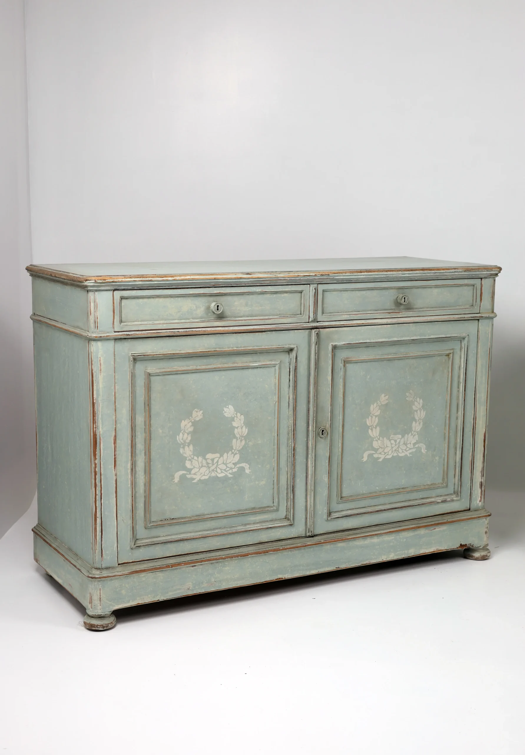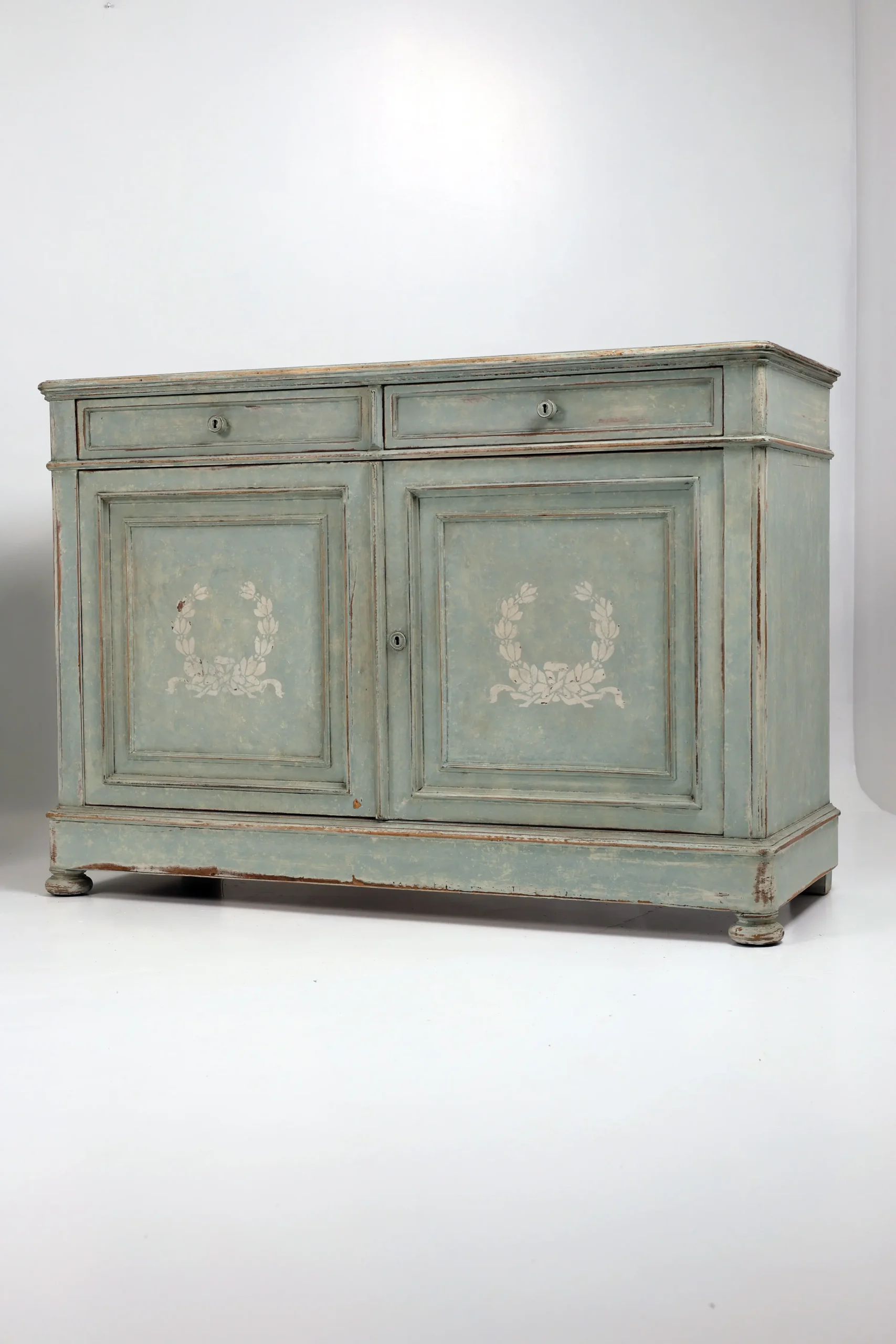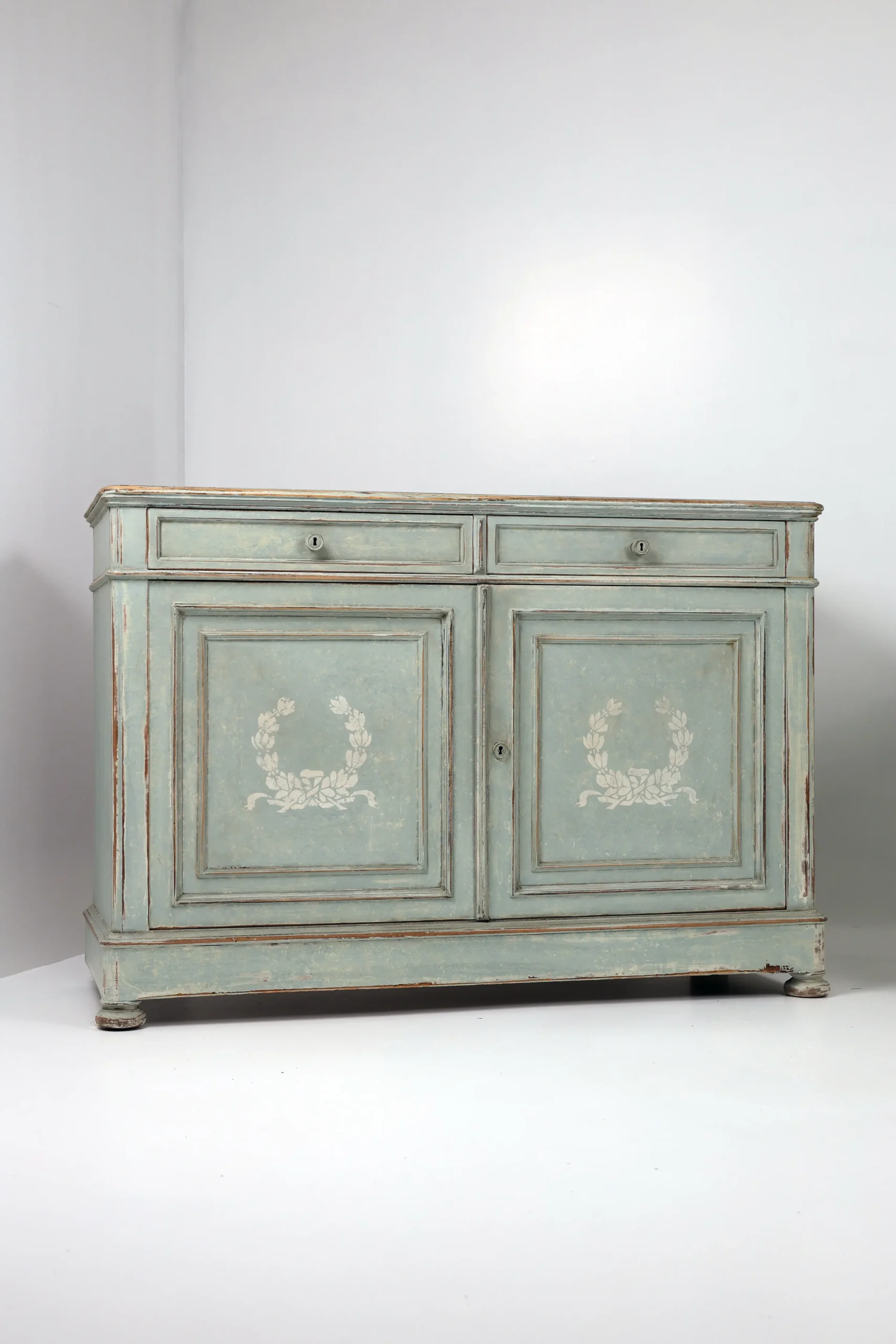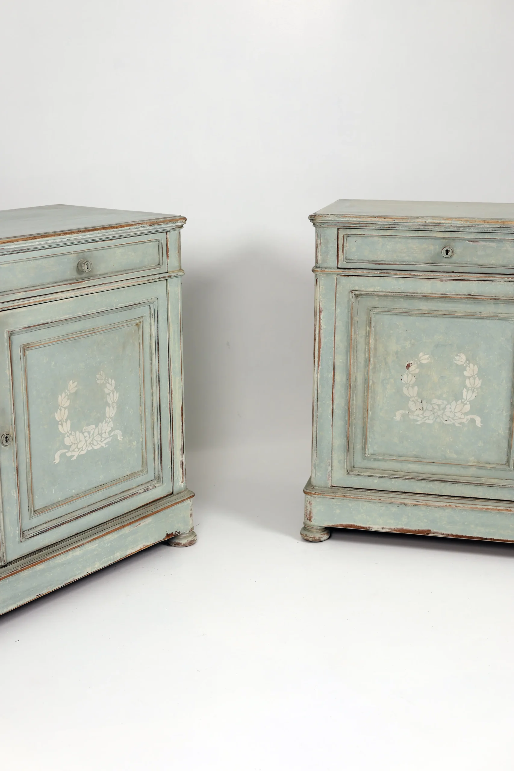 Each sideboard features two drawers above double doors framed with delicate mouldings. Both the drawers and doors are fitted with original working locks and keys. The surfaces are finished in a pale blue-grey tone with a beautifully aged patina that enhances their historical character. The decorative laurel wreath motifs on the front panels were carefully hand-painted, faithfully recreated based on preserved fragments of the original painting, restoring the furniture’s authentic charm and stylistic coherence.