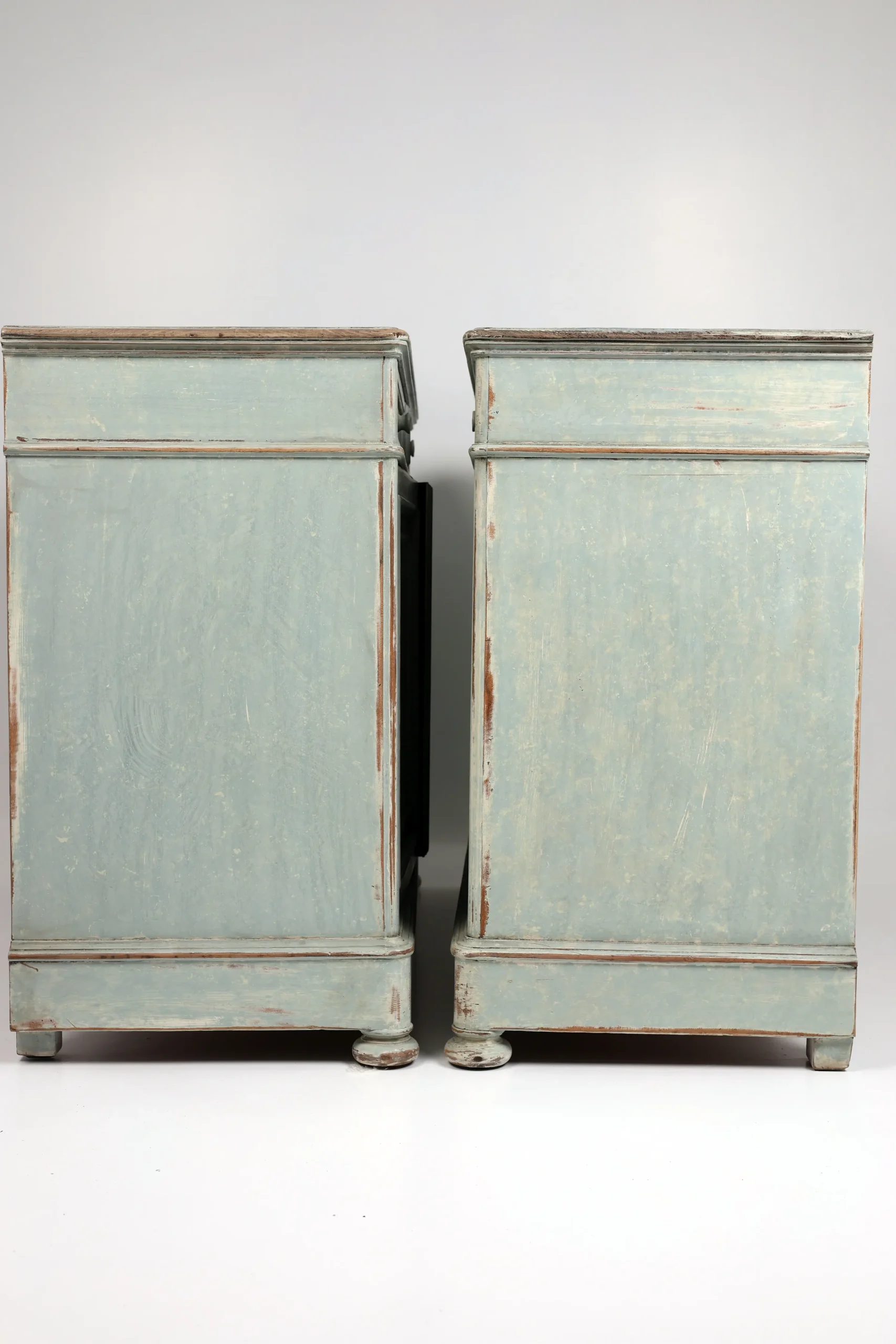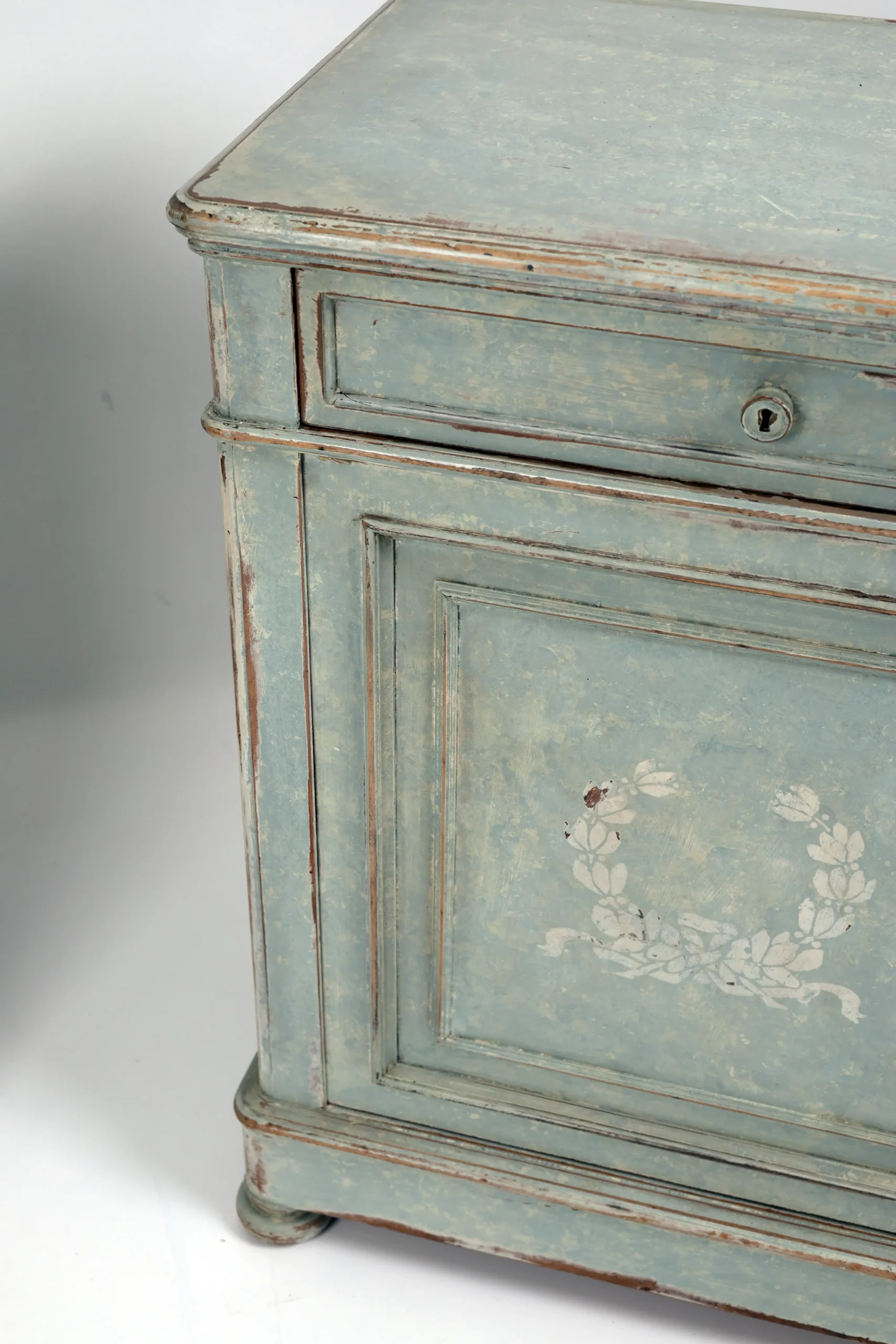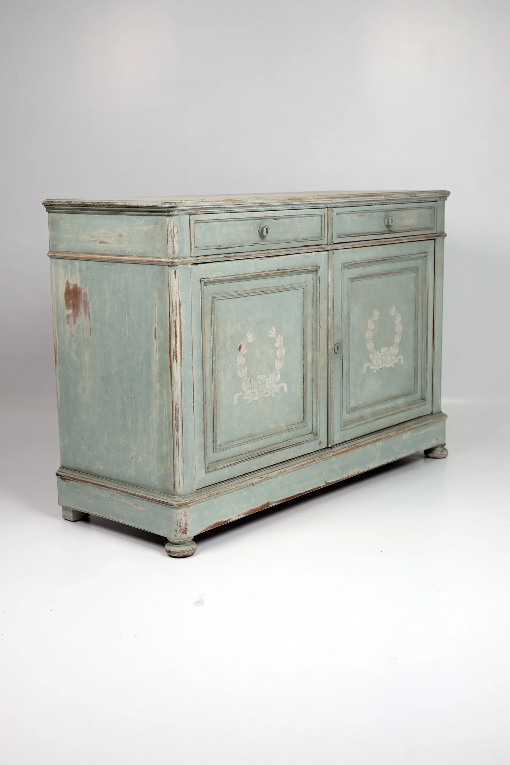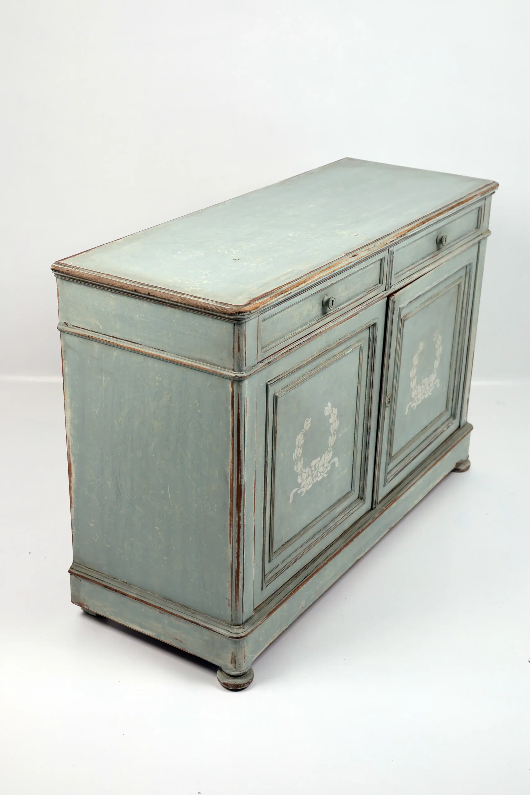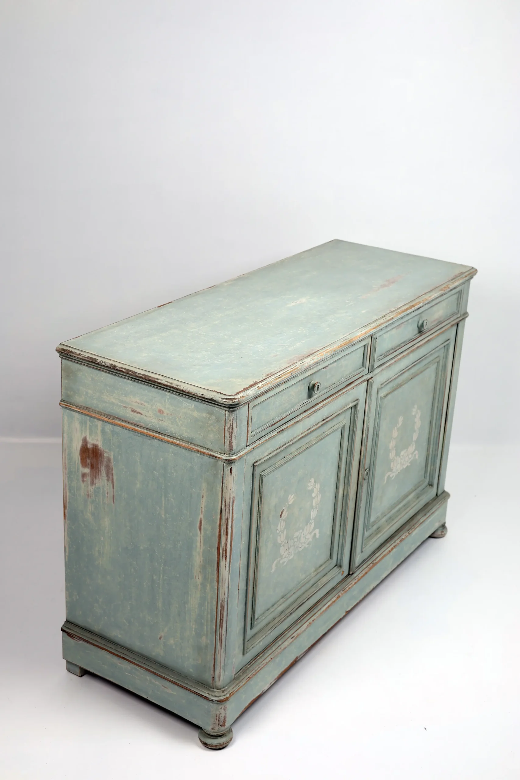 Each sideboard features two drawers above double doors framed with delicate mouldings. Both the drawers and doors are fitted with original working locks and keys. The surfaces are finished in a pale blue-grey tone with a beautifully aged patina that enhances their historical character. The decorative laurel wreath motifs on the front panels were carefully hand-painted, faithfully recreated based on preserved fragments of the original painting, restoring the furniture’s authentic charm and stylistic coherence.