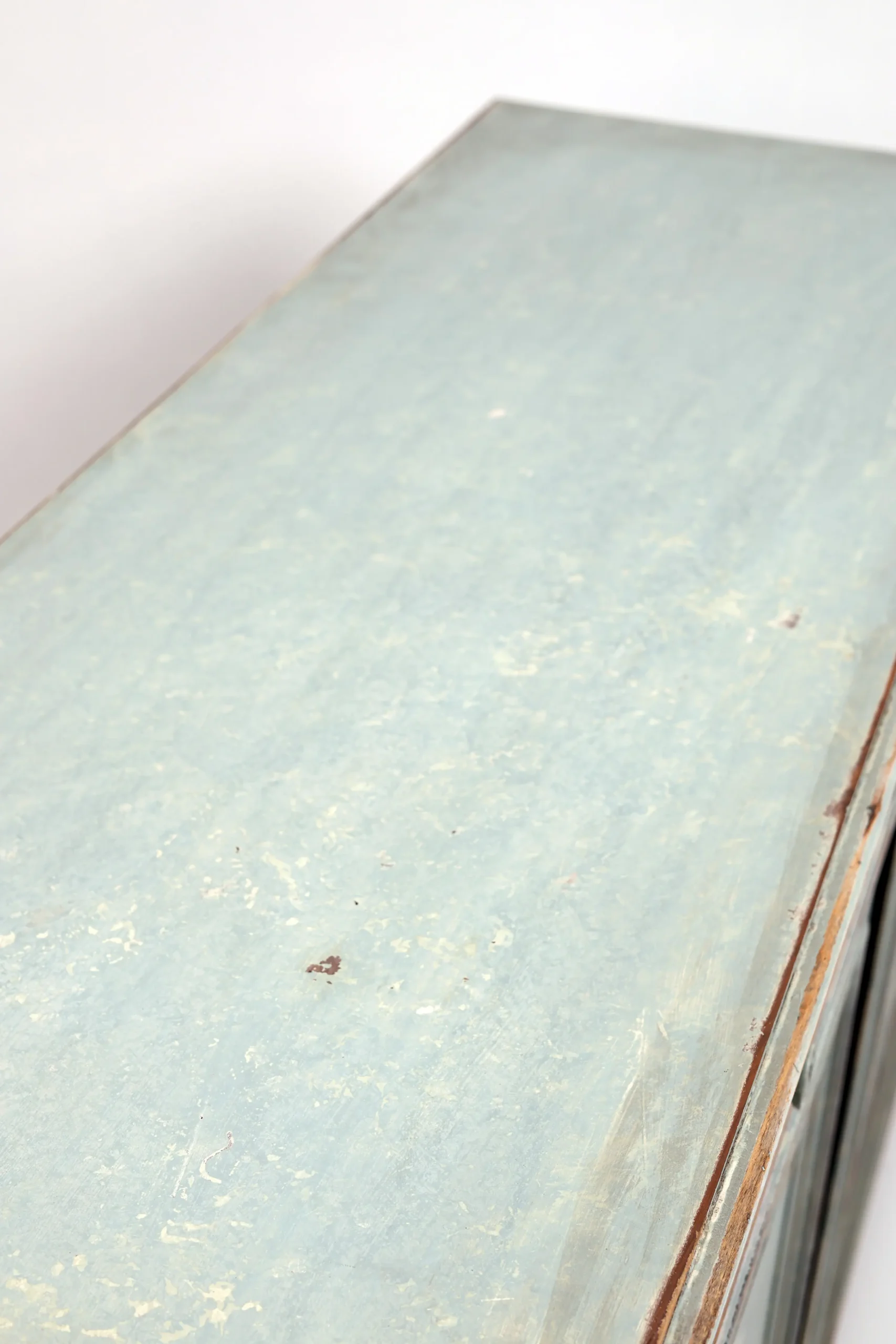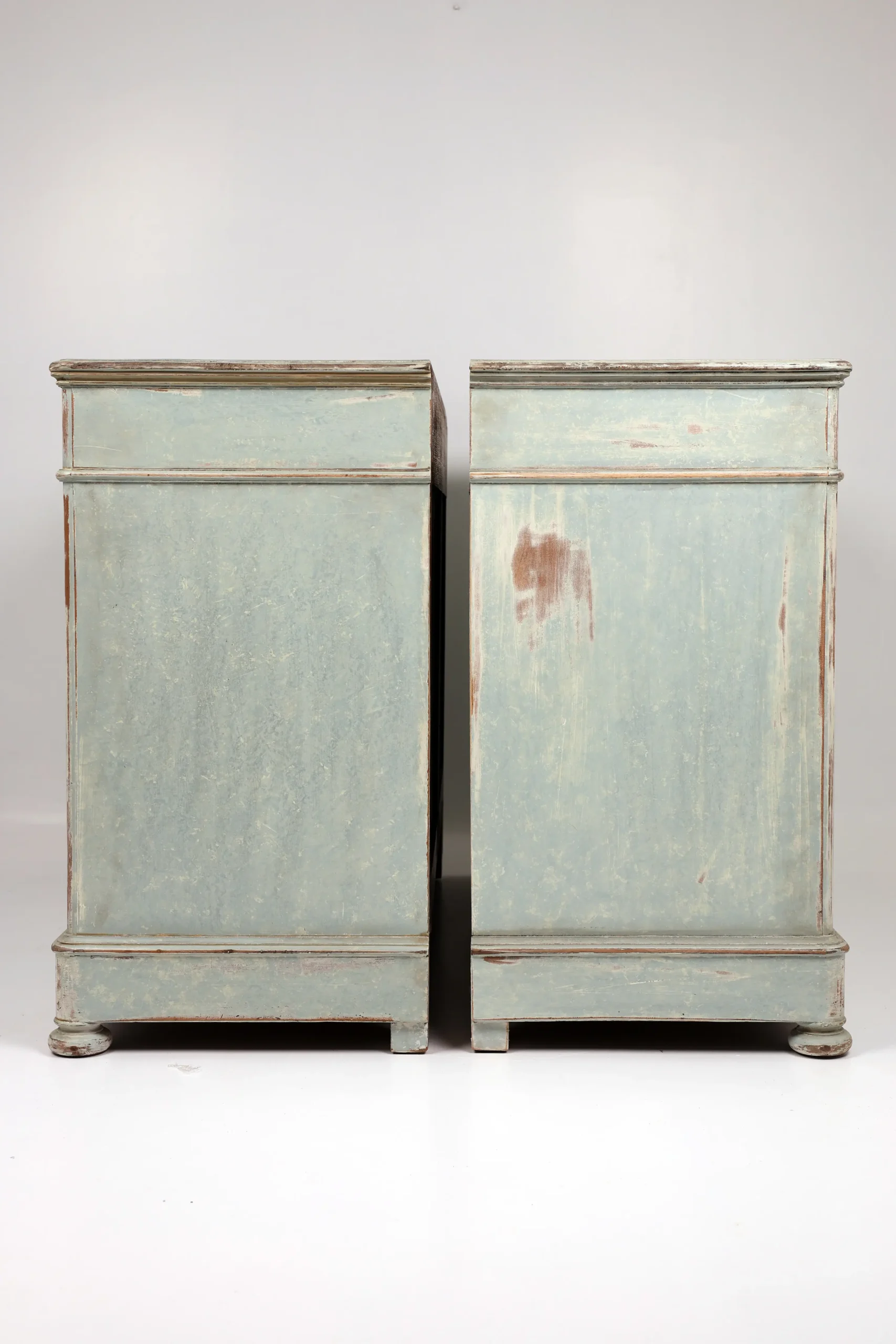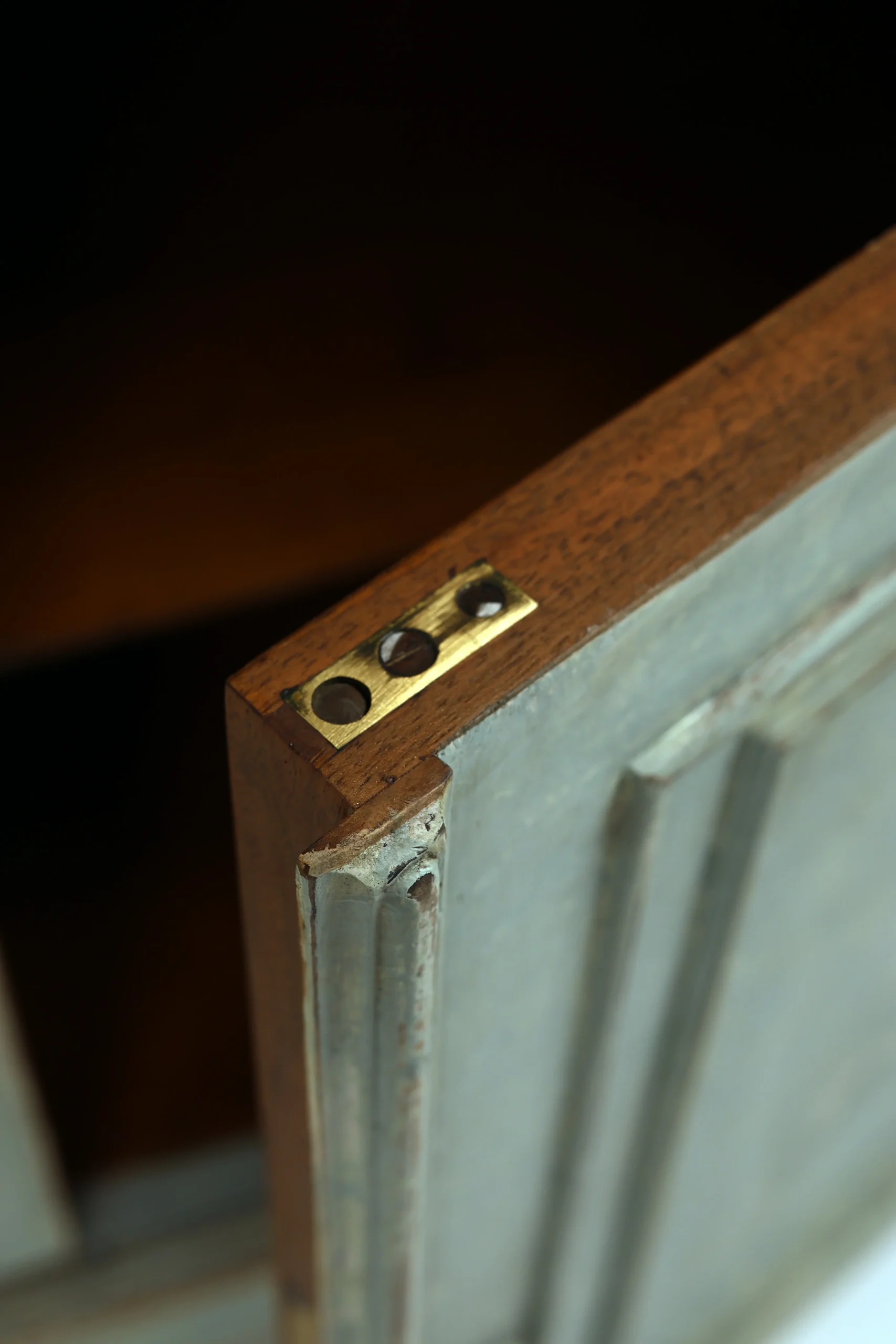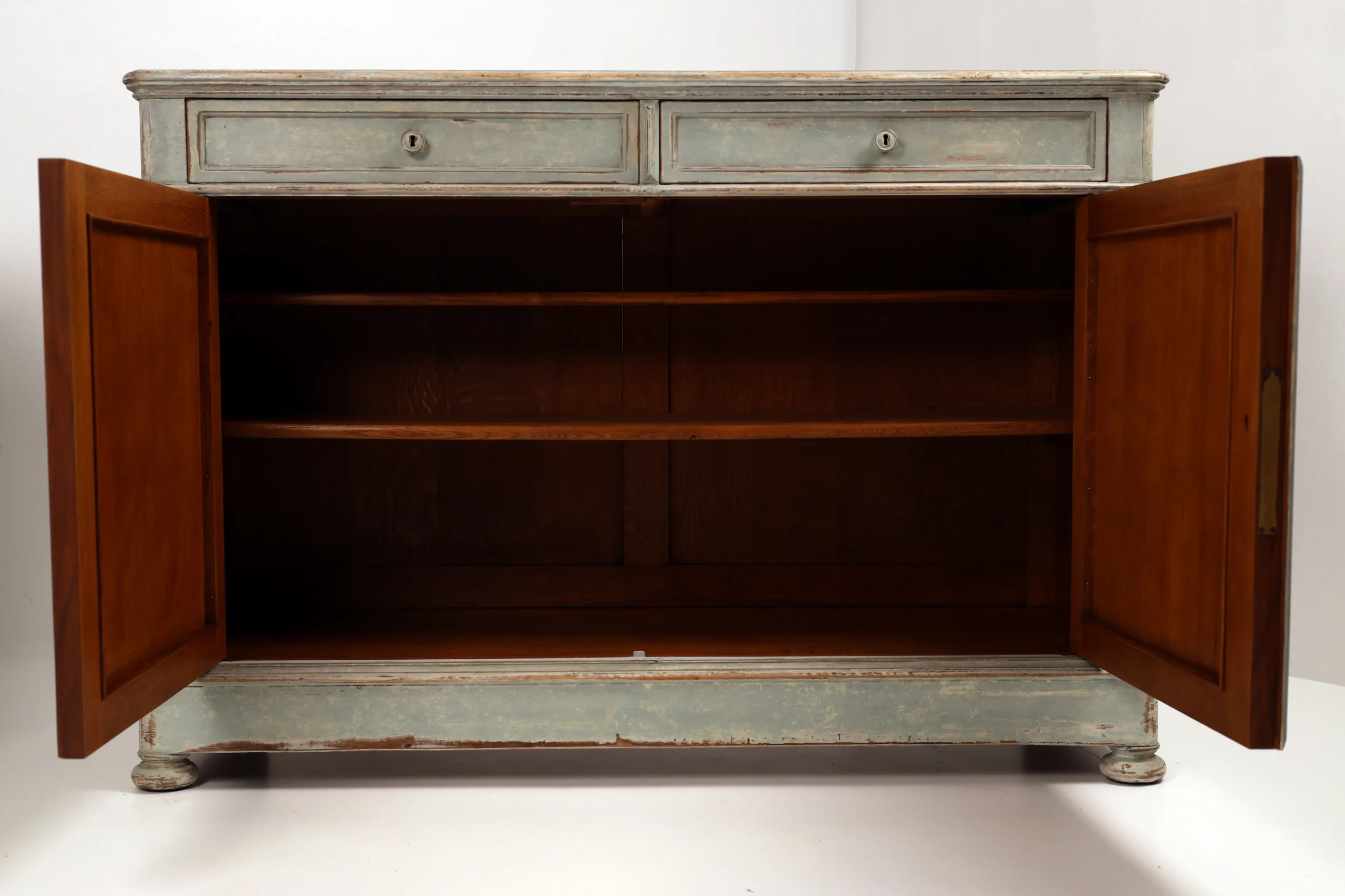 Each sideboard features two drawers above double doors framed with delicate mouldings. Both the drawers and doors are fitted with original working locks and keys. The surfaces are finished in a pale blue-grey tone with a beautifully aged patina that enhances their historical character. The decorative laurel wreath motifs on the front panels were carefully hand-painted, faithfully recreated based on preserved fragments of the original painting, restoring the furniture’s authentic charm and stylistic coherence.