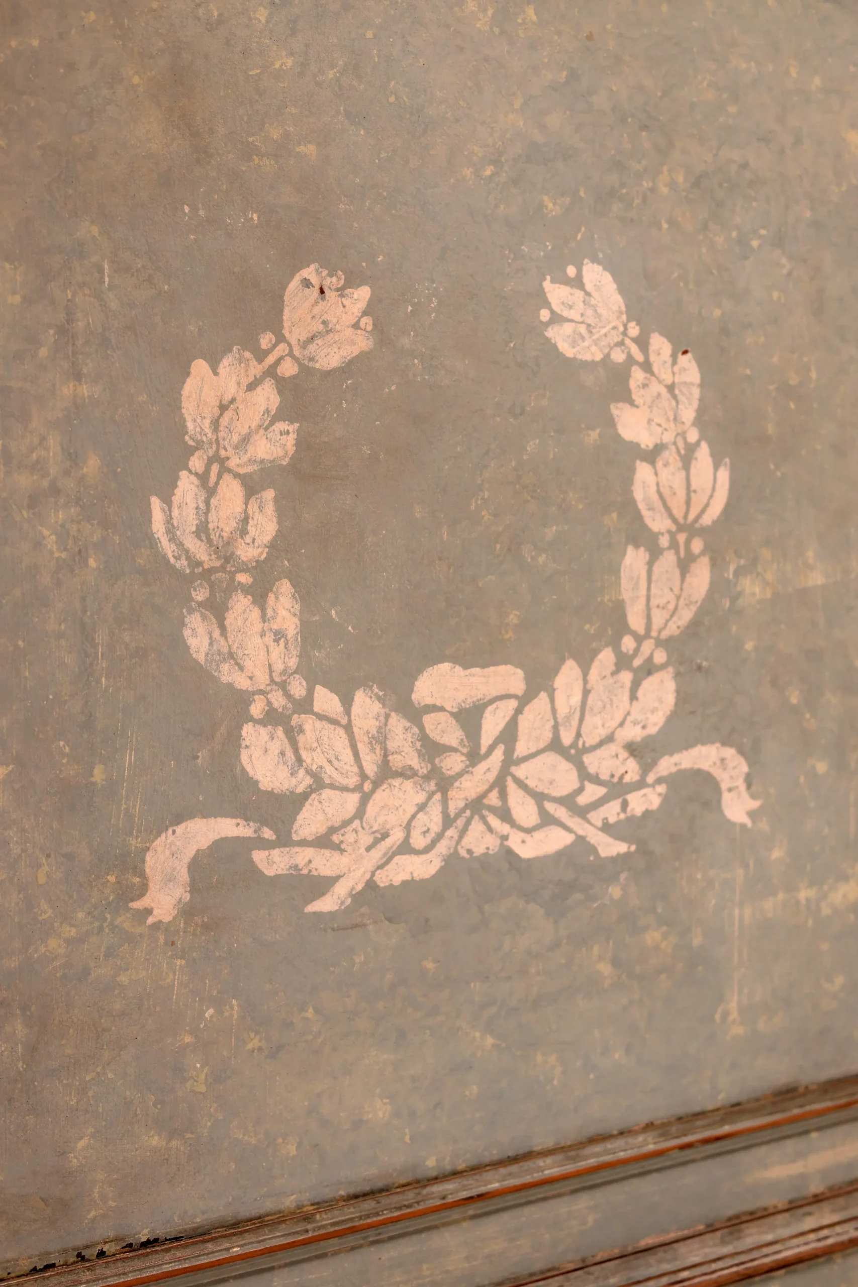 Finish: Pale blue-grey patina with hand-painted laurel wreaths (recreated from original painting fragments)
